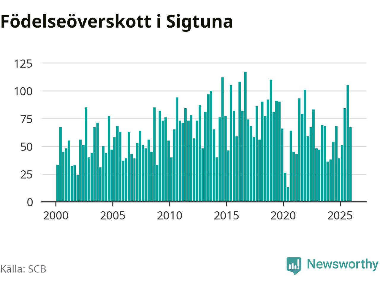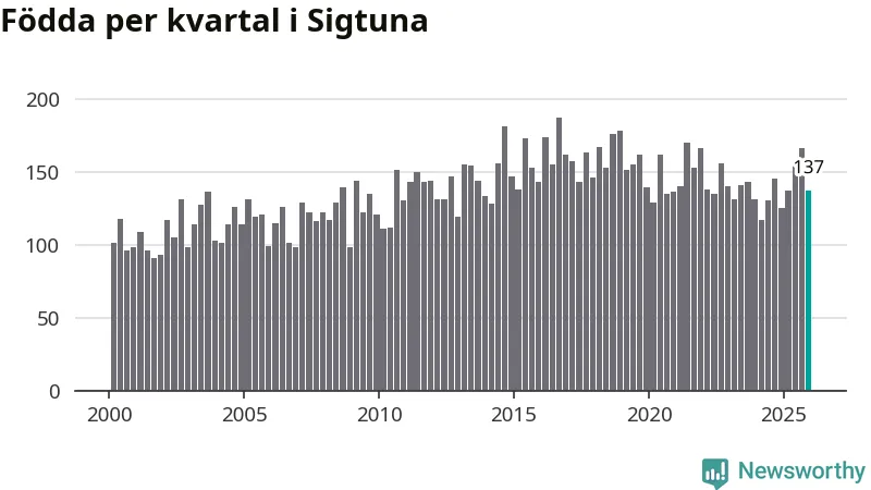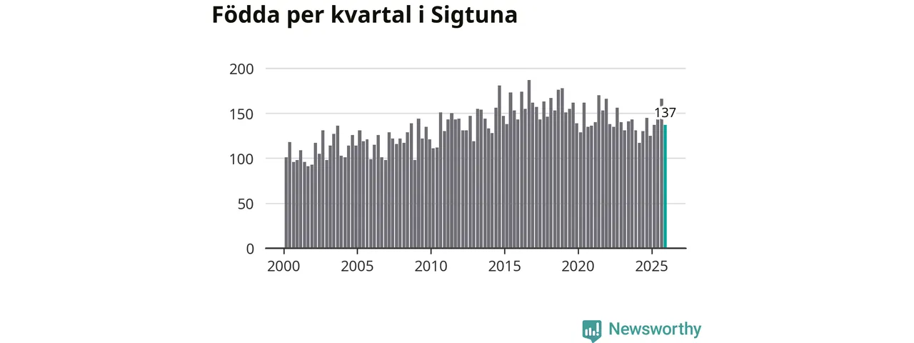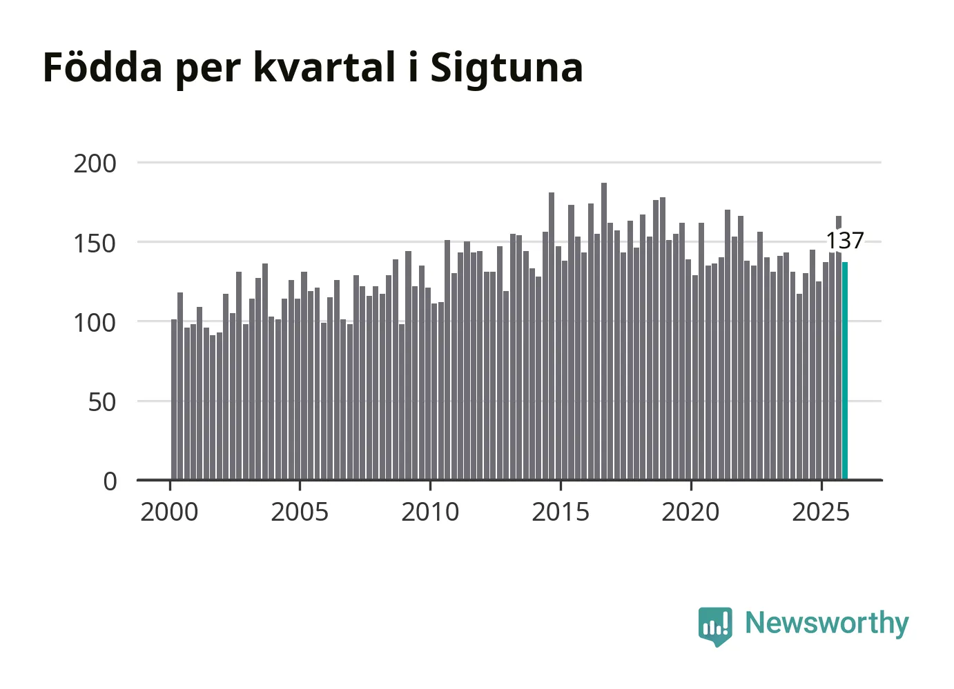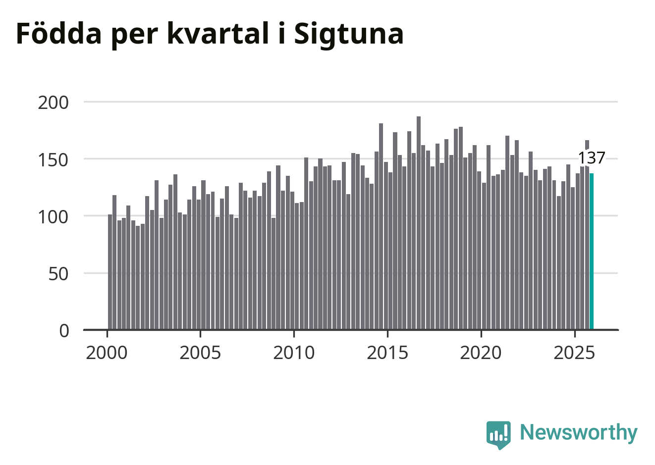 Enligt SCB:s siffror föddes 137 barn i Sigtuna under det senaste kvartalet. Samtidigt avled 70 personer. Sigtuna hade alltså ett positivt födelsenetto, vilket kommunen historiskt sett i princip alltid har haft.