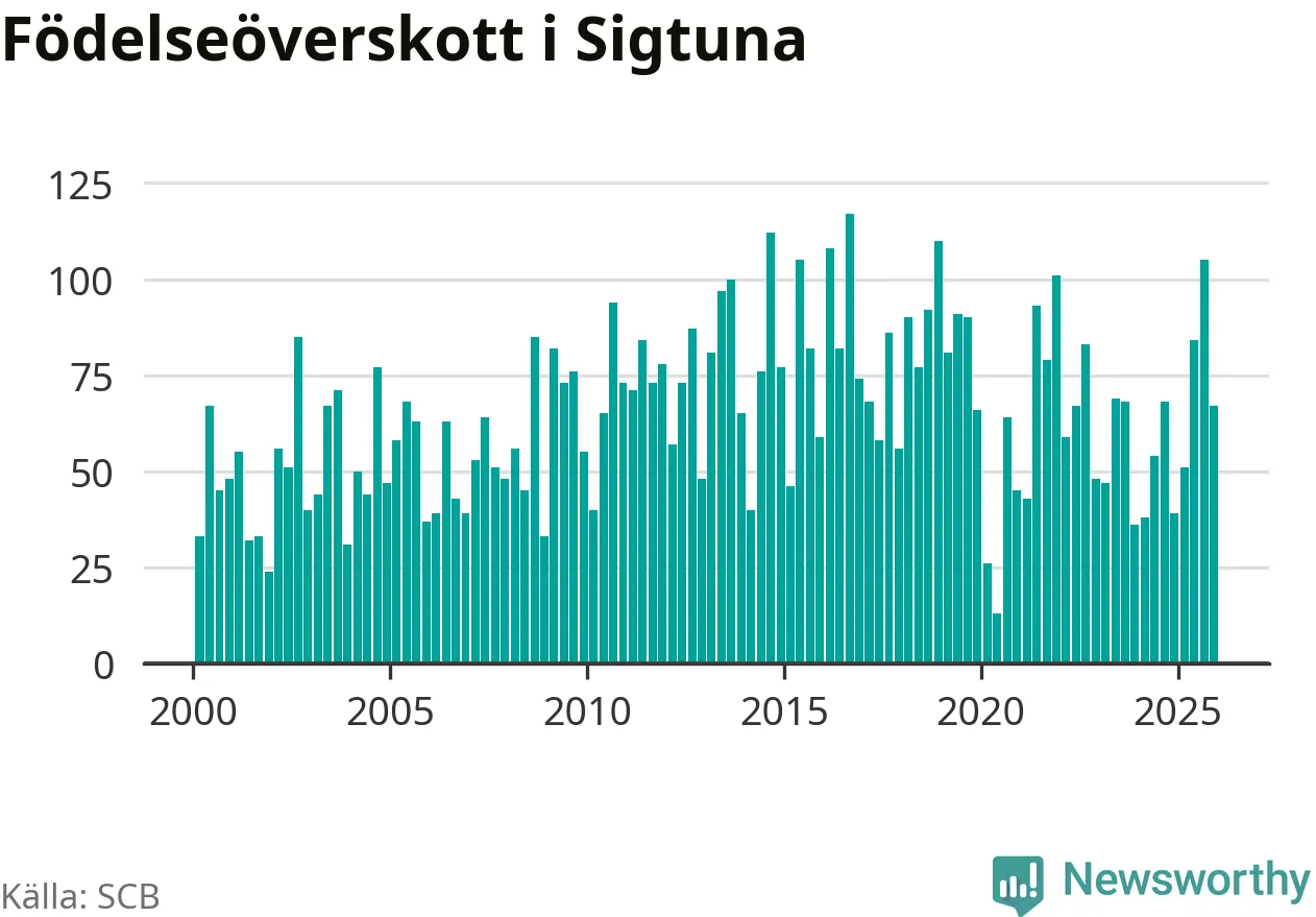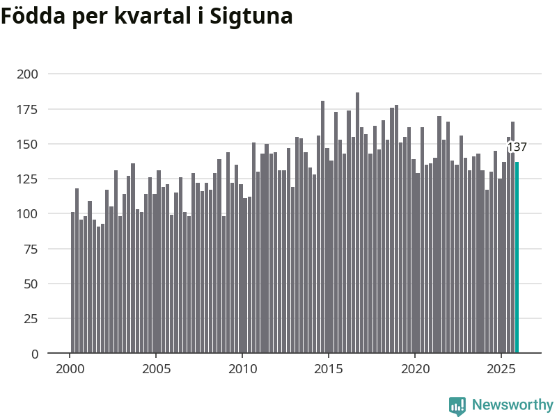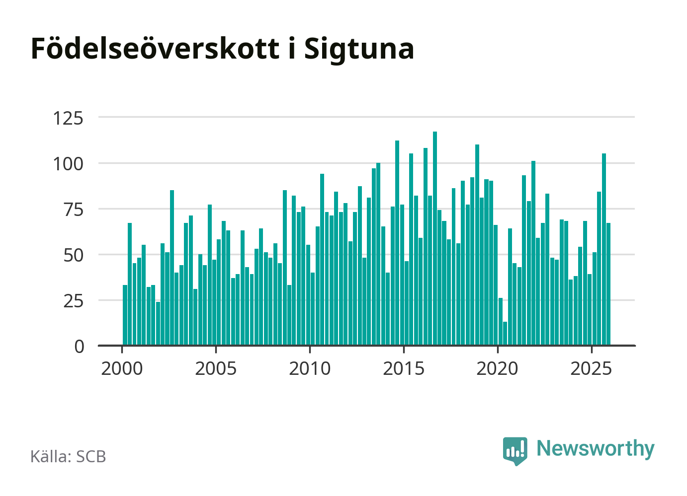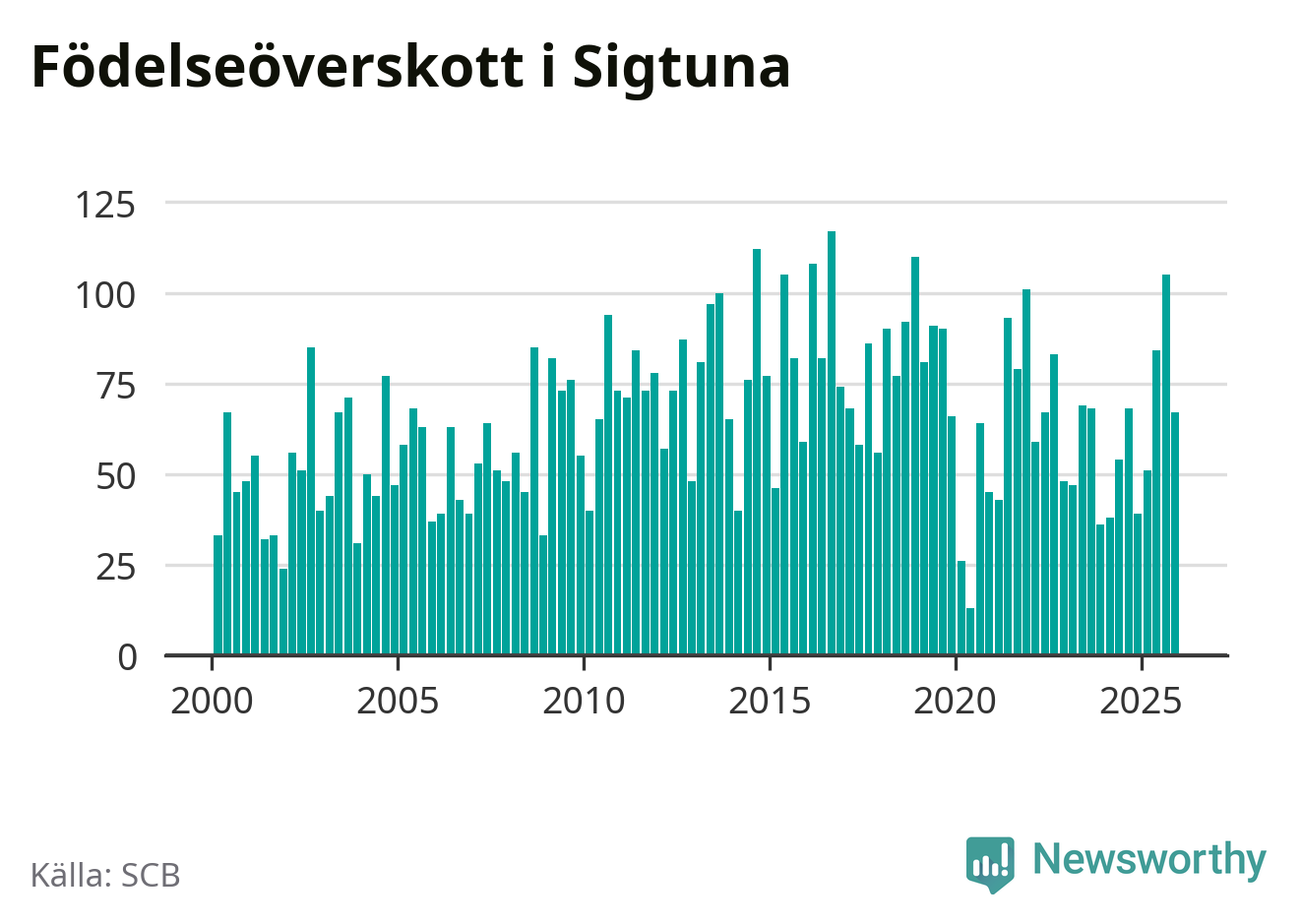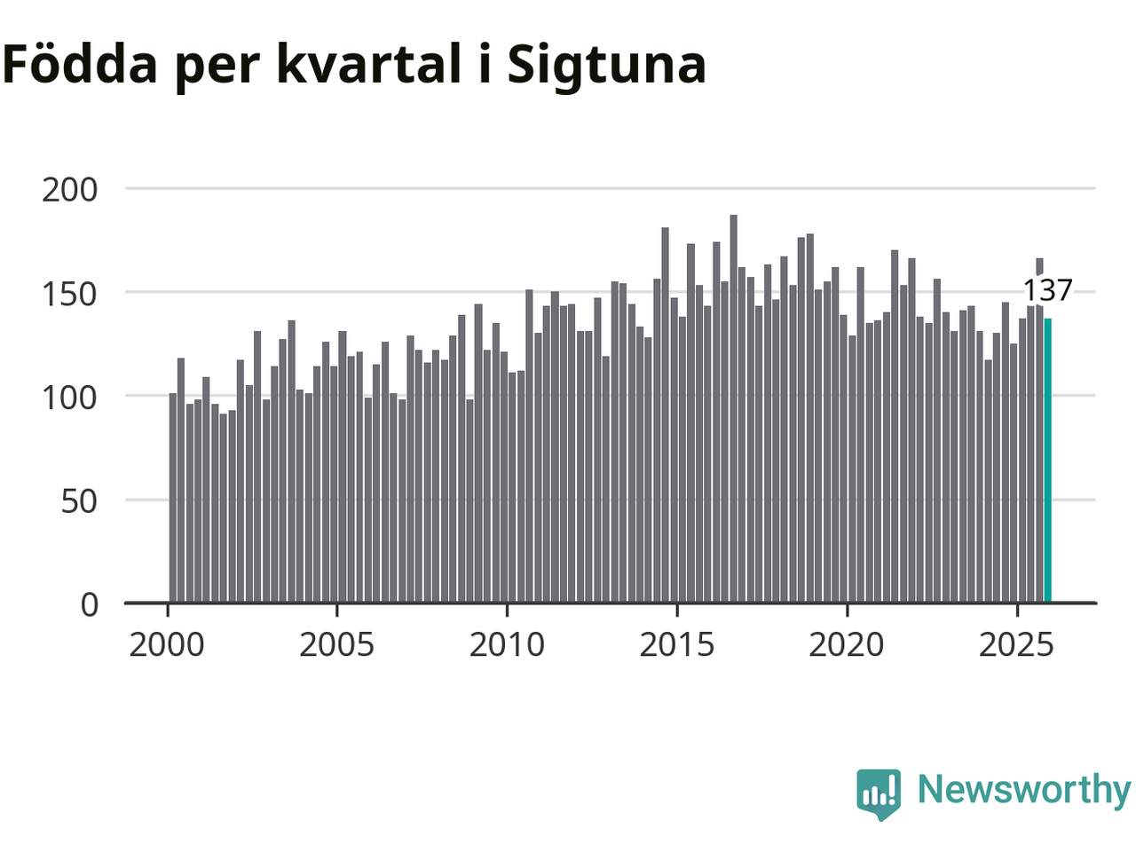 Enligt SCB:s siffror föddes 137 barn i Sigtuna under det senaste kvartalet. Samtidigt avled 70 personer. Sigtuna hade alltså ett positivt födelsenetto, vilket kommunen historiskt sett i princip alltid har haft.