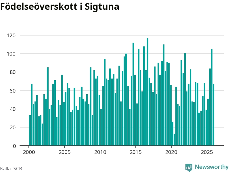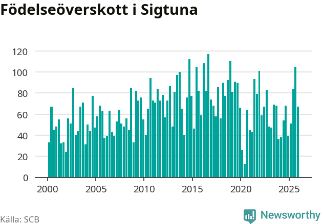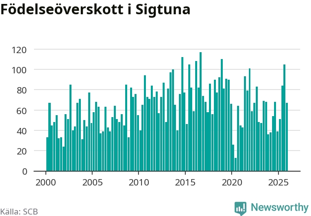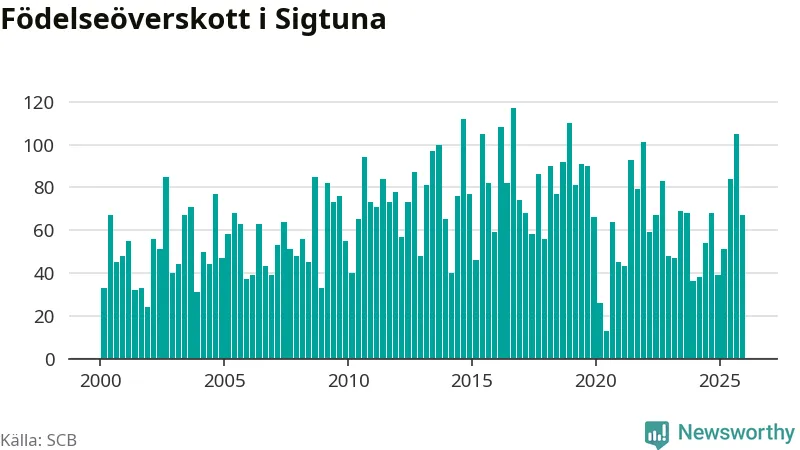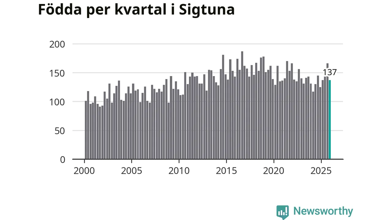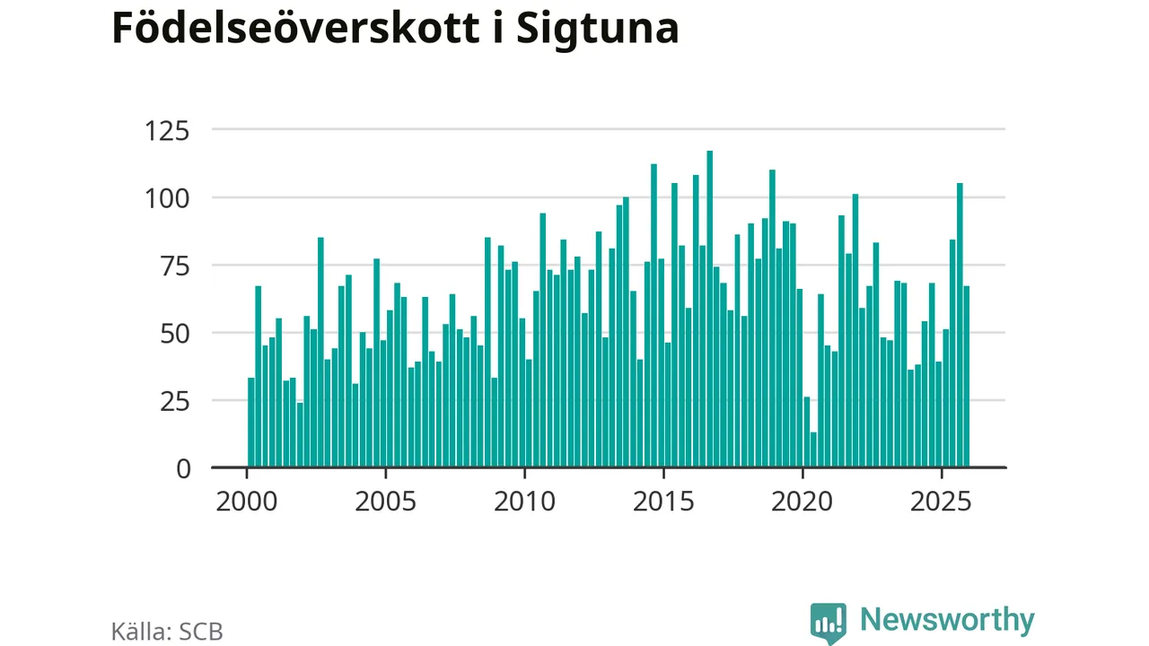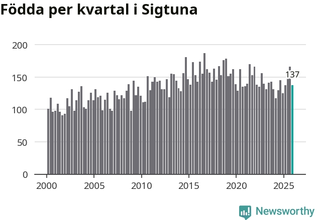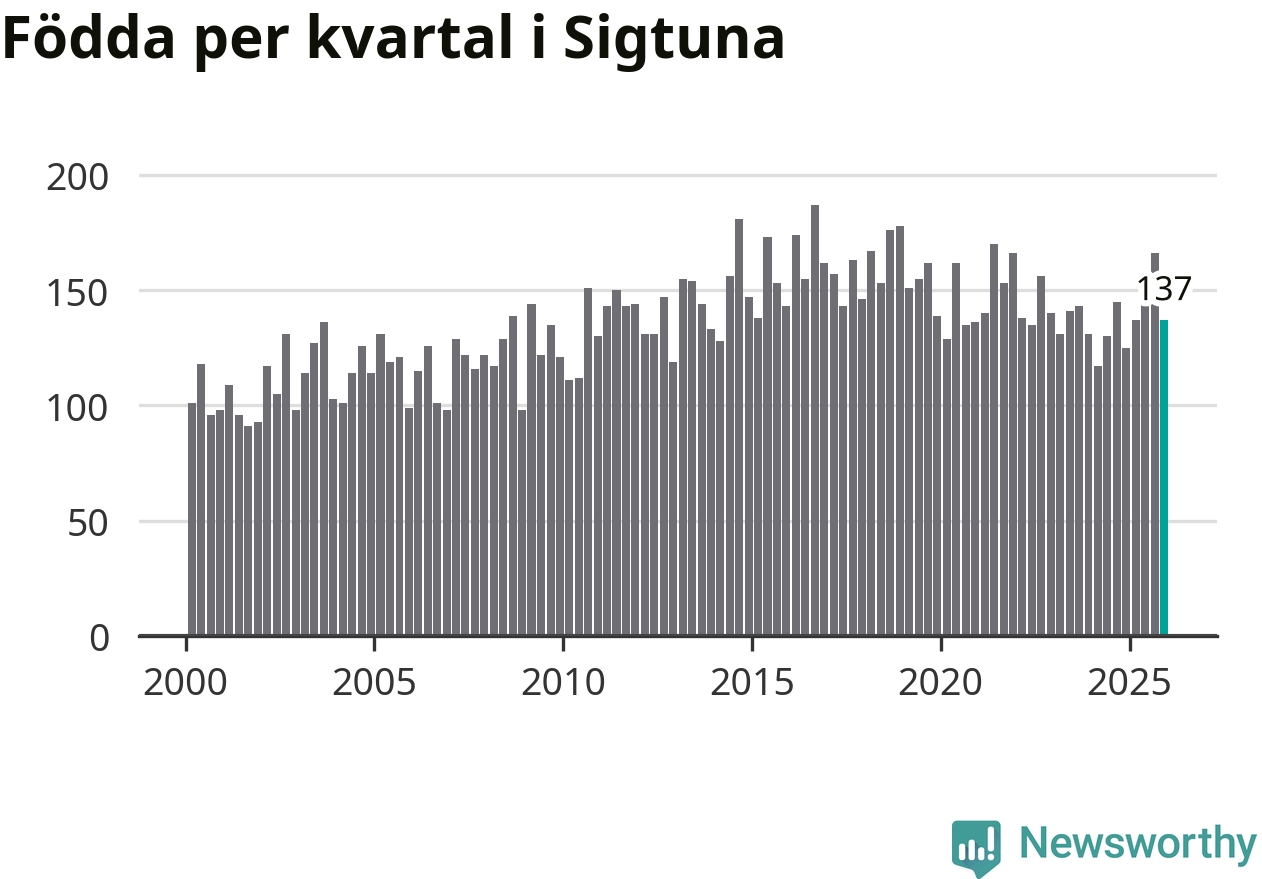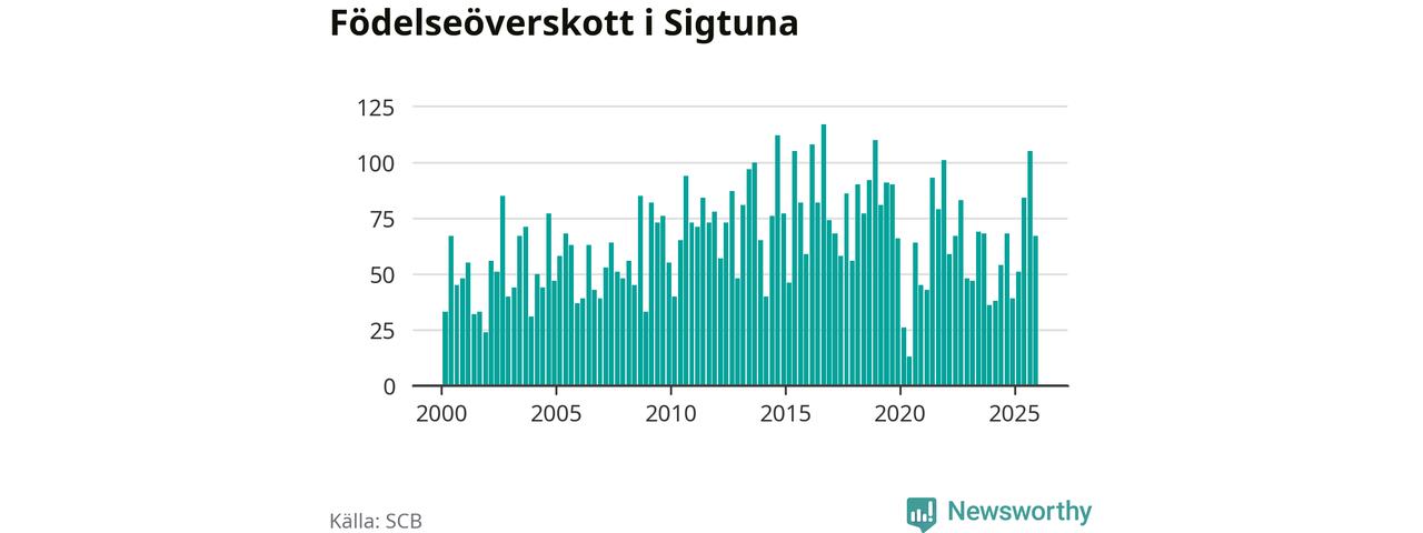 Enligt SCB:s siffror föddes 137 barn i Sigtuna under det senaste kvartalet. Samtidigt avled 70 personer. Sigtuna hade alltså ett positivt födelsenetto, vilket kommunen historiskt sett i princip alltid har haft.