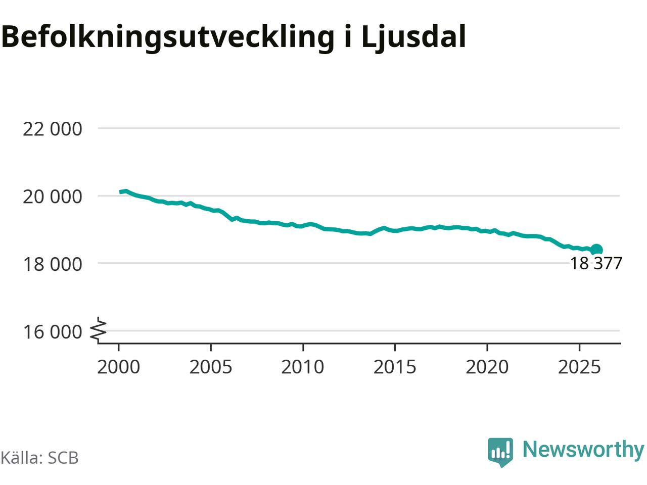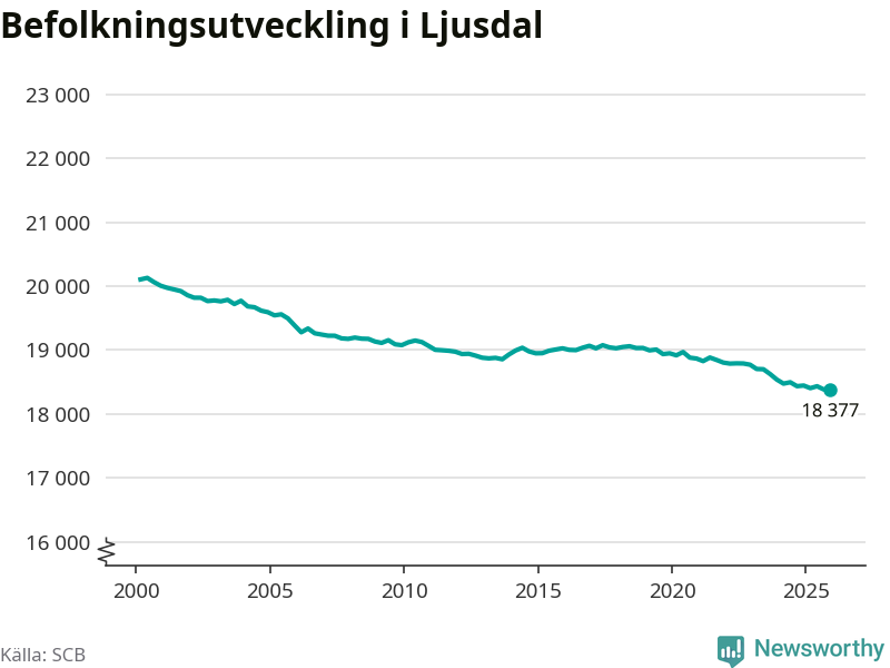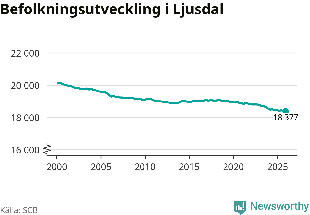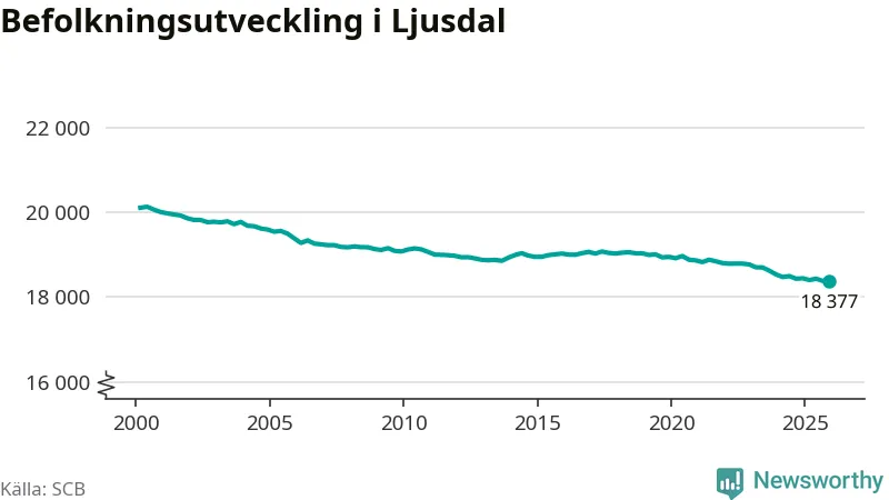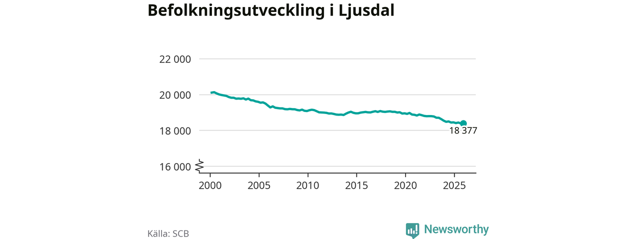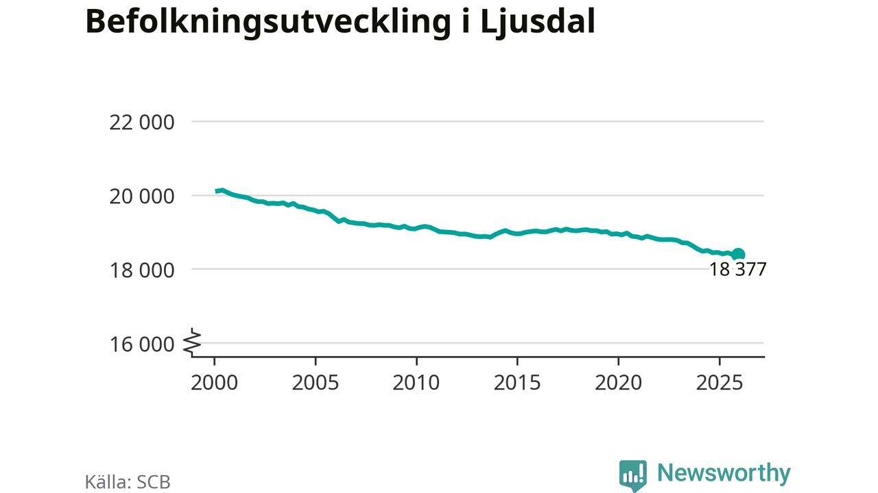 Jämfört med för ett år sedan har befolkningen i Ljusdal minskat med knappt 70 personer. Sedan millennieskiftet har folkmängden minskat med runt 1 730 personer, eller nio procent.