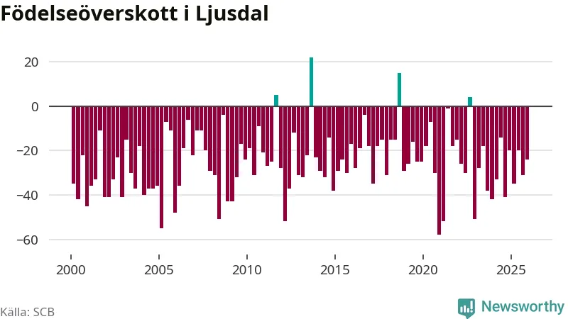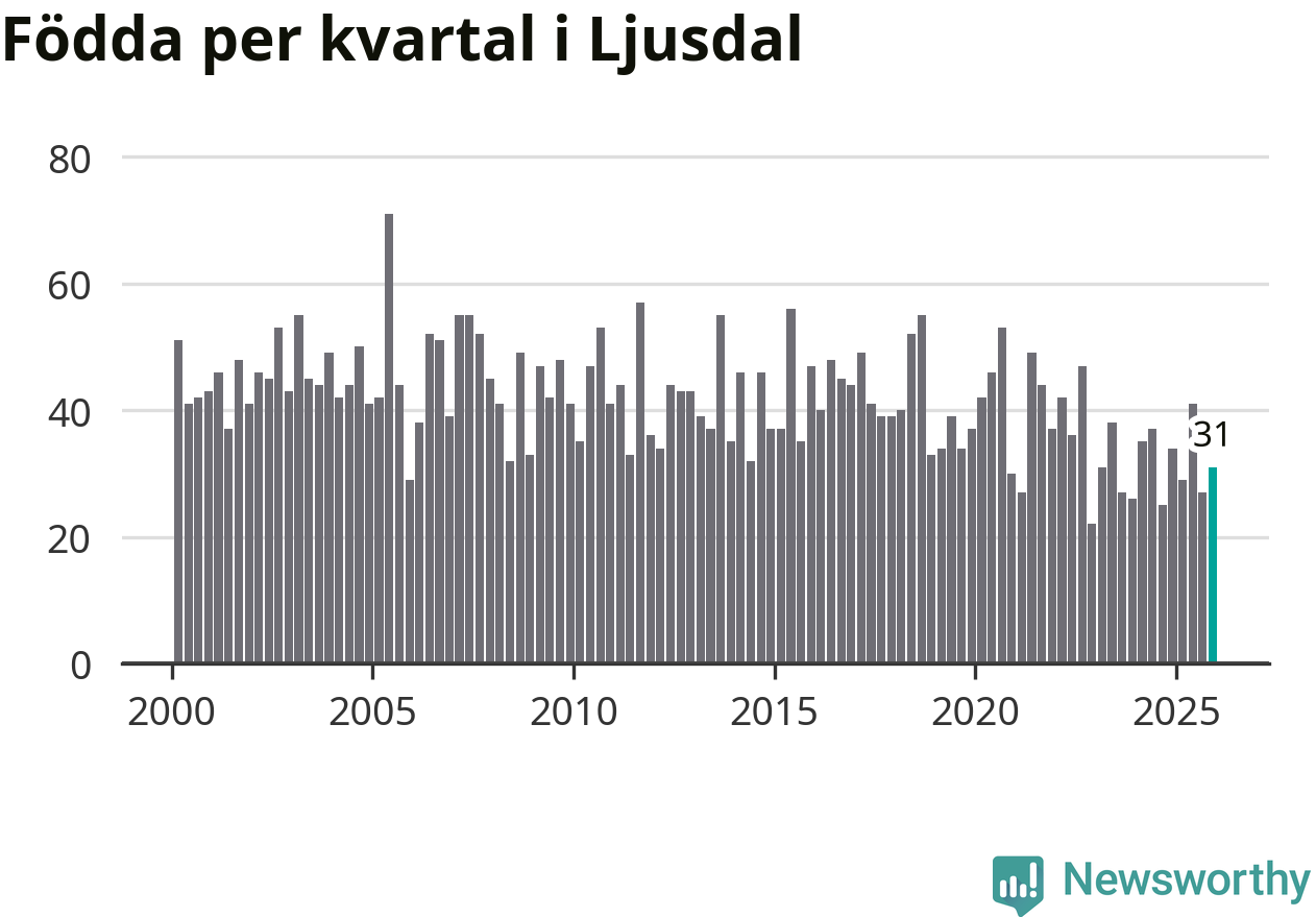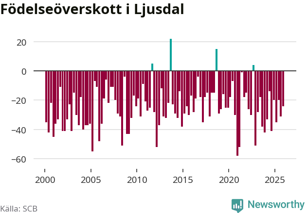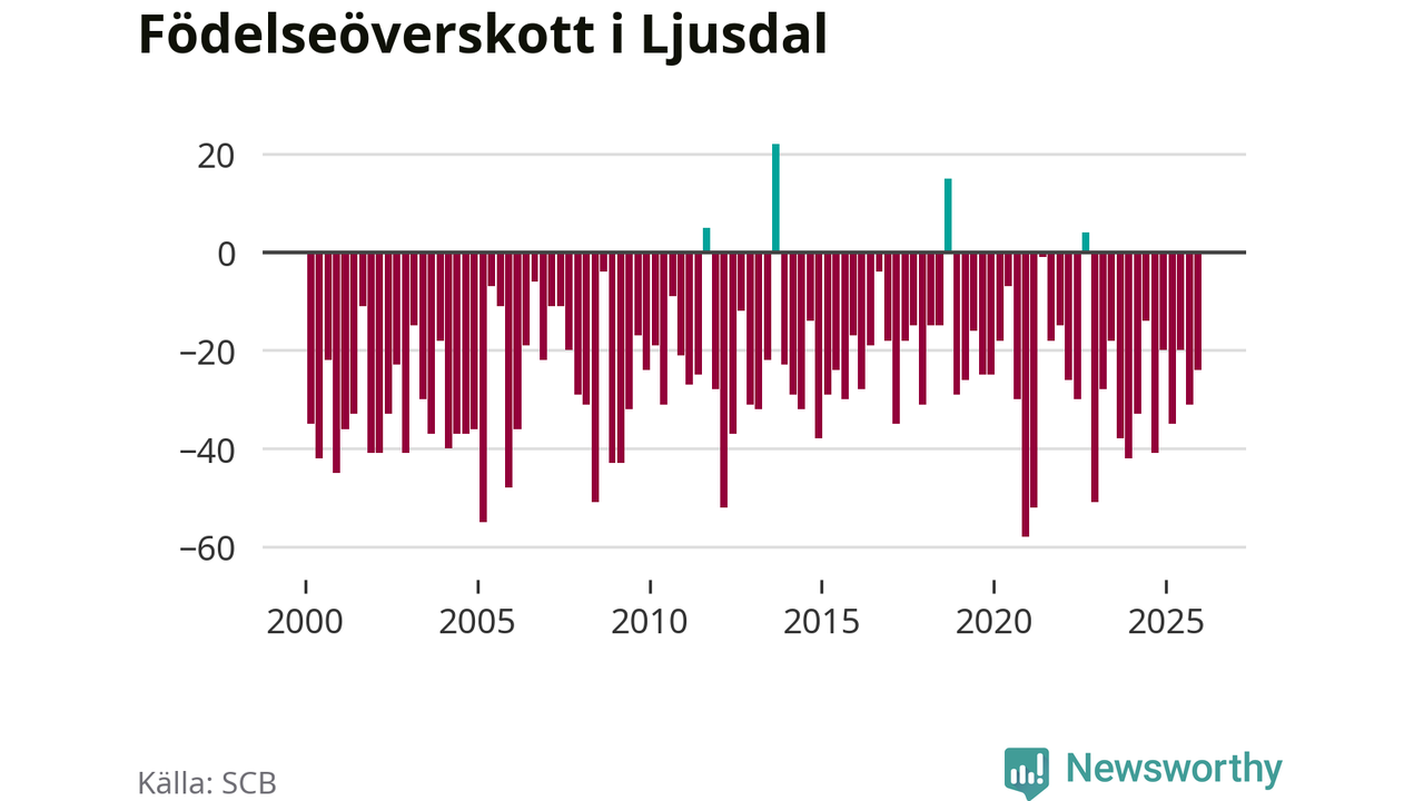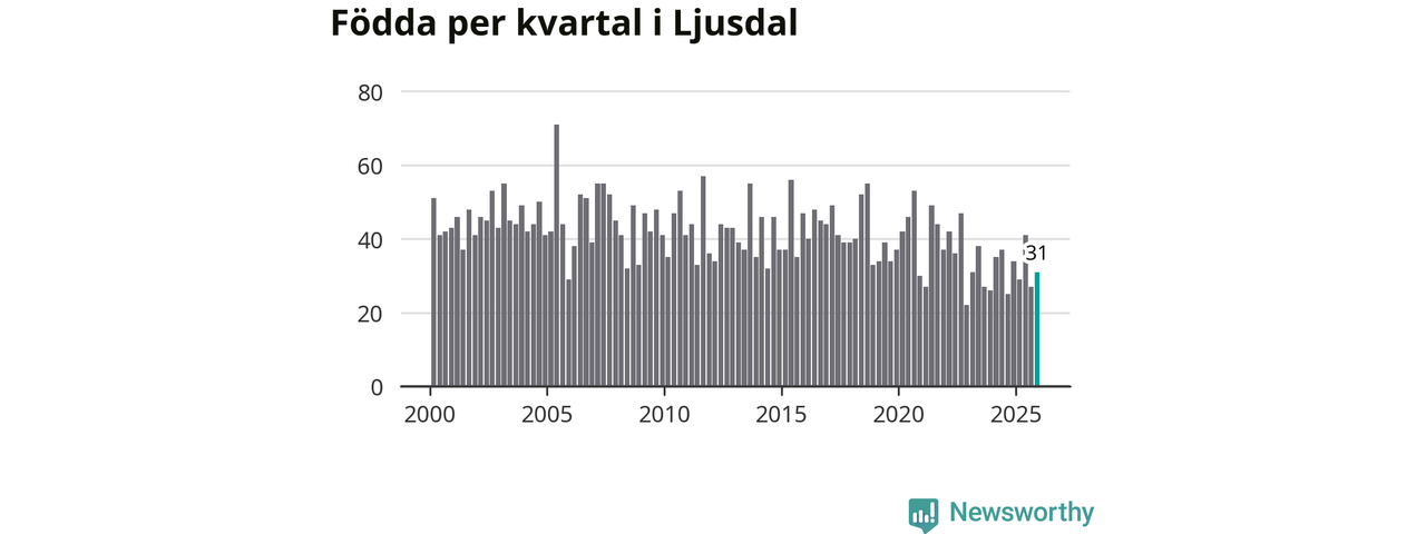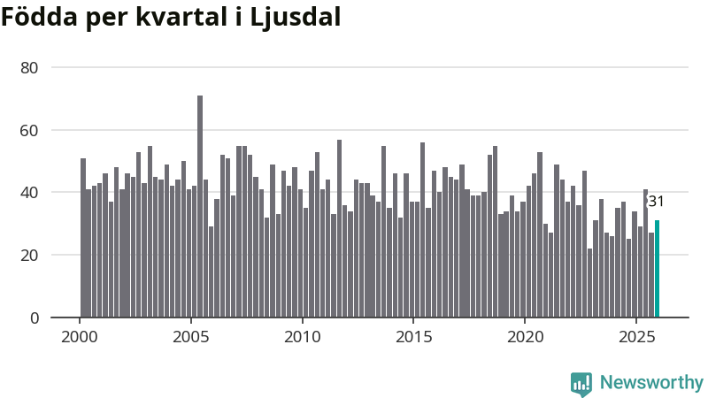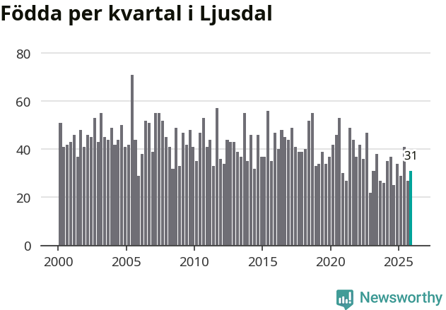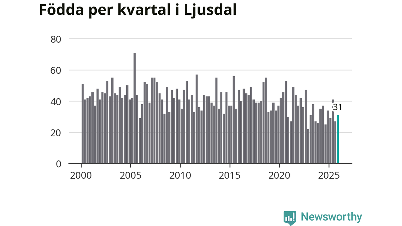 Enligt SCB:s siffror föddes 31 barn i Ljusdal under det senaste kvartalet. Samtidigt avled 55 personer. Ljusdal hade alltså ett negativt födelsenetto, vilket kommunen historiskt sett nästan alltid har haft.