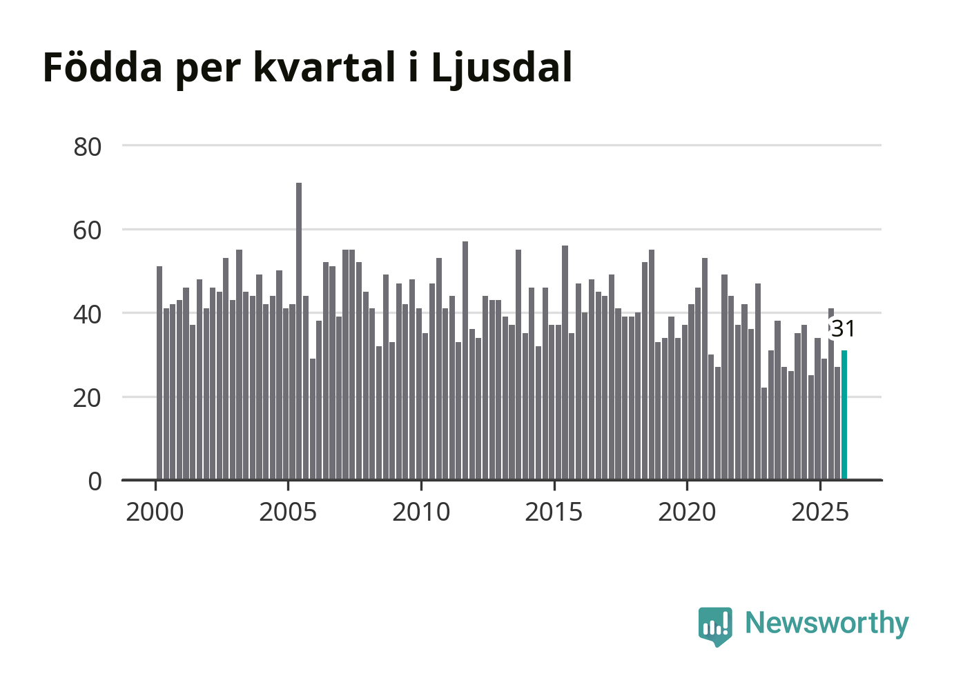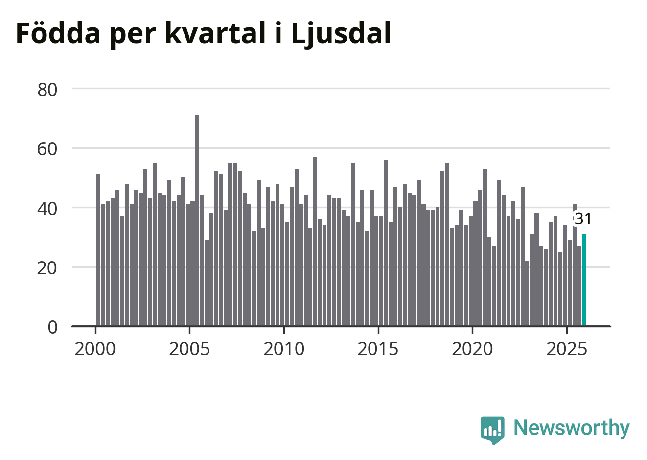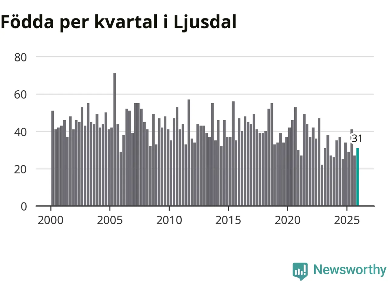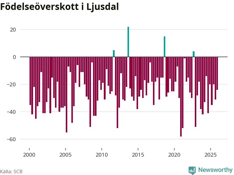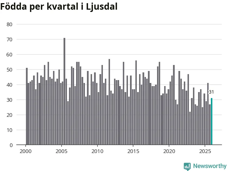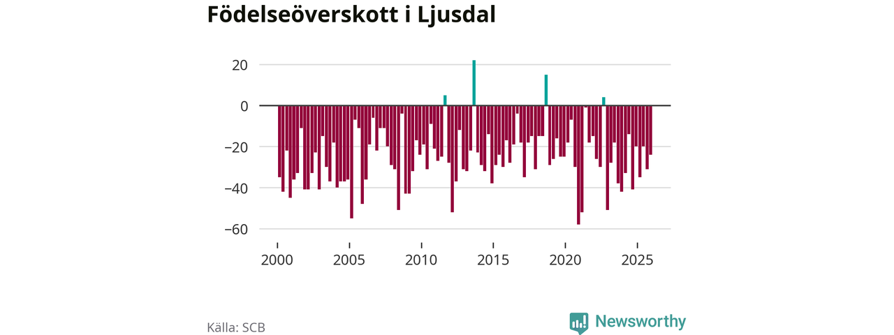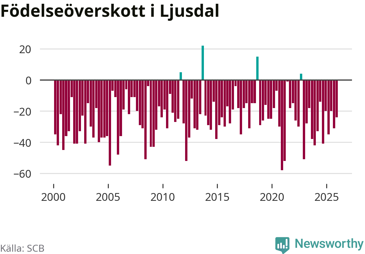 Enligt SCB:s siffror föddes 31 barn i Ljusdal under det senaste kvartalet. Samtidigt avled 55 personer. Ljusdal hade alltså ett negativt födelsenetto, vilket kommunen historiskt sett nästan alltid har haft.