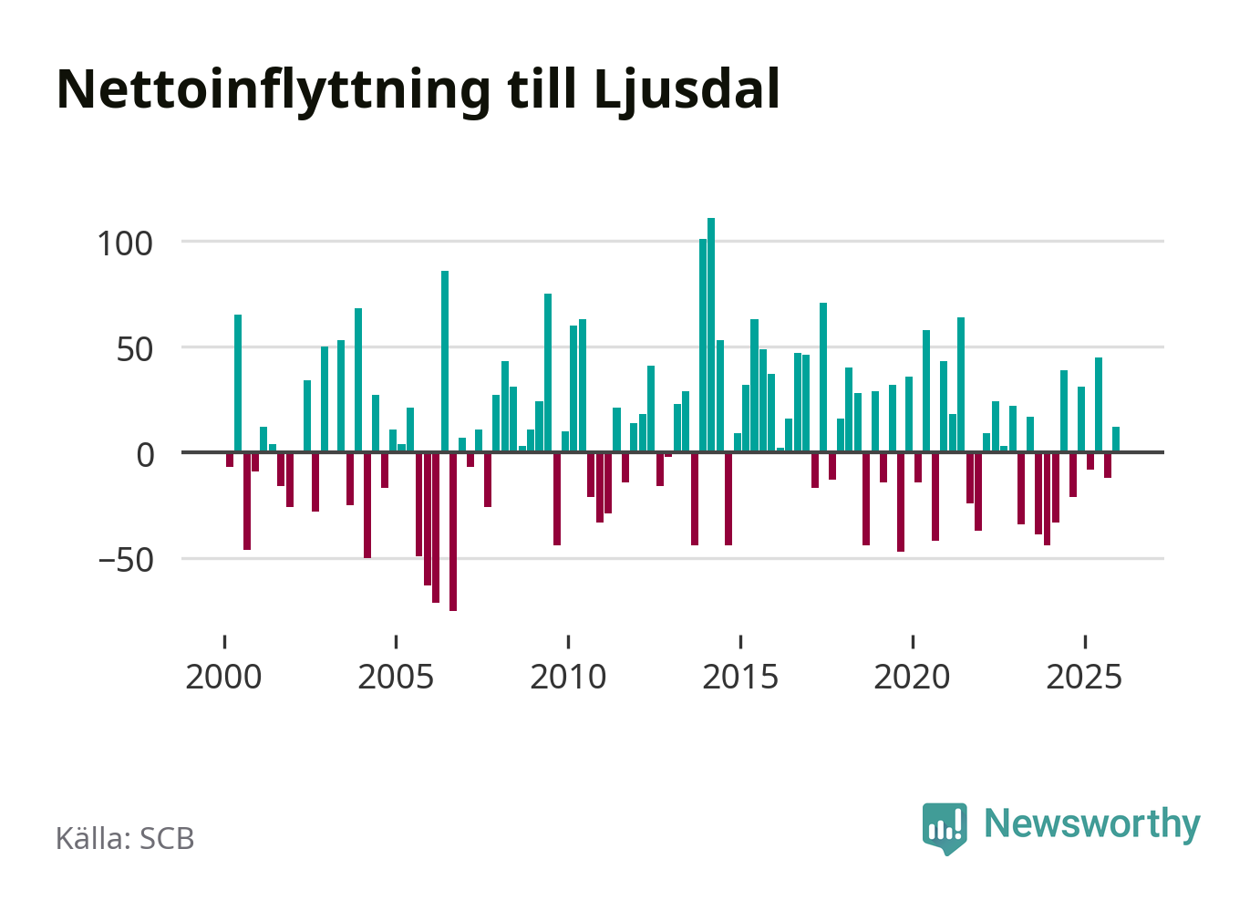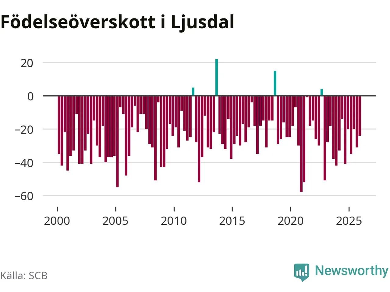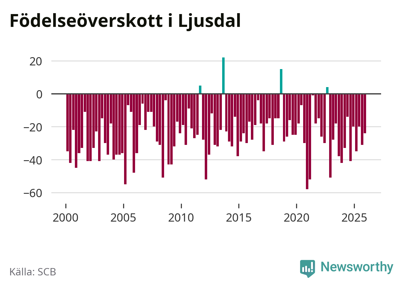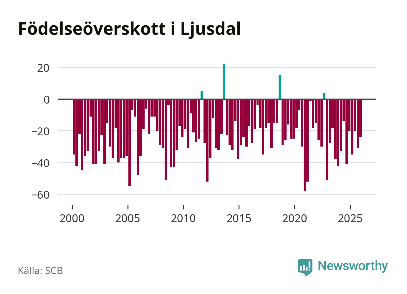 Enligt SCB:s siffror föddes 31 barn i Ljusdal under det senaste kvartalet. Samtidigt avled 55 personer. Ljusdal hade alltså ett negativt födelsenetto, vilket kommunen historiskt sett nästan alltid har haft.
