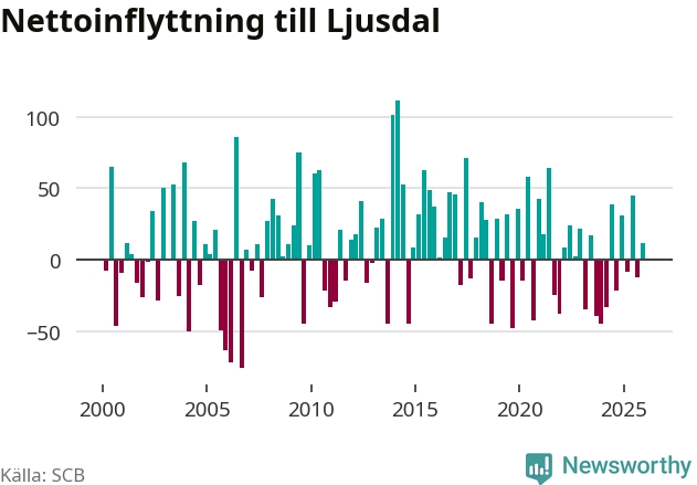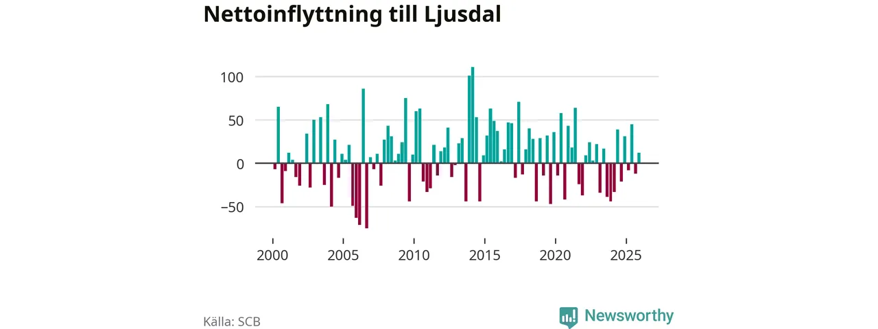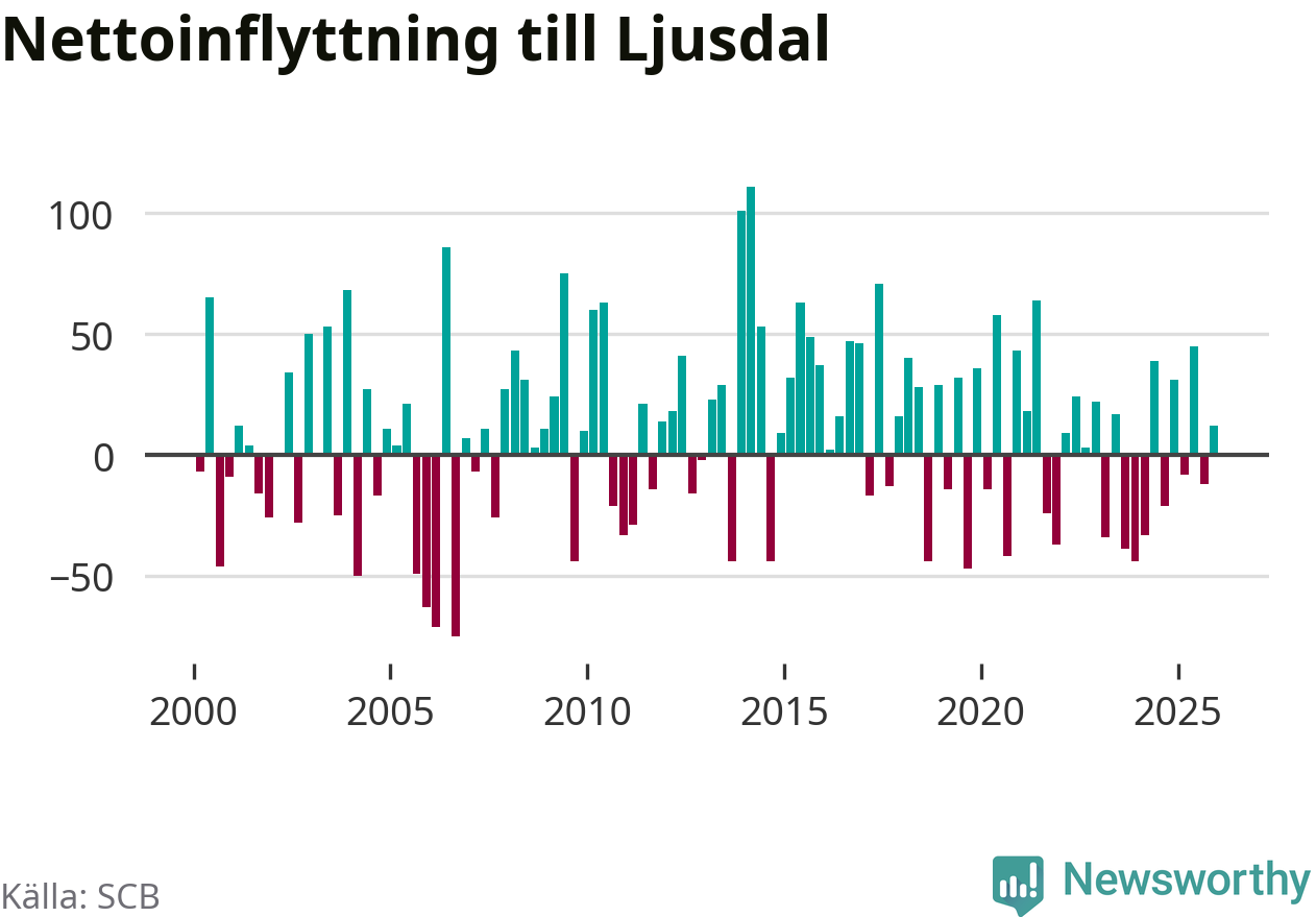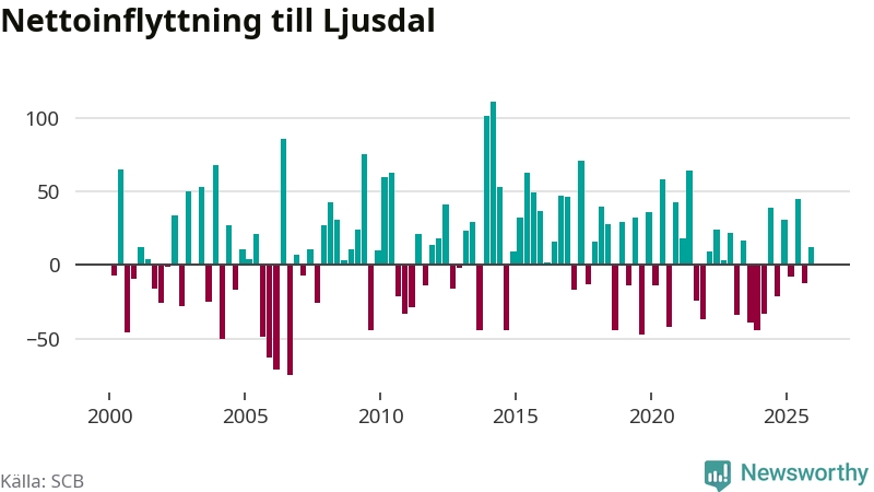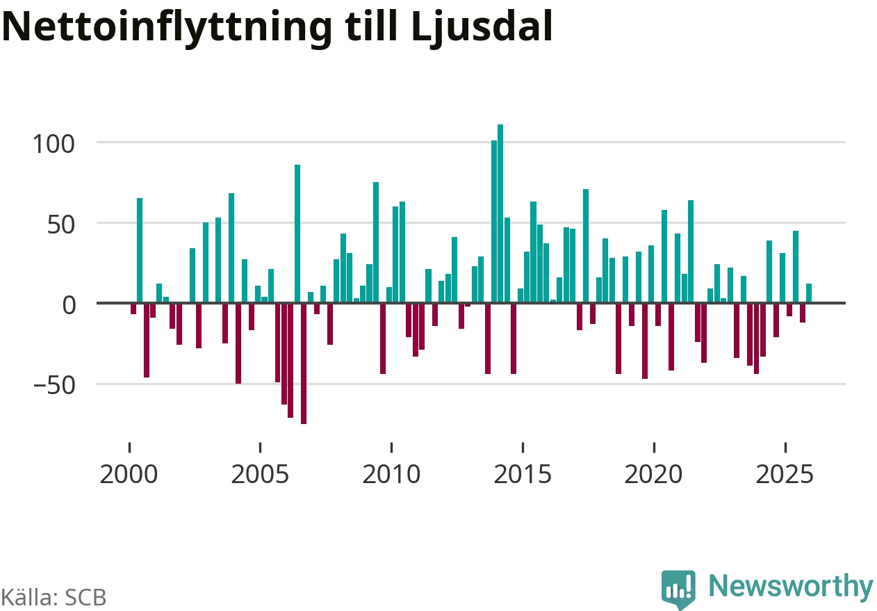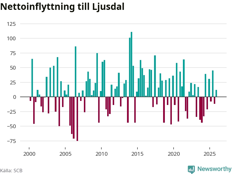 Under fjärde kvartalet 2025 flyttade 154 personer till kommunen medan 142 personer flyttade därifrån. Sedan seklets början har Ljusdal oftast haft ett positivt flyttnetto, inklusive det senaste kvartalet.