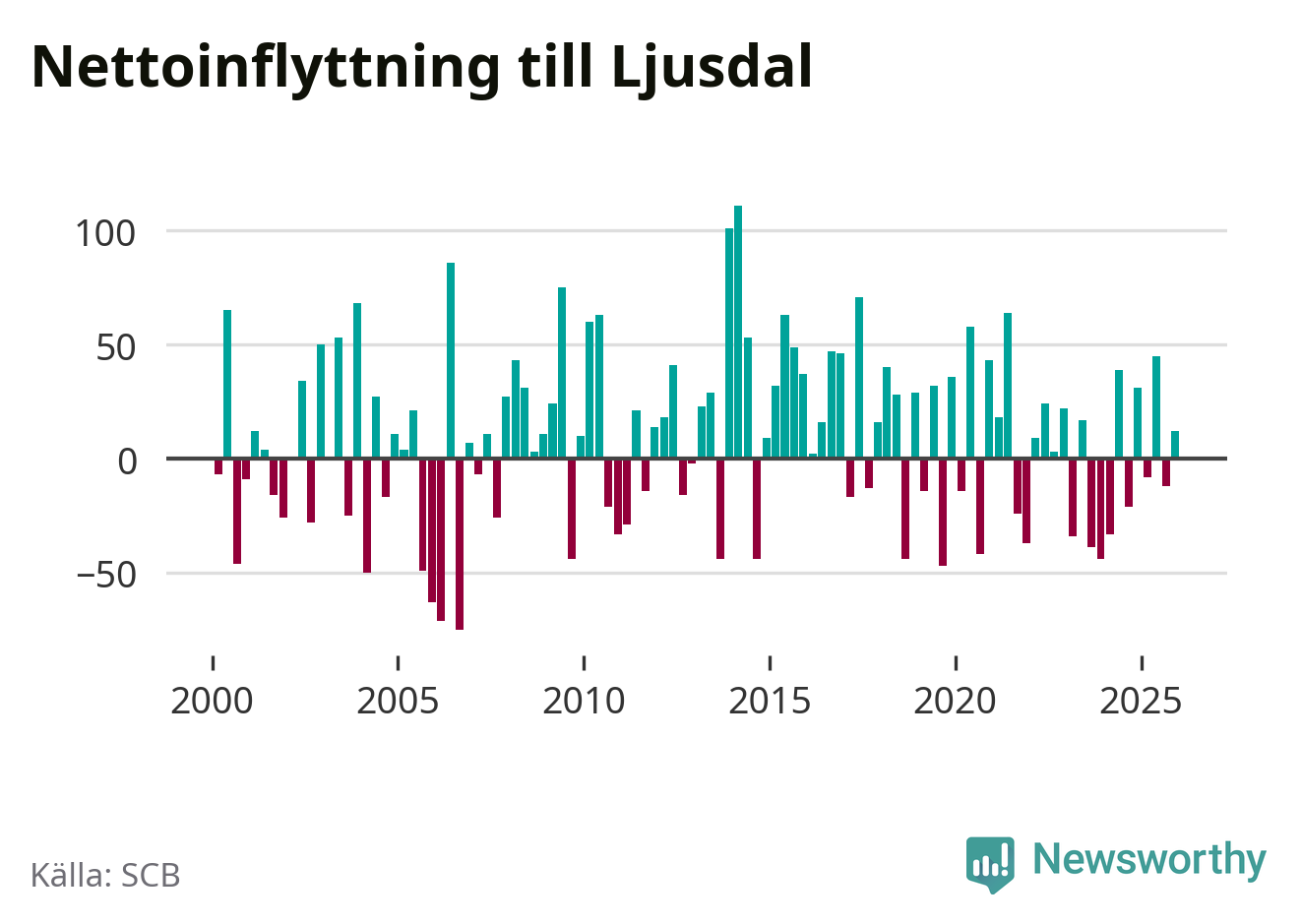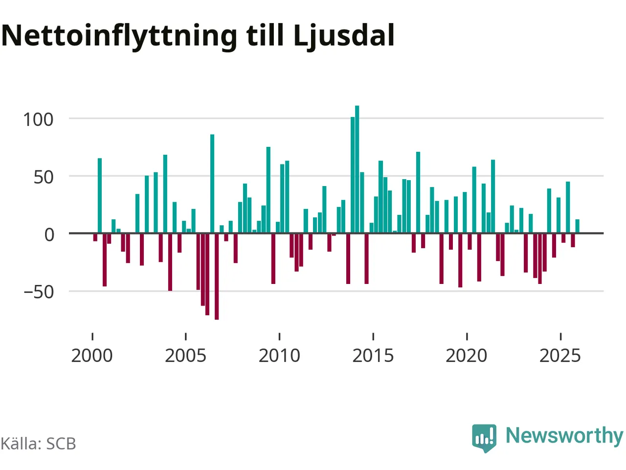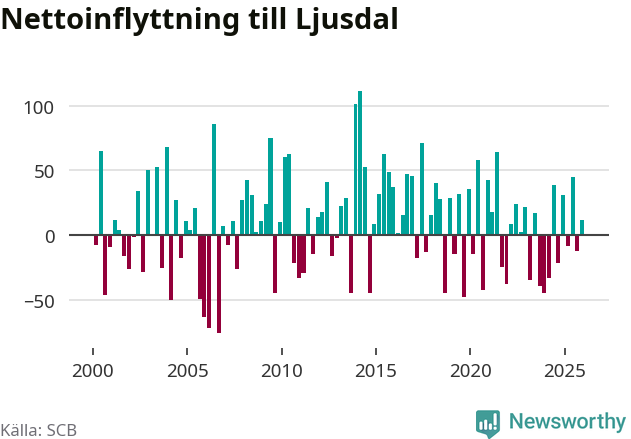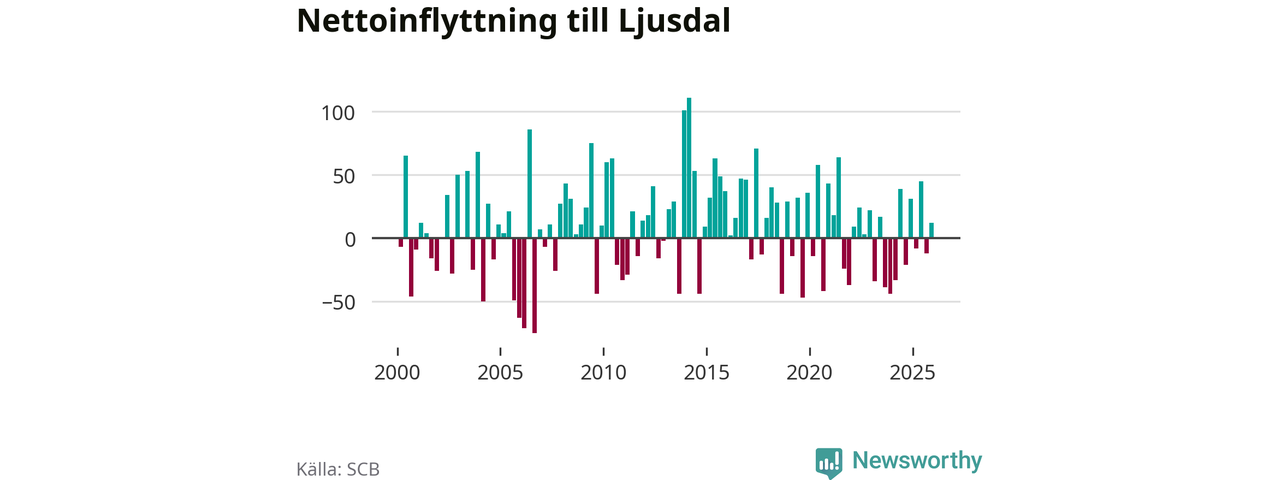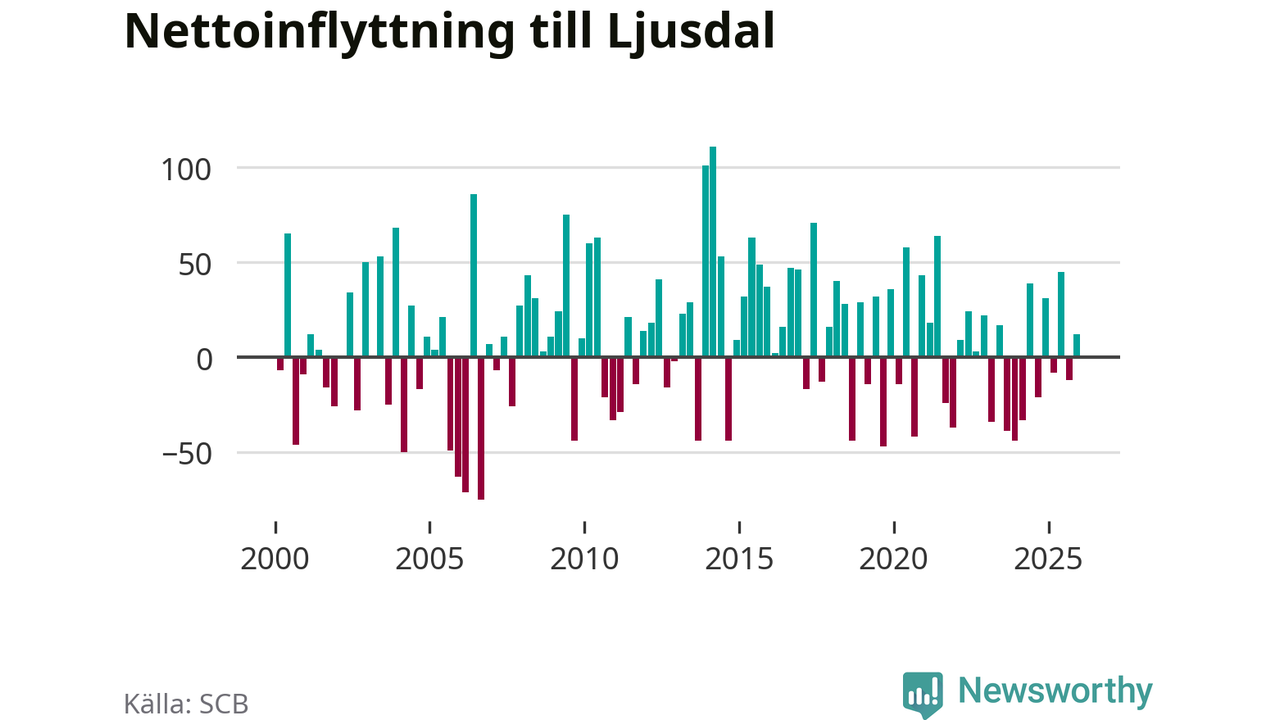 Under fjärde kvartalet 2025 flyttade 154 personer till kommunen medan 142 personer flyttade därifrån. Sedan seklets början har Ljusdal oftast haft ett positivt flyttnetto, inklusive det senaste kvartalet.
