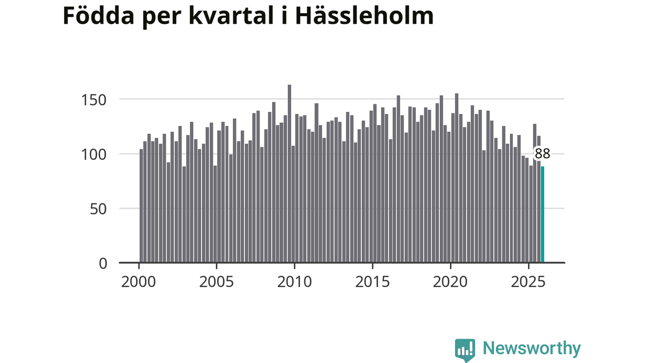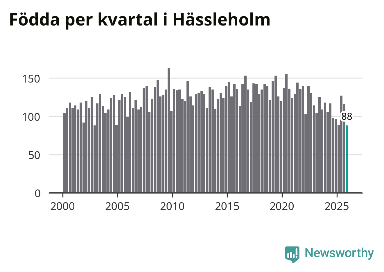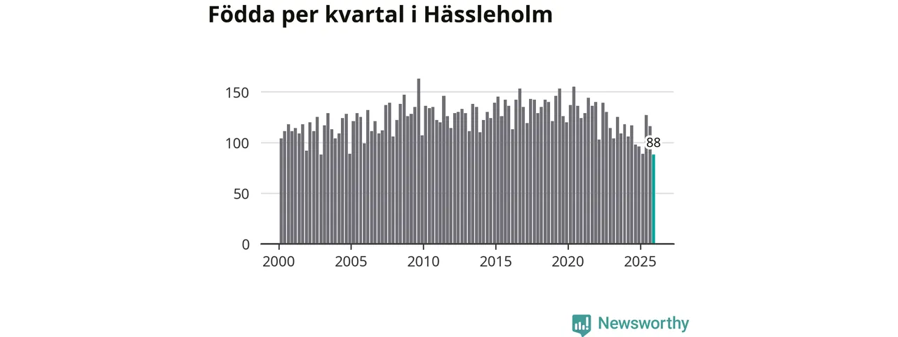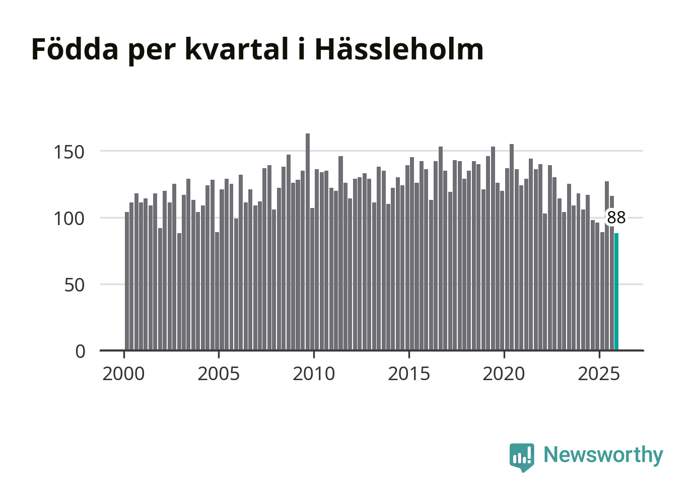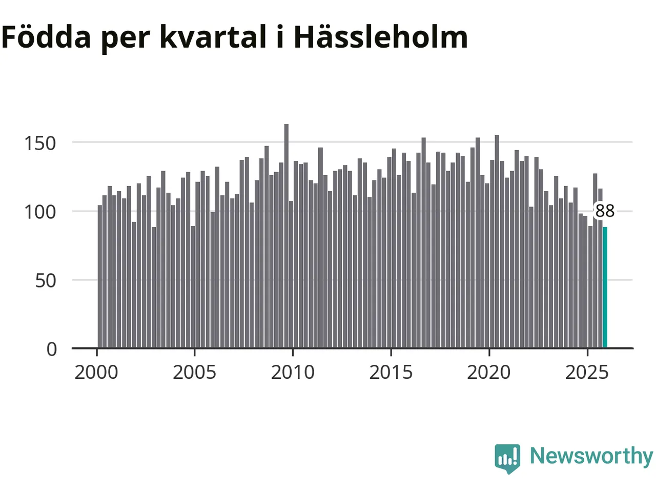 Enligt SCB:s siffror föddes 88 barn i Hässleholm under det senaste kvartalet. Det är det lägsta födelsetal som registrerats i kommunen under 2000-talet. Det finns en osäkerhet här, eftersom SCB lägger på ett slumpmässigt brus på alla siffror. Klart är i alla fall att det rör sig om historiskt låga nivåer. Samtidigt avled 147 personer. Hässleholm hade alltså ett negativt födelsenetto, vilket kommunen historiskt sett oftast har haft.