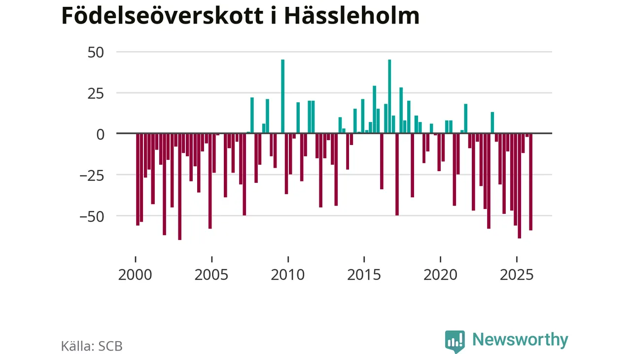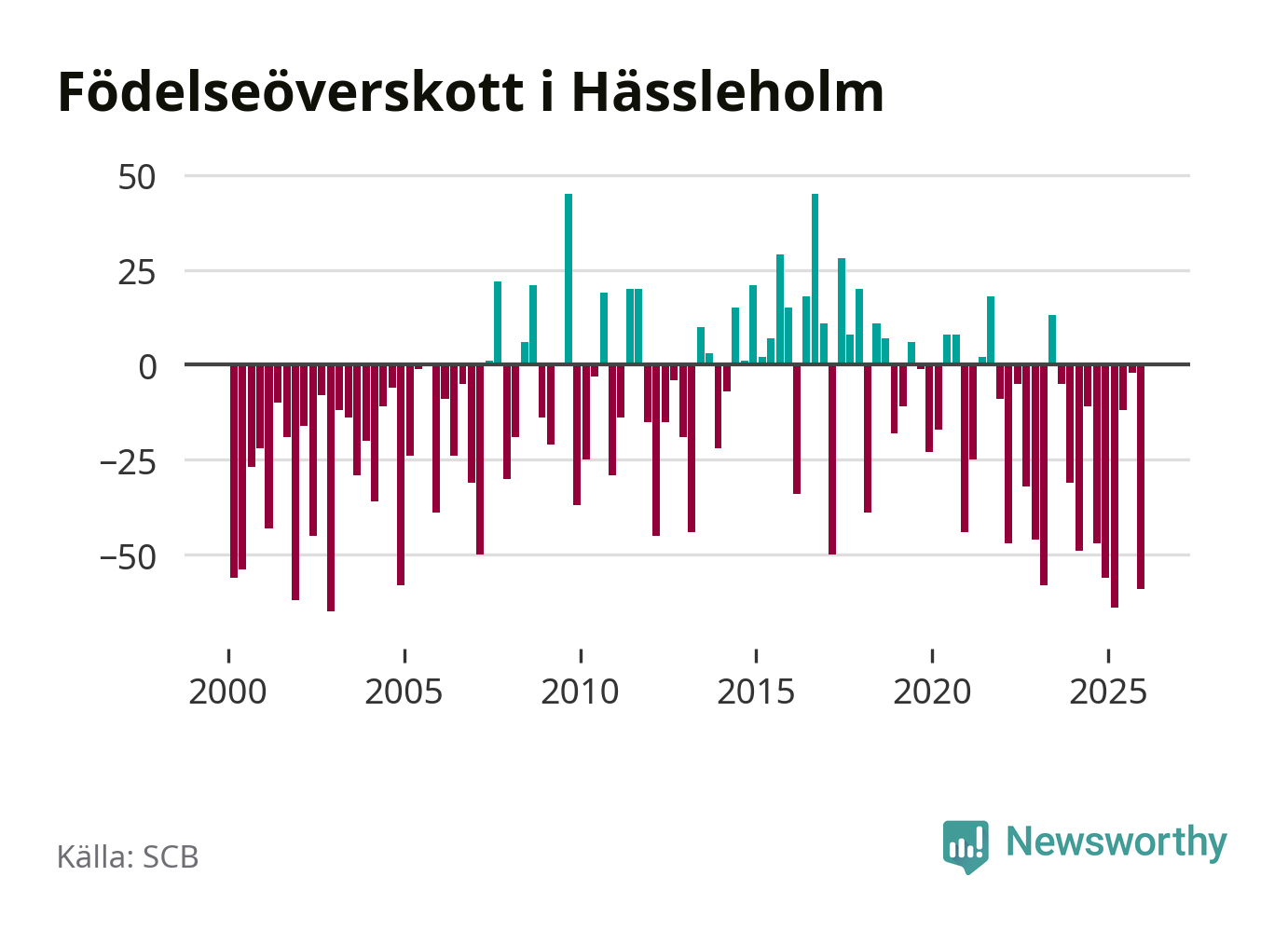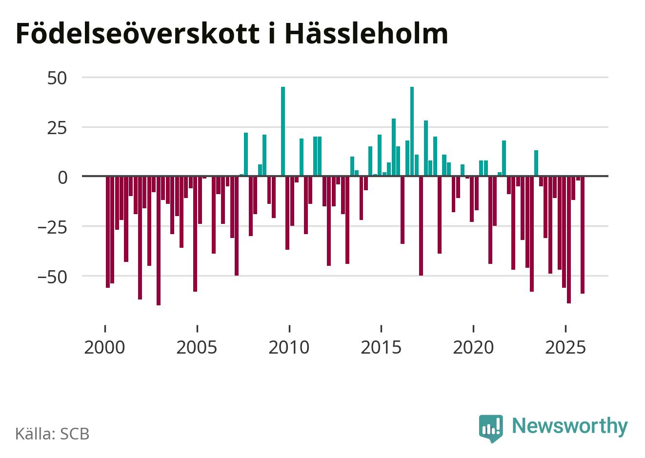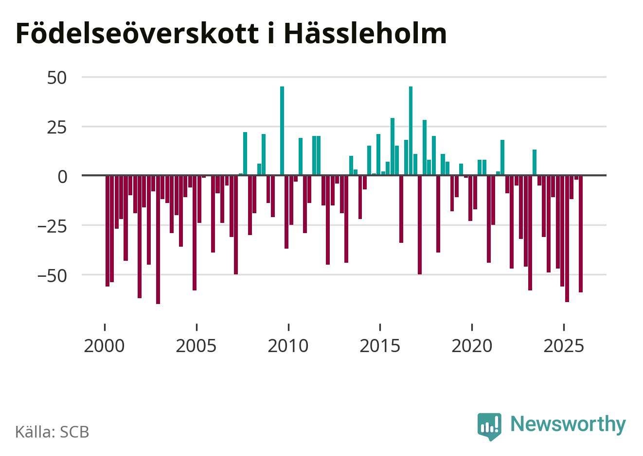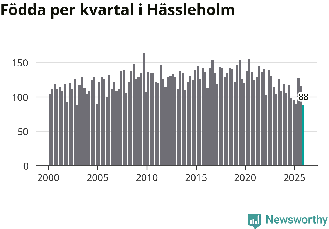Enligt SCB:s siffror föddes 88 barn i Hässleholm under det senaste kvartalet. Det är det lägsta födelsetal som registrerats i kommunen under 2000-talet. Det finns en osäkerhet här, eftersom SCB lägger på ett slumpmässigt brus på alla siffror. Klart är i alla fall att det rör sig om historiskt låga nivåer. Samtidigt avled 147 personer. Hässleholm hade alltså ett negativt födelsenetto, vilket kommunen historiskt sett oftast har haft.