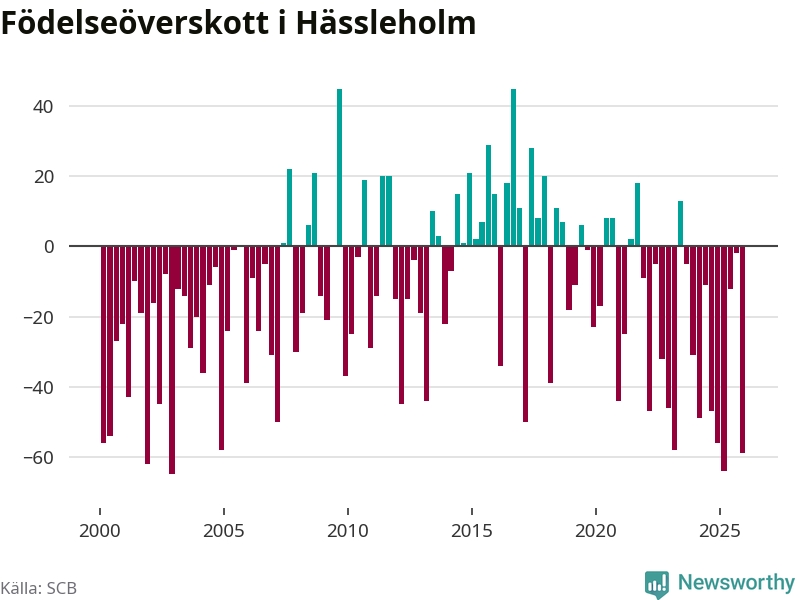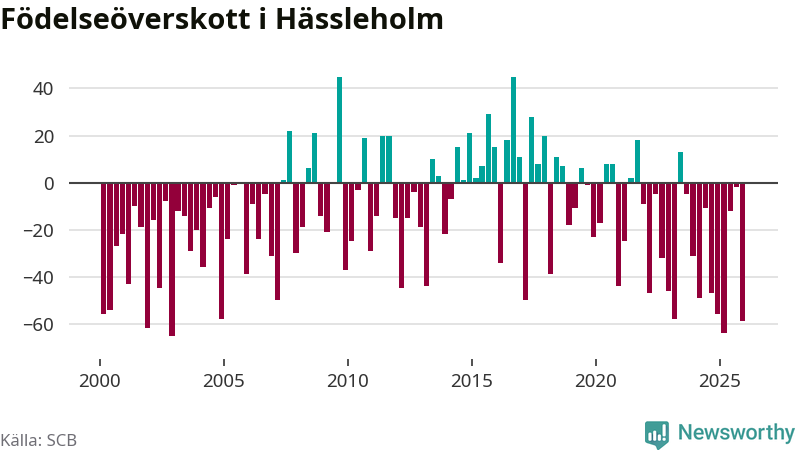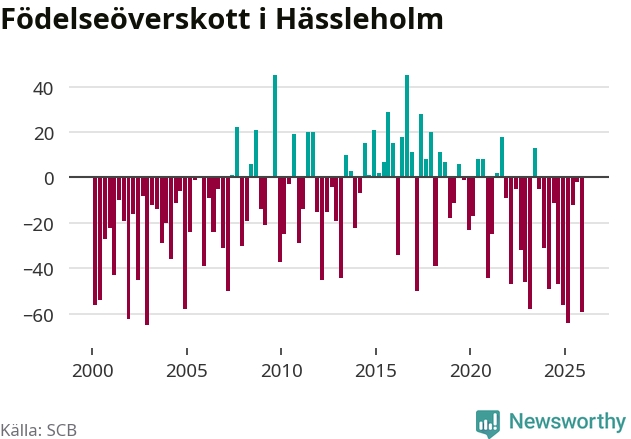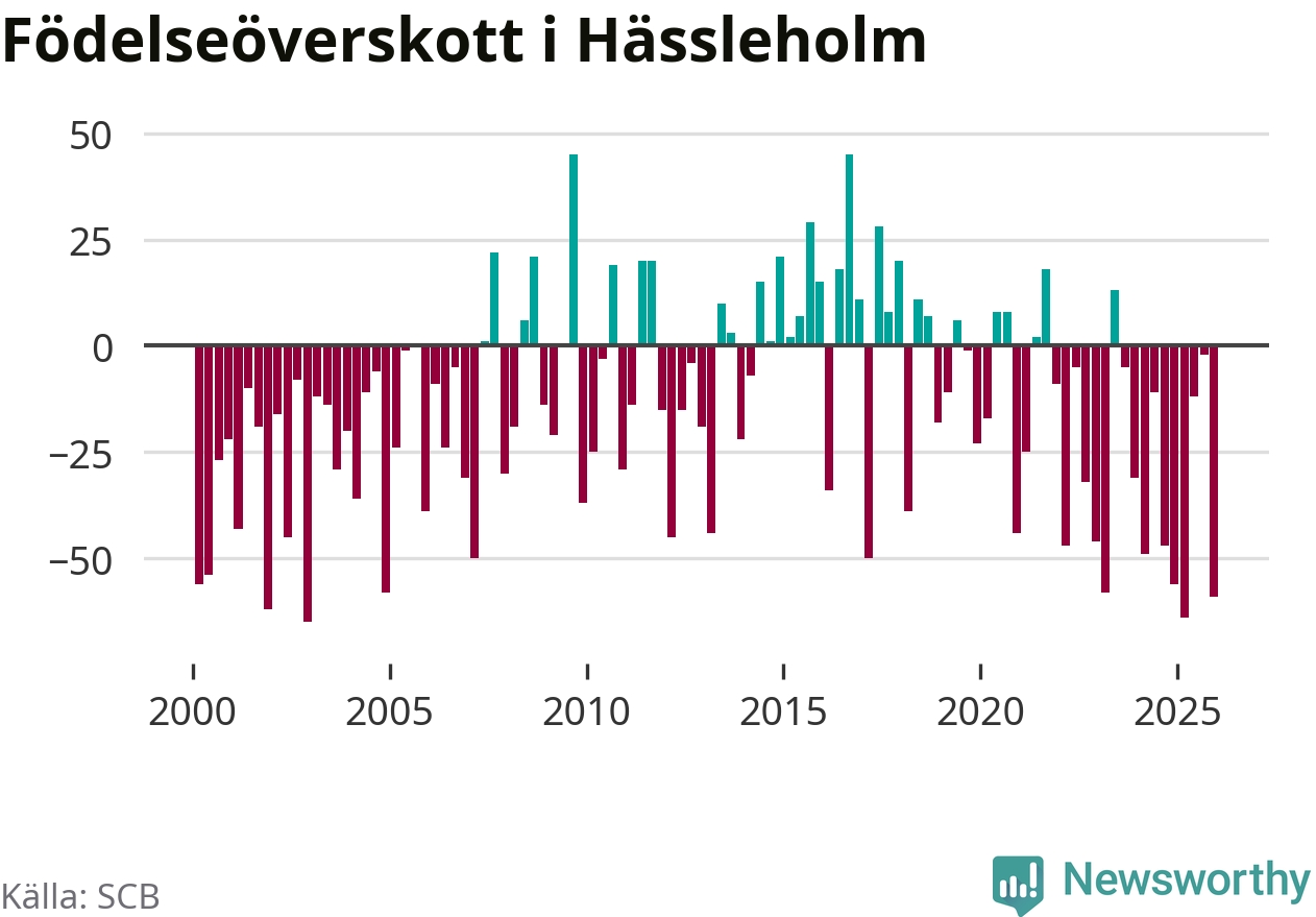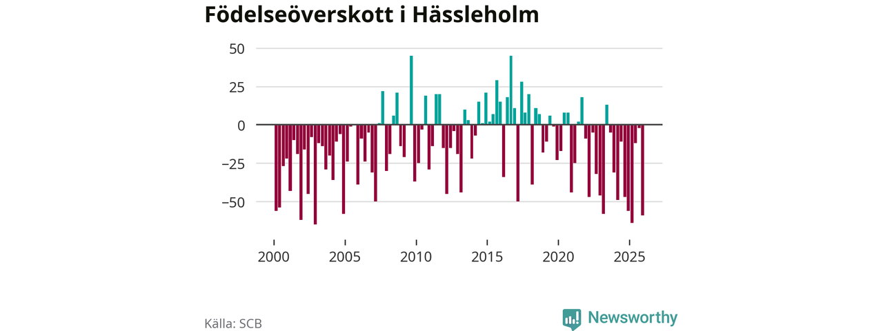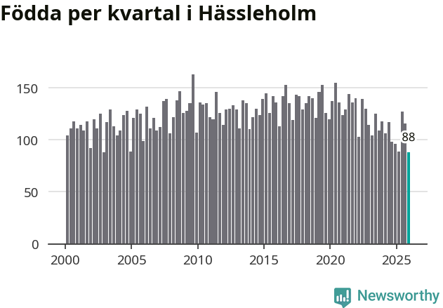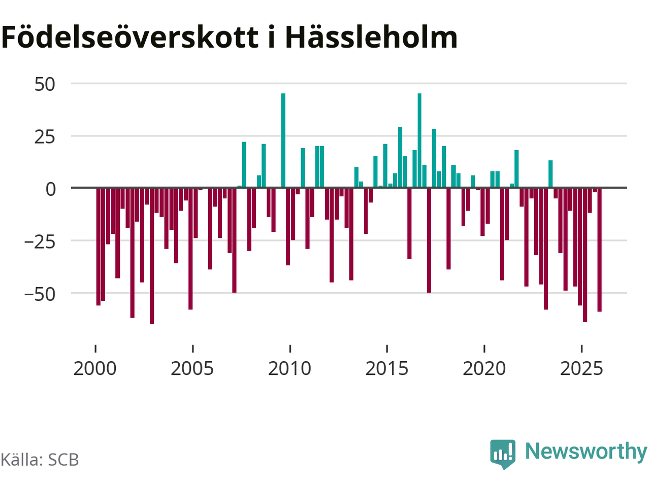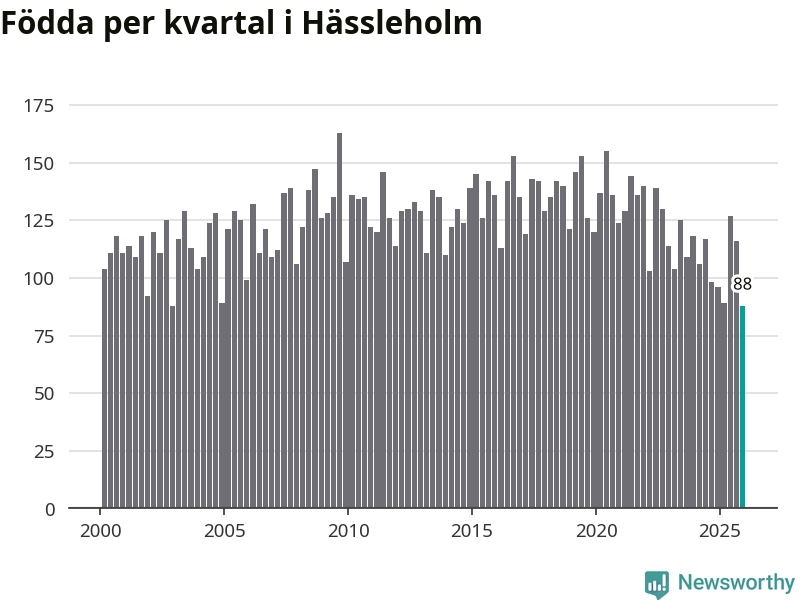 Enligt SCB:s siffror föddes 88 barn i Hässleholm under det senaste kvartalet. Det är det lägsta födelsetal som registrerats i kommunen under 2000-talet. Det finns en osäkerhet här, eftersom SCB lägger på ett slumpmässigt brus på alla siffror. Klart är i alla fall att det rör sig om historiskt låga nivåer. Samtidigt avled 147 personer. Hässleholm hade alltså ett negativt födelsenetto, vilket kommunen historiskt sett oftast har haft.