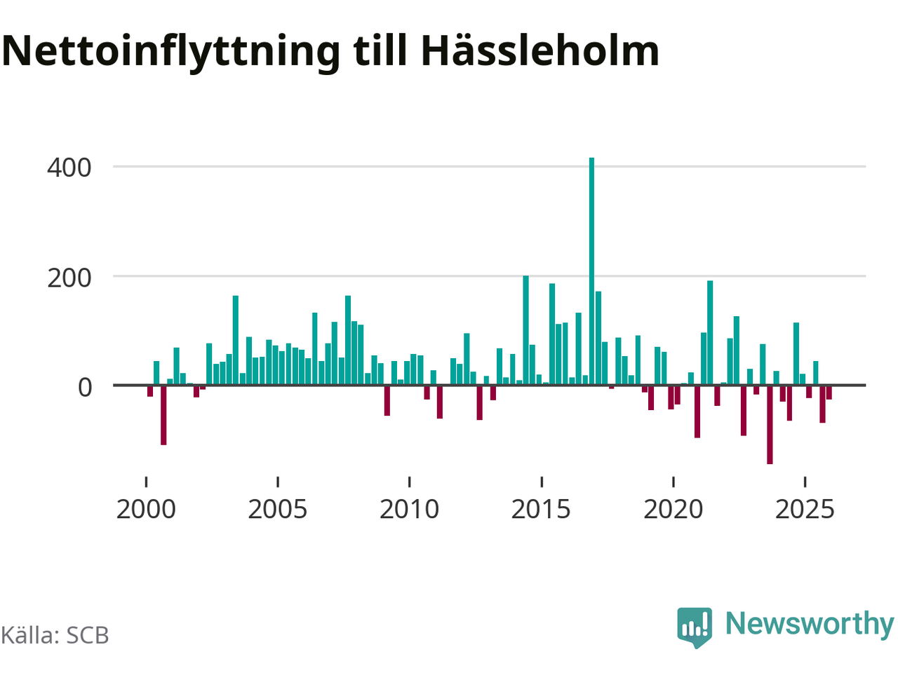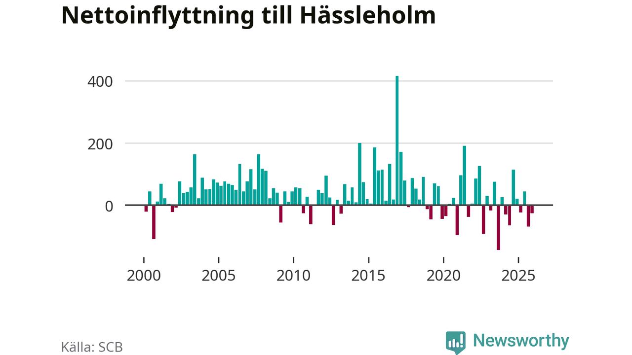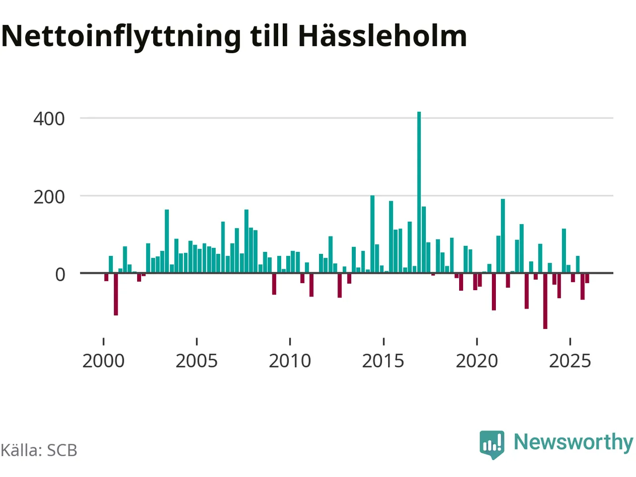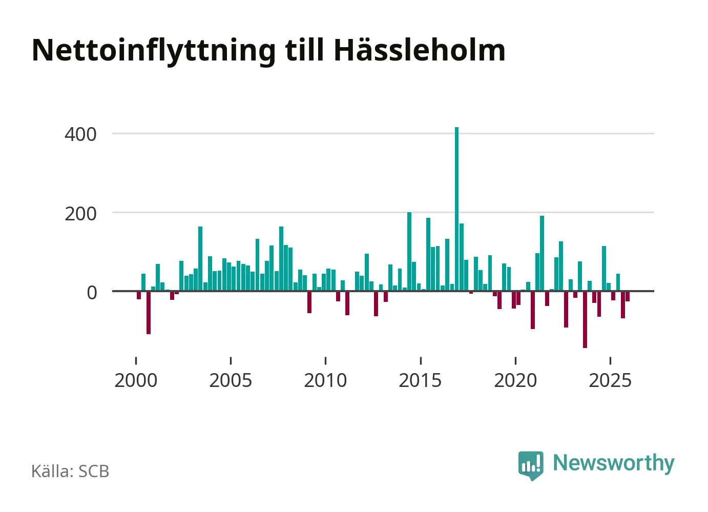 Under fjärde kvartalet 2025 flyttade 552 personer till kommunen medan 577 personer flyttade därifrån. Sedan seklets början har Hässleholm oftast haft ett positivt flyttnetto.