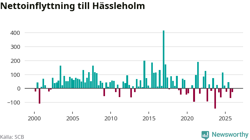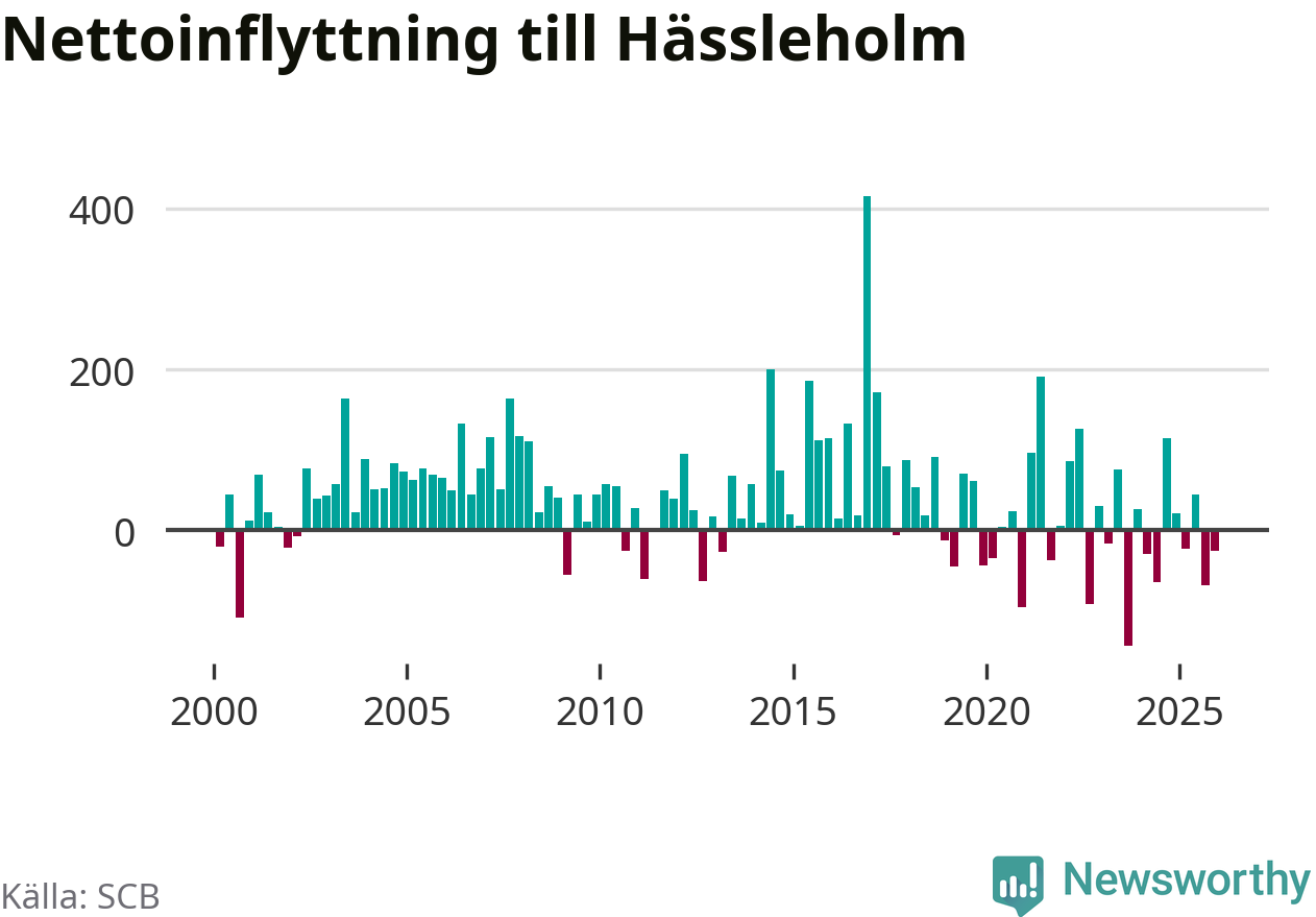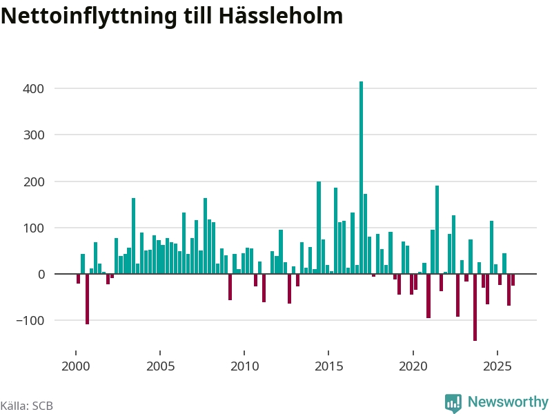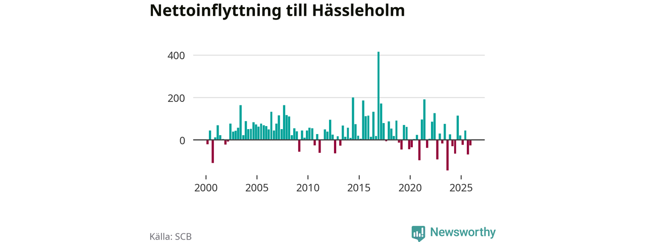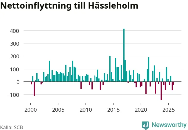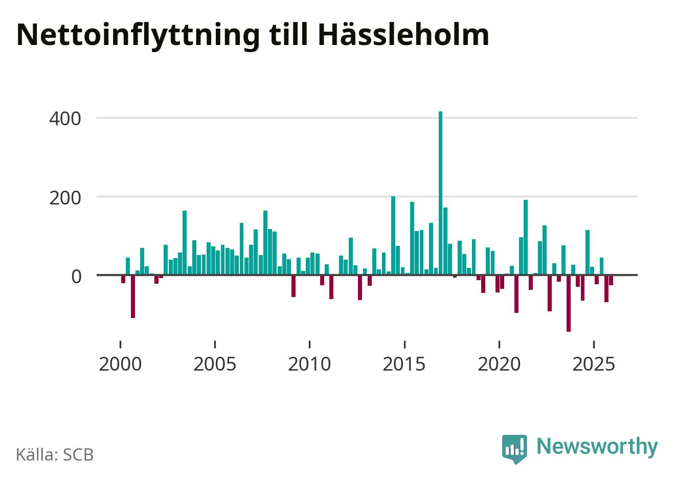 Under fjärde kvartalet 2025 flyttade 552 personer till kommunen medan 577 personer flyttade därifrån. Sedan seklets början har Hässleholm oftast haft ett positivt flyttnetto.