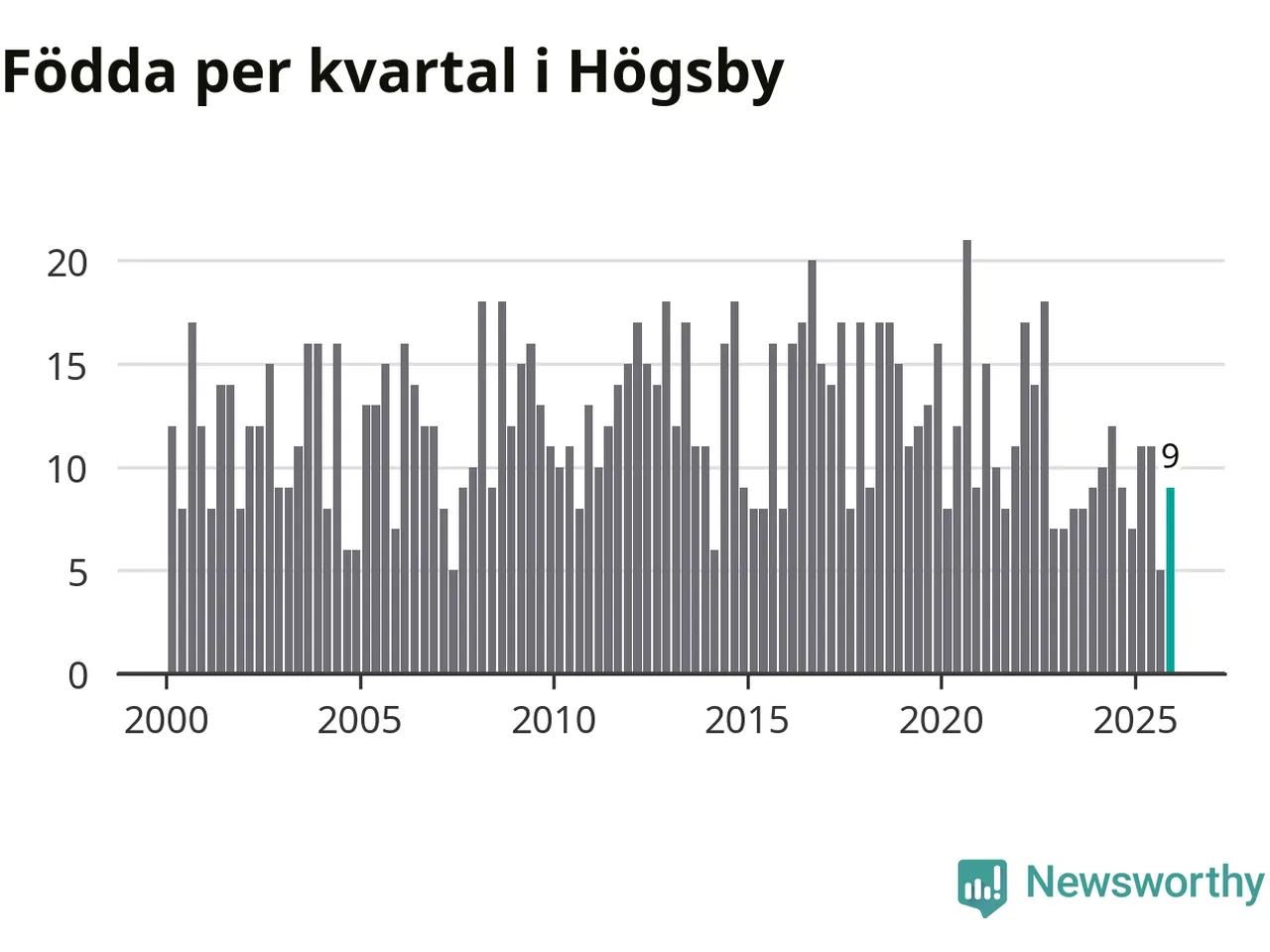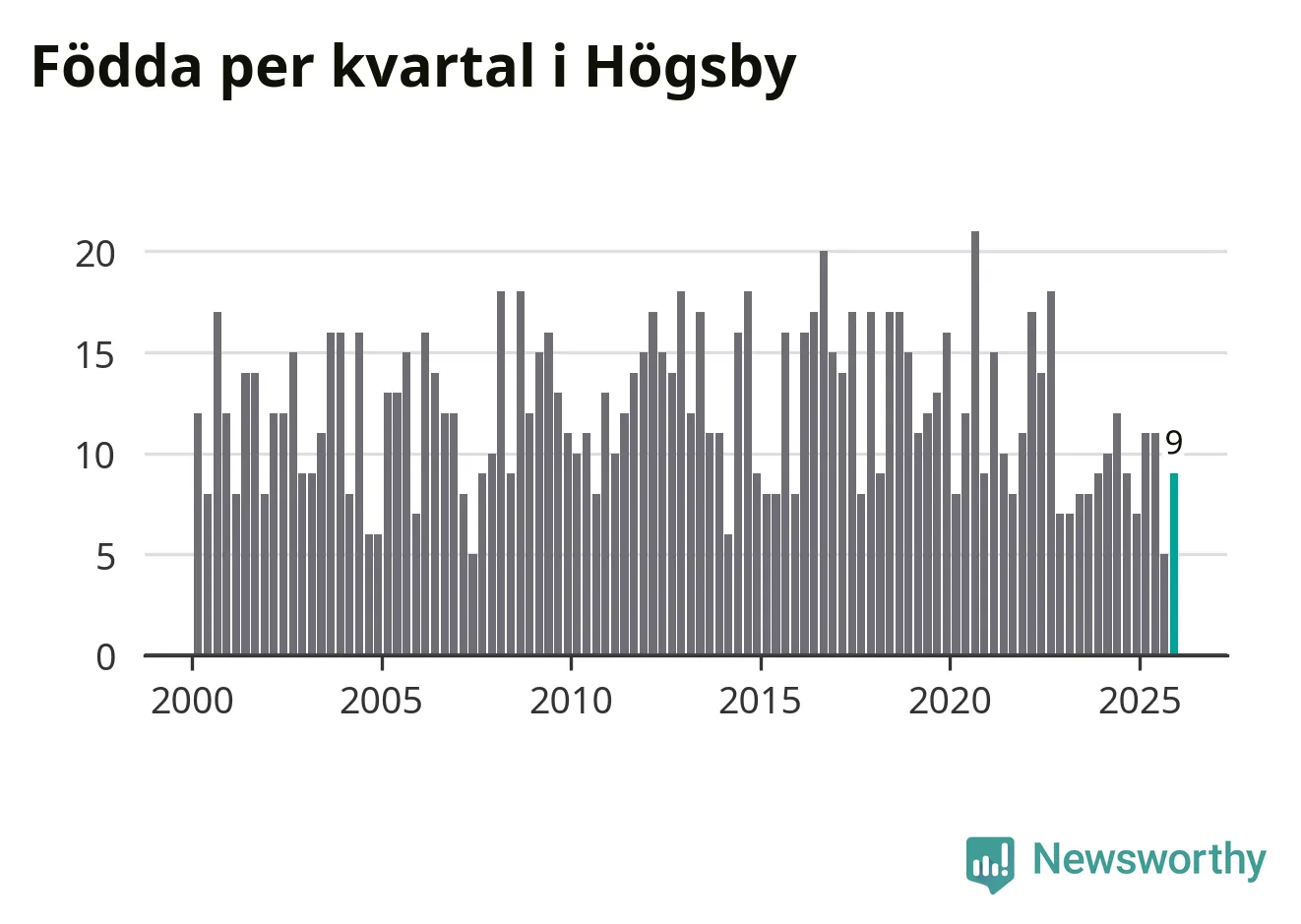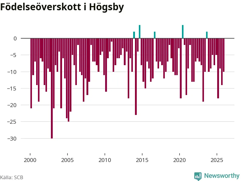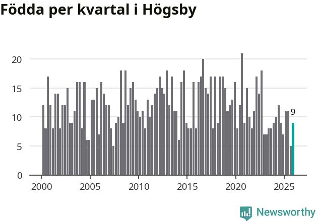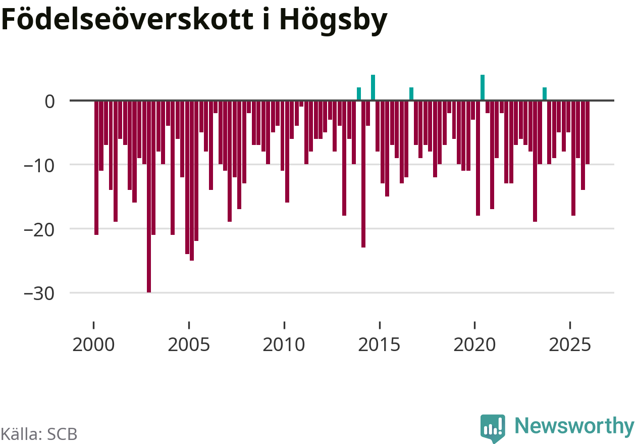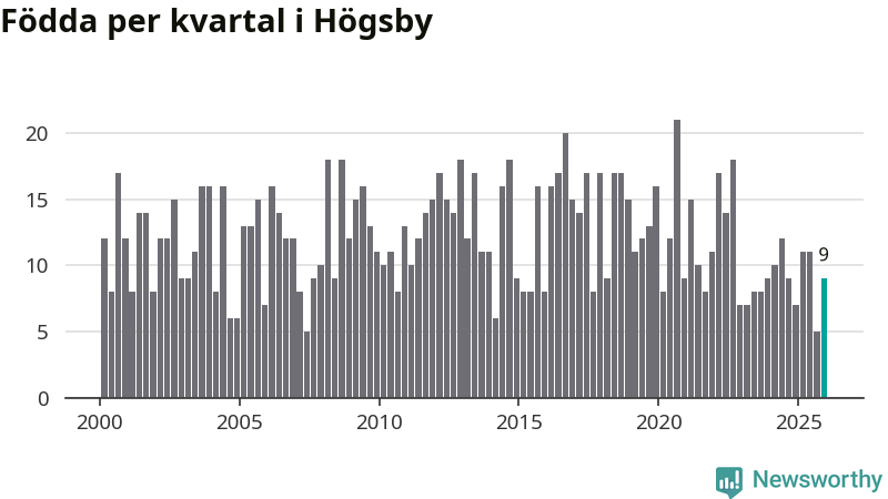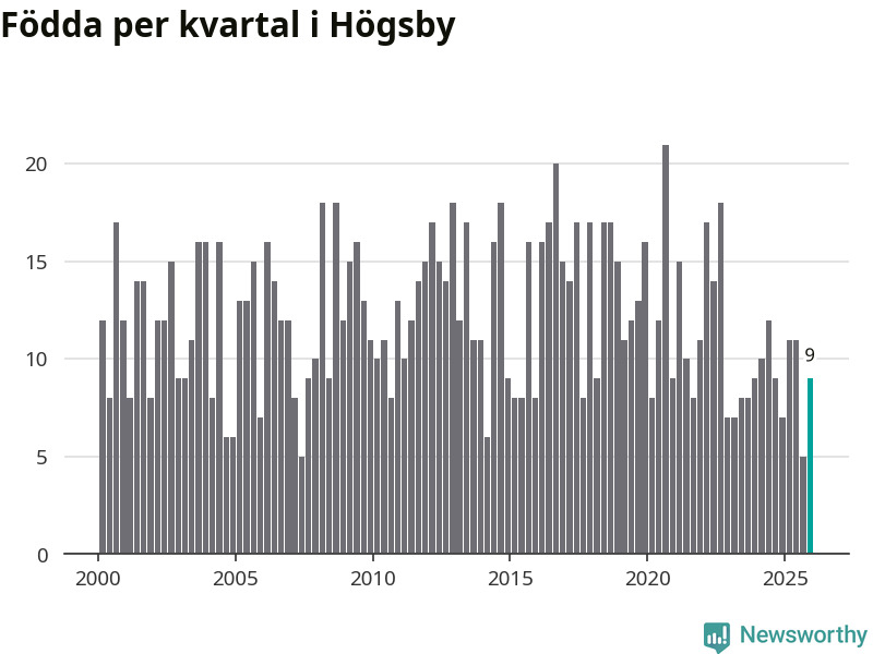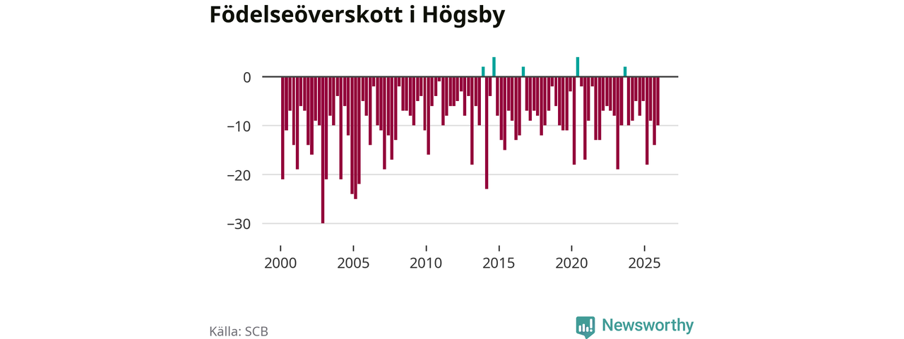 Enligt SCB:s siffror föddes nio barn i Högsby under det senaste kvartalet. Samtidigt avled 19 personer. Högsby hade alltså ett negativt födelsenetto, vilket kommunen historiskt sett nästan alltid har haft.