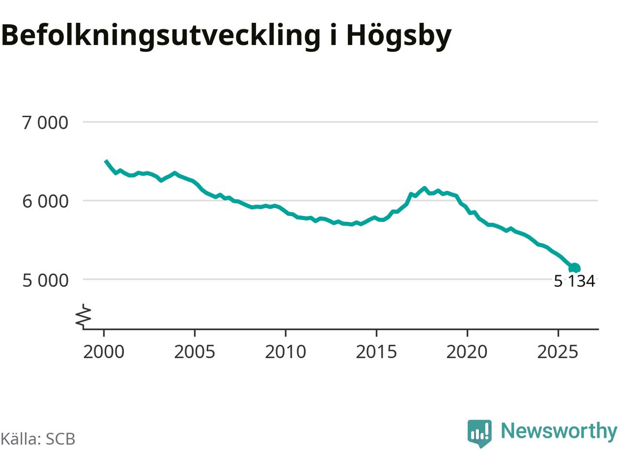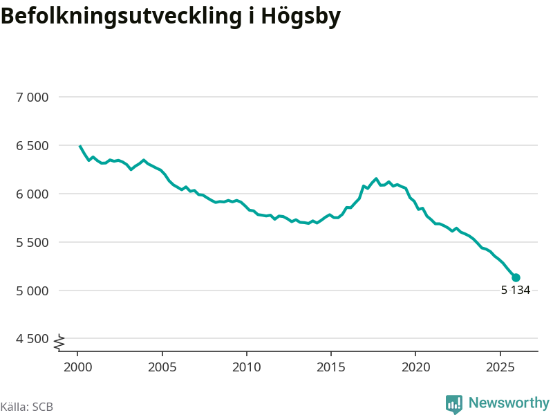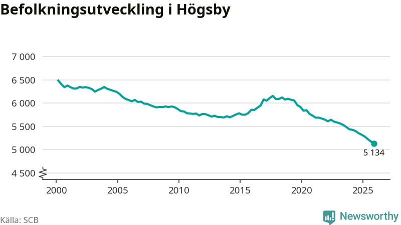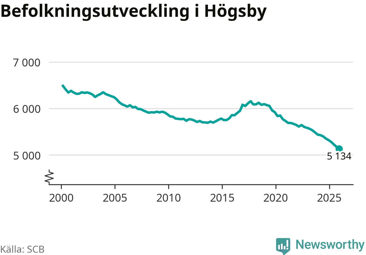 Jämfört med för ett år sedan har befolkningen i Högsby minskat med ungefär 190 personer – vilket motsvarar en nedgång på 3,5 procent. Sedan millennieskiftet har folkmängden minskat med runt 1 350 personer, eller 21 procent. Det är den största minskningen i Kalmar län under den perioden.