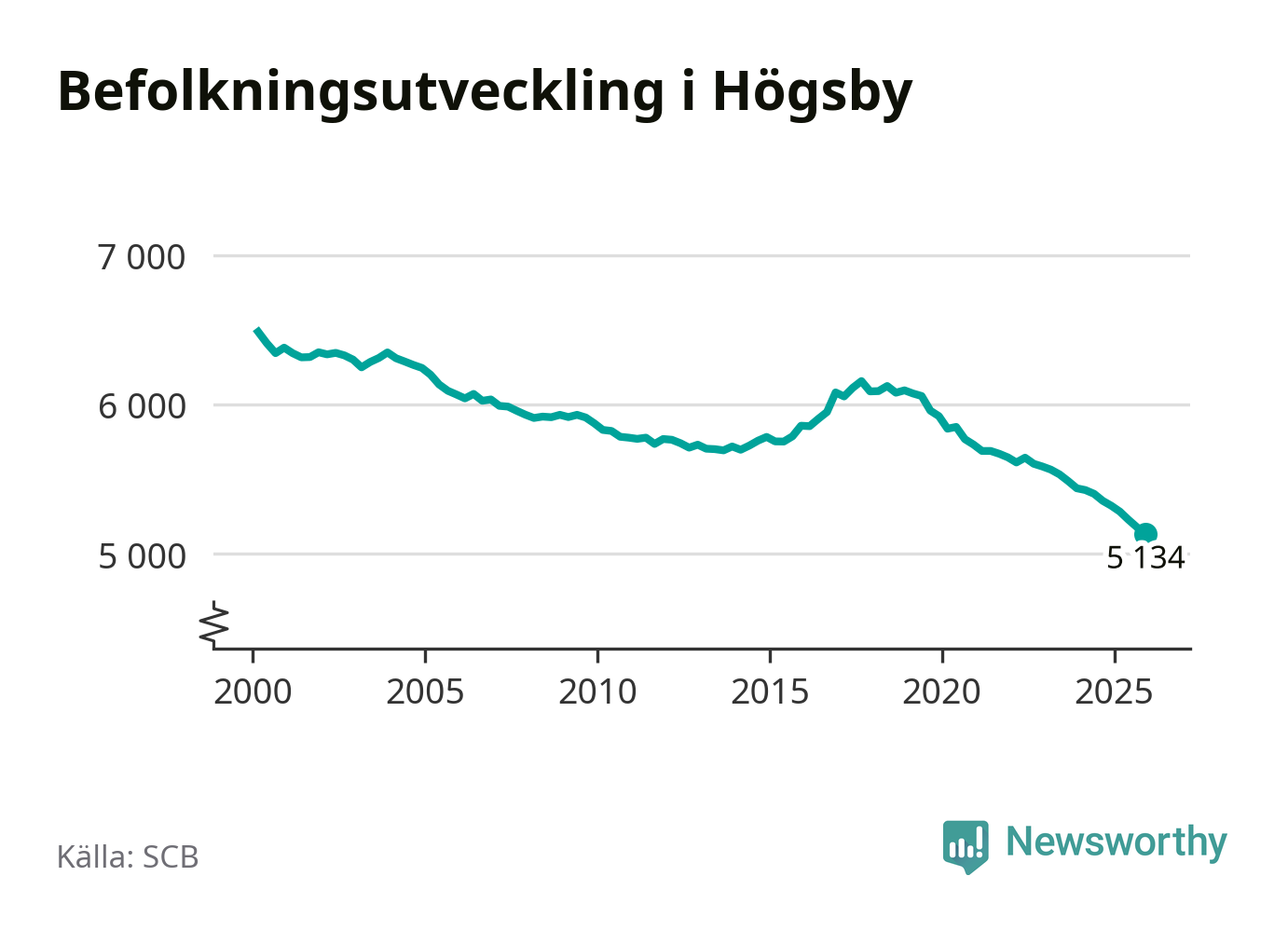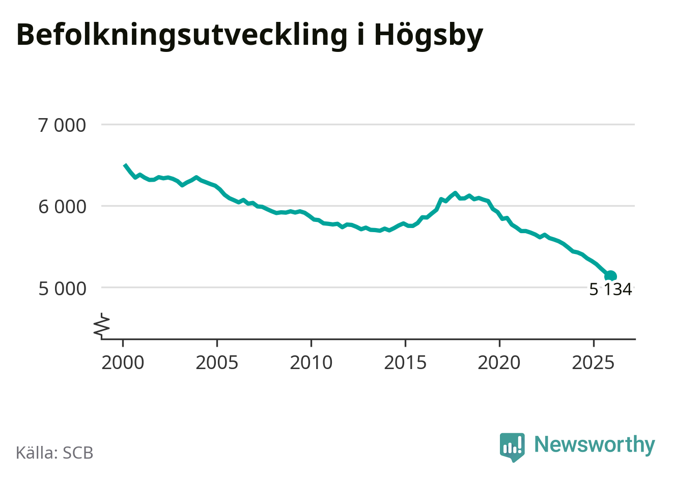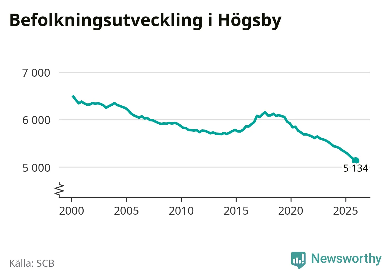 Jämfört med för ett år sedan har befolkningen i Högsby minskat med ungefär 190 personer – vilket motsvarar en nedgång på 3,5 procent. Sedan millennieskiftet har folkmängden minskat med runt 1 350 personer, eller 21 procent. Det är den största minskningen i Kalmar län under den perioden.