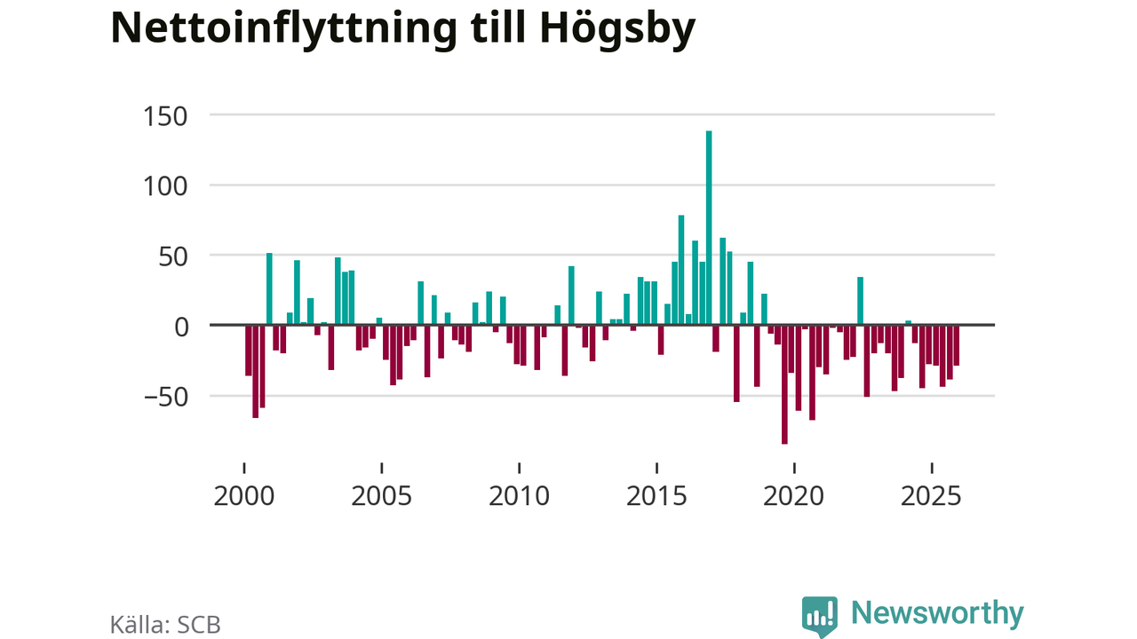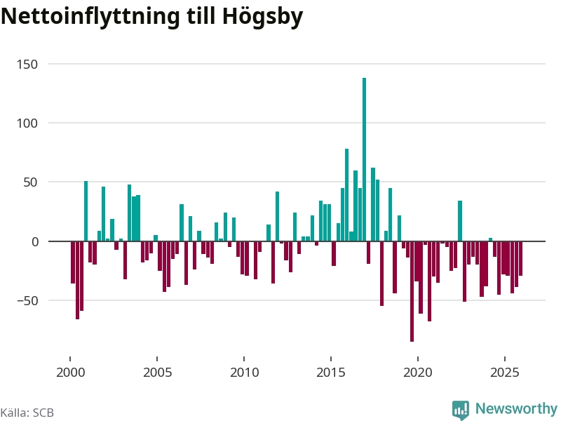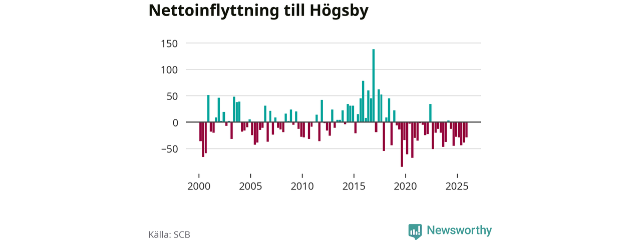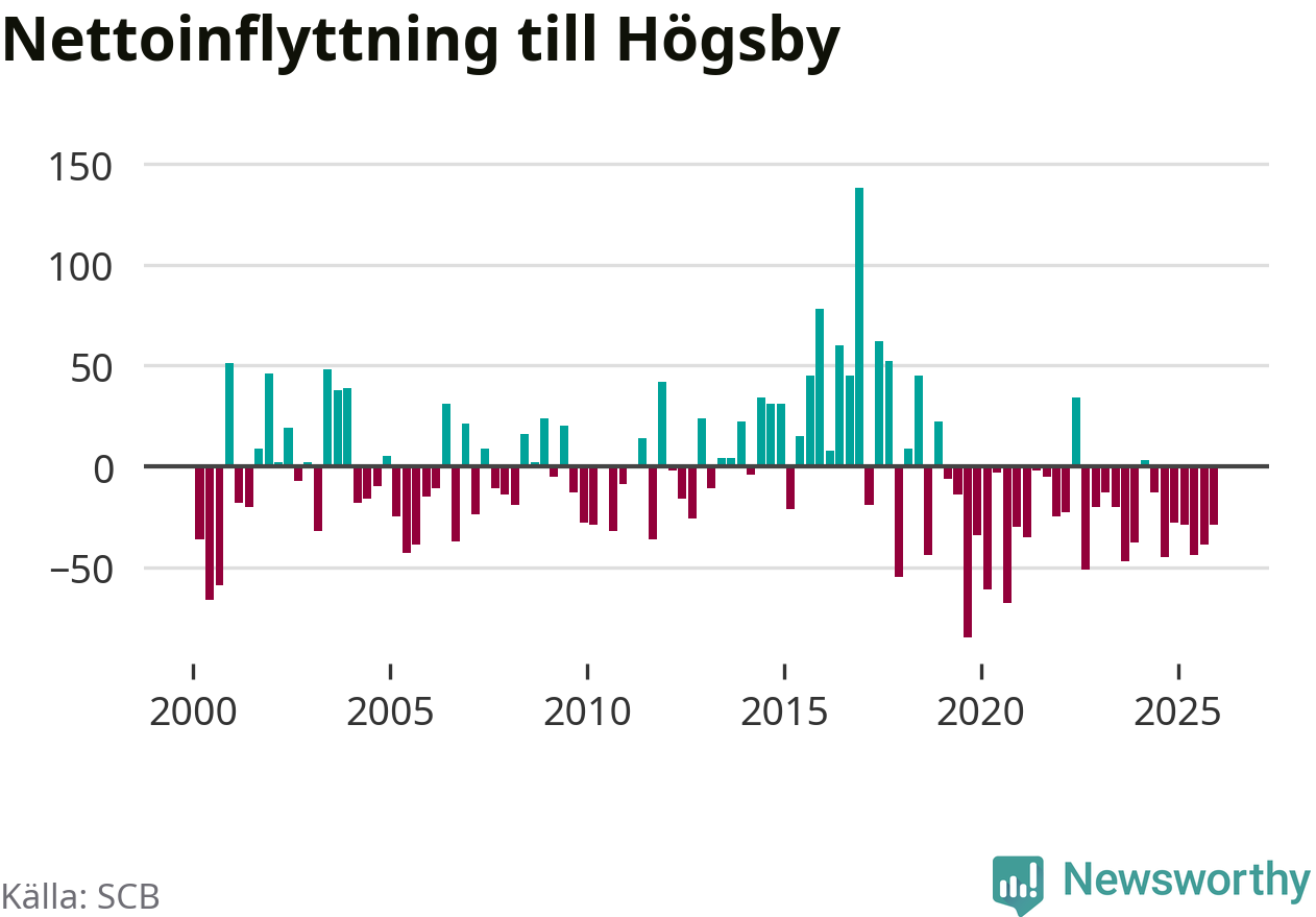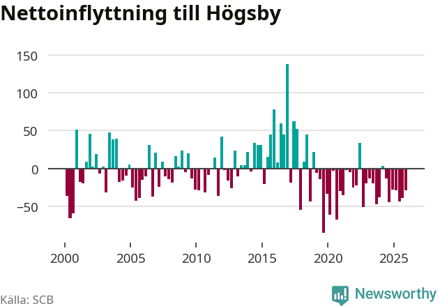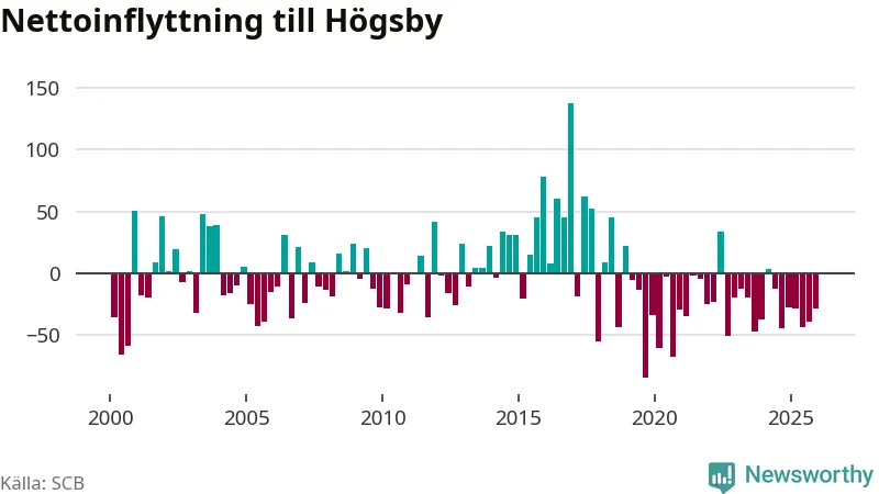 Under fjärde kvartalet 2025 flyttade 54 personer till kommunen medan 83 personer flyttade därifrån. Det är historiskt sett en liten inflyttning under ett kvartal. Sedan seklets början har Högsby oftast haft ett negativt flyttnetto.