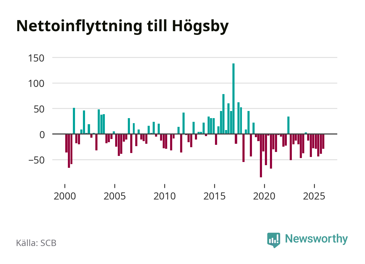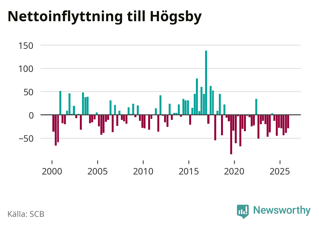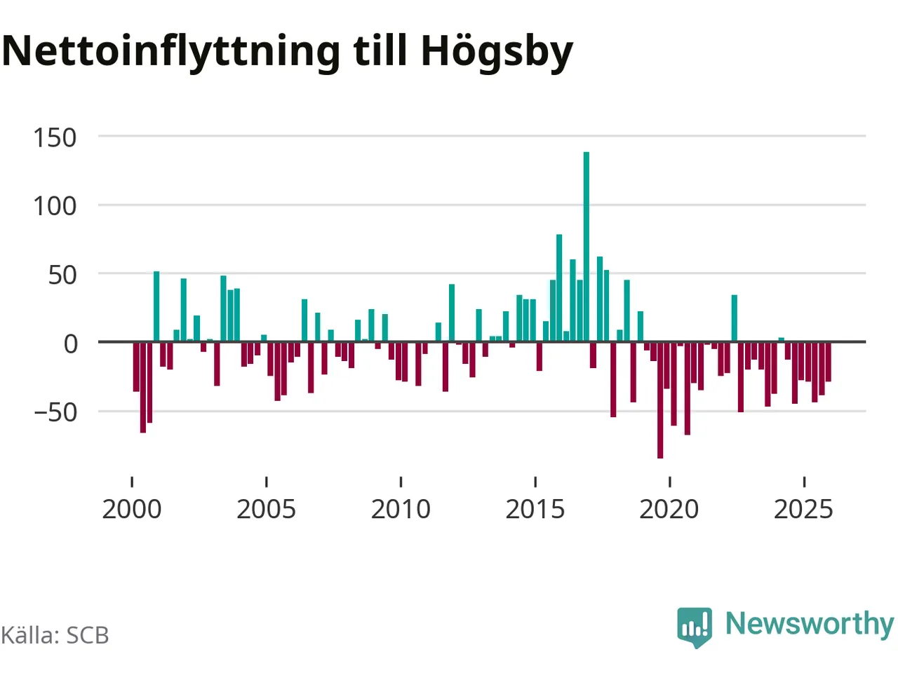 Under fjärde kvartalet 2025 flyttade 54 personer till kommunen medan 83 personer flyttade därifrån. Det är historiskt sett en liten inflyttning under ett kvartal. Sedan seklets början har Högsby oftast haft ett negativt flyttnetto.