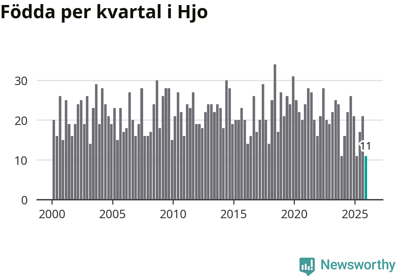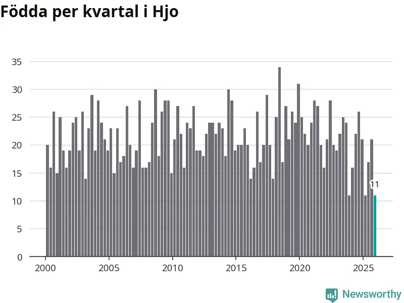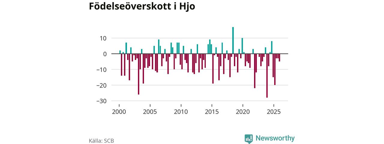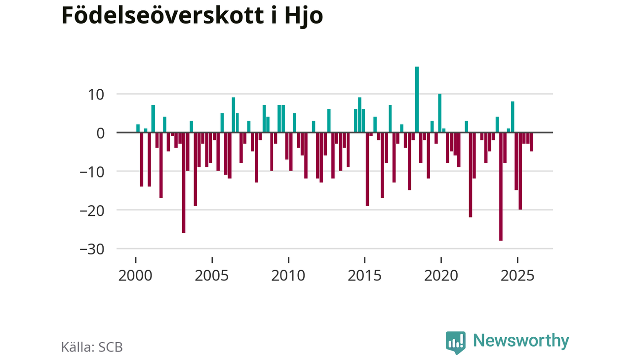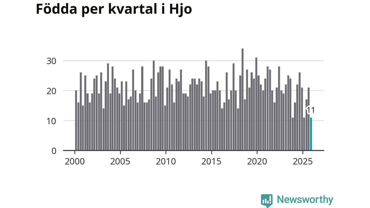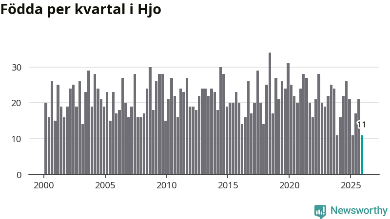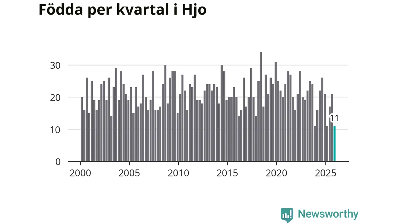 Enligt SCB:s siffror föddes elva barn i Hjo under det senaste kvartalet. Det är det lägsta födelsetal som registrerats i kommunen under 2000-talet. Det finns en osäkerhet här, eftersom SCB lägger på ett slumpmässigt brus på alla siffror. Klart är i alla fall att det rör sig om historiskt låga nivåer. Samtidigt avled 16 personer. Skillnaden mellan antal födda och döda är så liten att det inte går att säga om det beror på något annat än SCB:s röjandeskydd. Kommunen har oftast haft negativt födelsenetto tidigare.