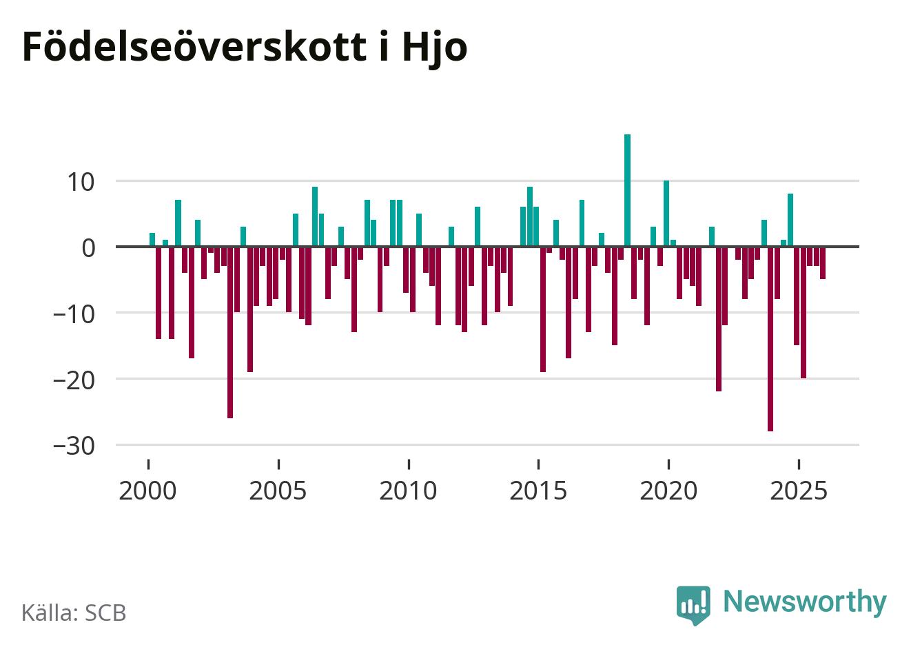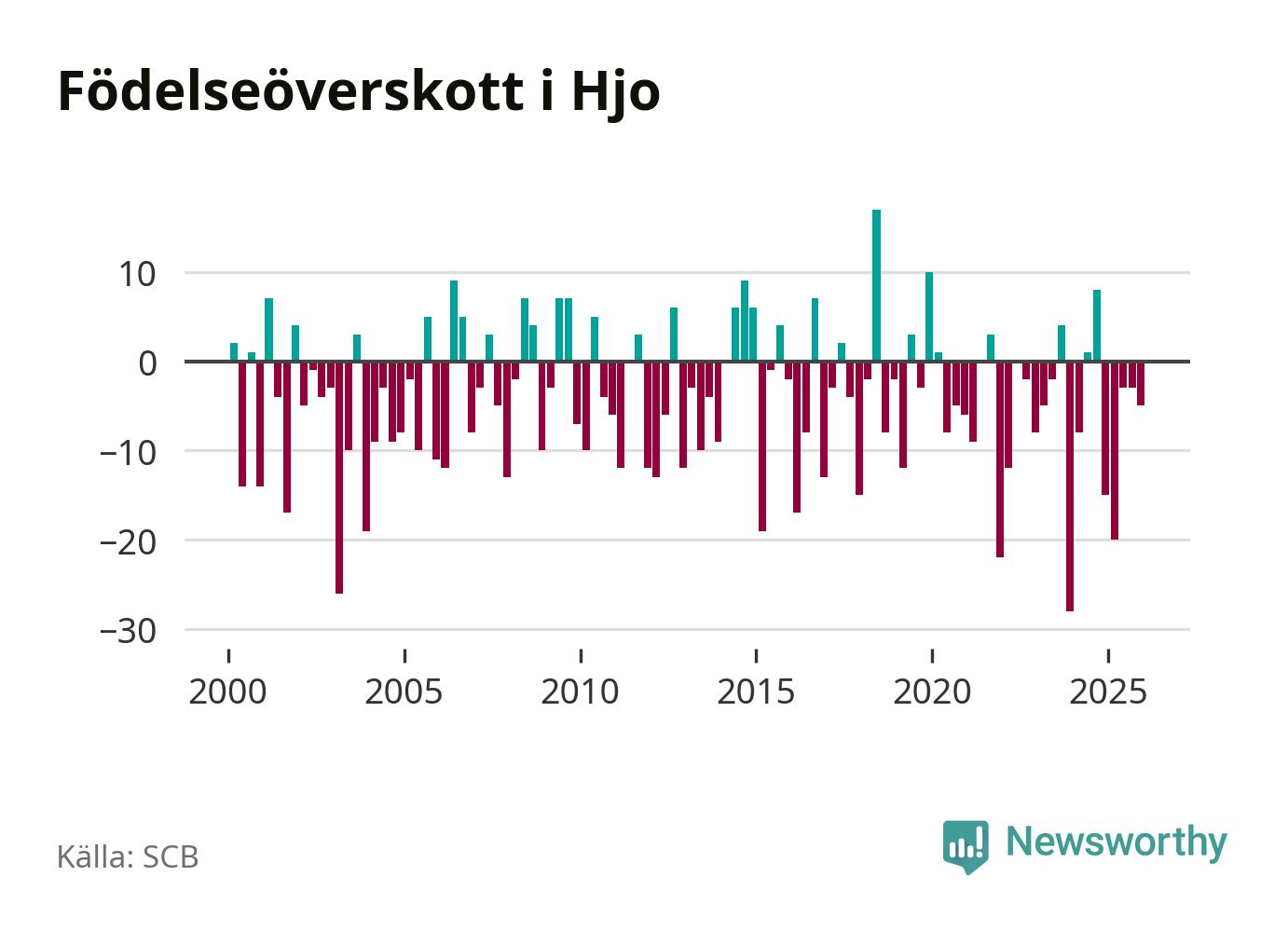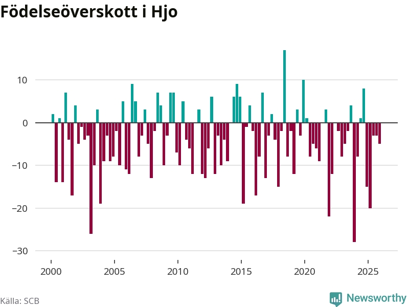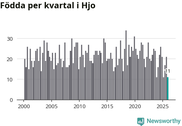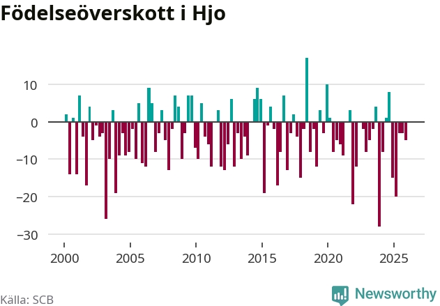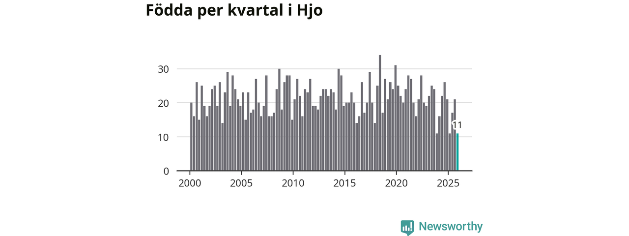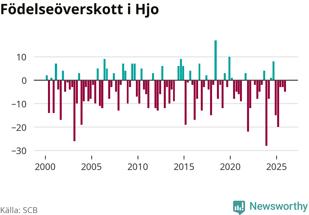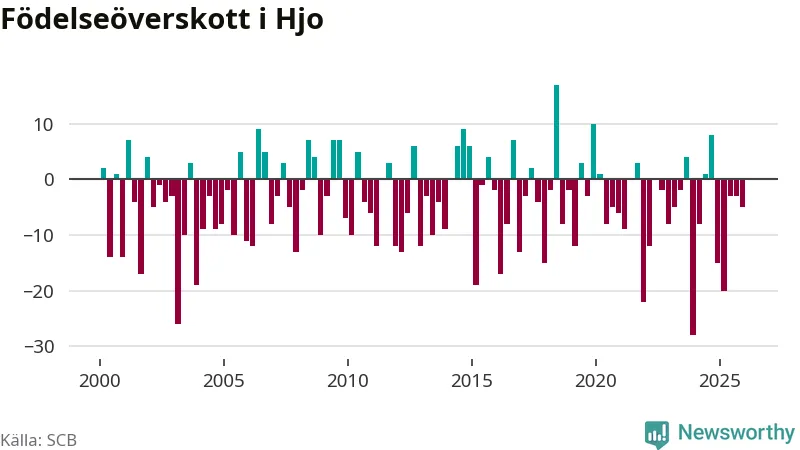 Enligt SCB:s siffror föddes elva barn i Hjo under det senaste kvartalet. Det är det lägsta födelsetal som registrerats i kommunen under 2000-talet. Det finns en osäkerhet här, eftersom SCB lägger på ett slumpmässigt brus på alla siffror. Klart är i alla fall att det rör sig om historiskt låga nivåer. Samtidigt avled 16 personer. Skillnaden mellan antal födda och döda är så liten att det inte går att säga om det beror på något annat än SCB:s röjandeskydd. Kommunen har oftast haft negativt födelsenetto tidigare.