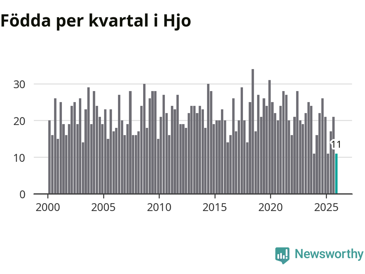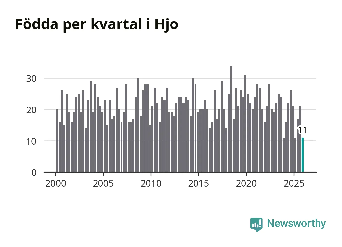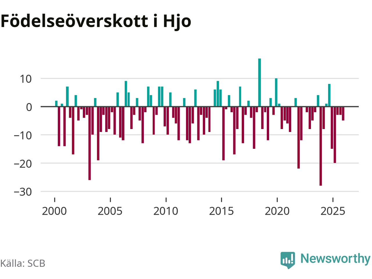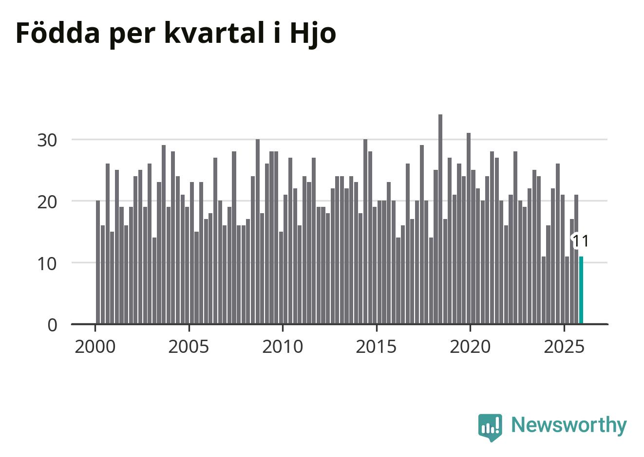 Enligt SCB:s siffror föddes elva barn i Hjo under det senaste kvartalet. Det är det lägsta födelsetal som registrerats i kommunen under 2000-talet. Det finns en osäkerhet här, eftersom SCB lägger på ett slumpmässigt brus på alla siffror. Klart är i alla fall att det rör sig om historiskt låga nivåer. Samtidigt avled 16 personer. Skillnaden mellan antal födda och döda är så liten att det inte går att säga om det beror på något annat än SCB:s röjandeskydd. Kommunen har oftast haft negativt födelsenetto tidigare.