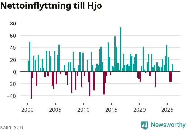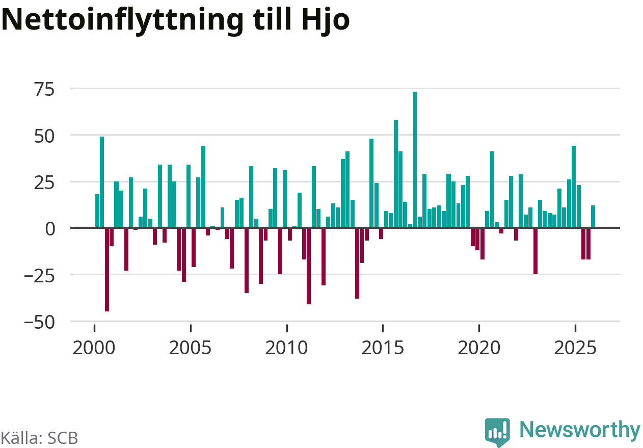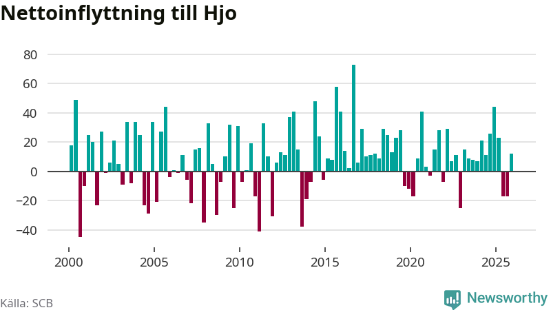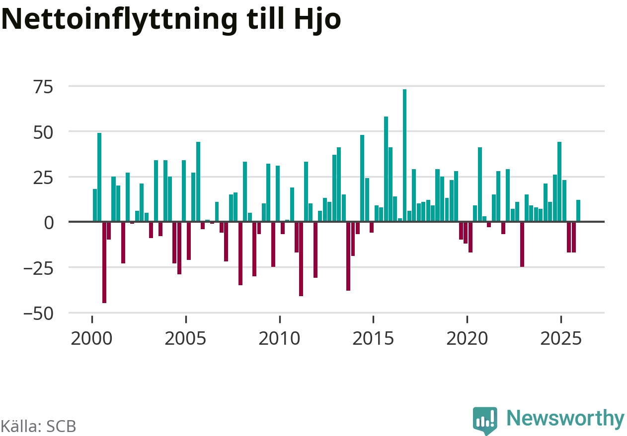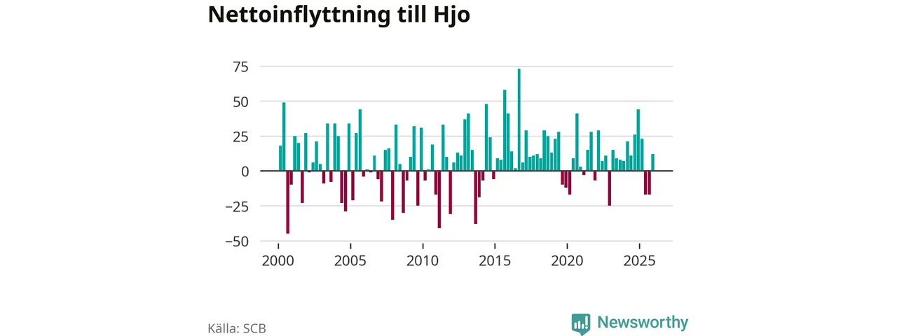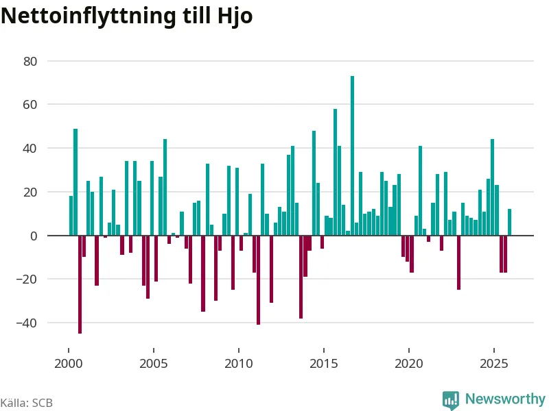 Under fjärde kvartalet 2025 flyttade 96 personer till kommunen medan 84 personer flyttade därifrån. Sedan seklets början har Hjo haft ett positivt flyttnetto under nästan alla kvartal, inklusive det senaste kvartalet.