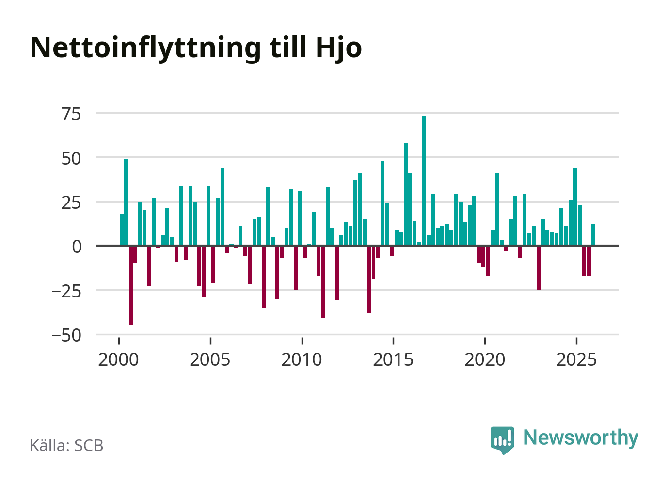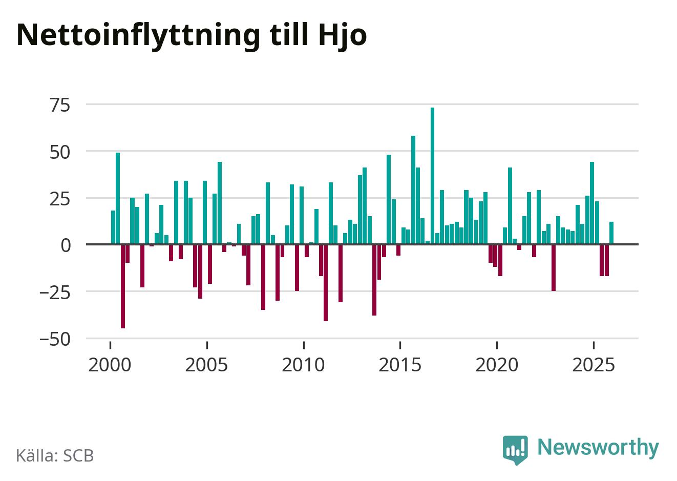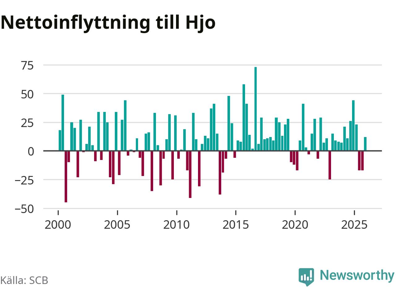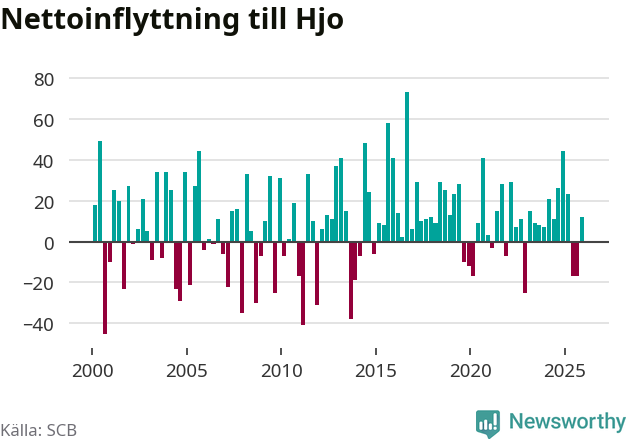 Under fjärde kvartalet 2025 flyttade 96 personer till kommunen medan 84 personer flyttade därifrån. Sedan seklets början har Hjo haft ett positivt flyttnetto under nästan alla kvartal, inklusive det senaste kvartalet.