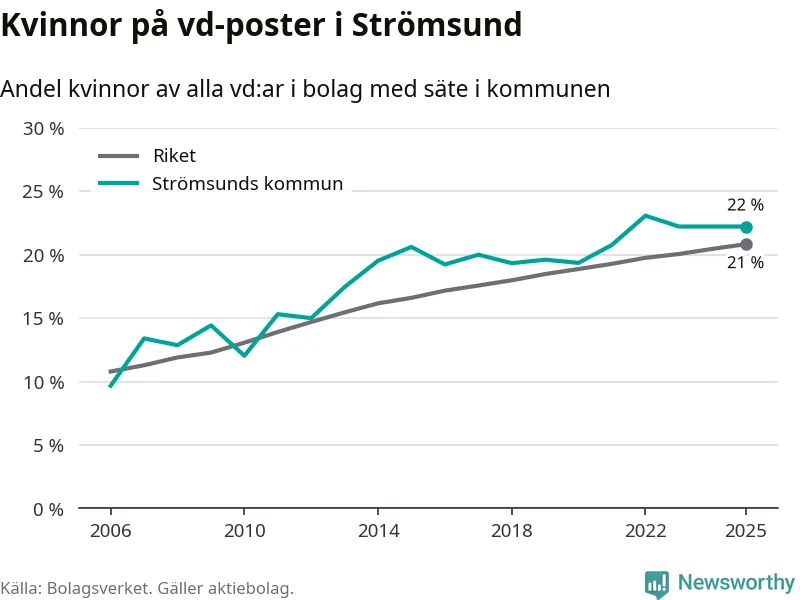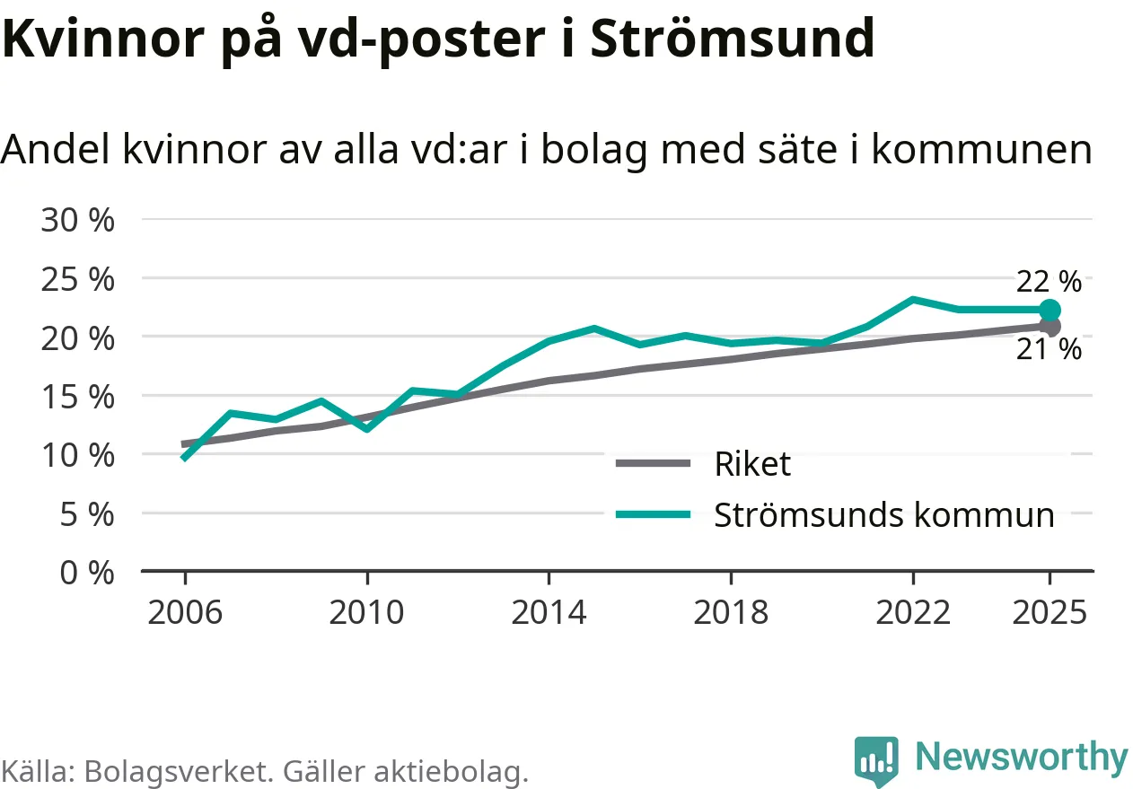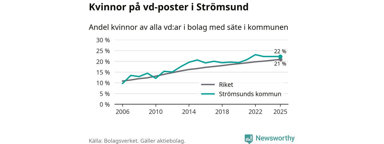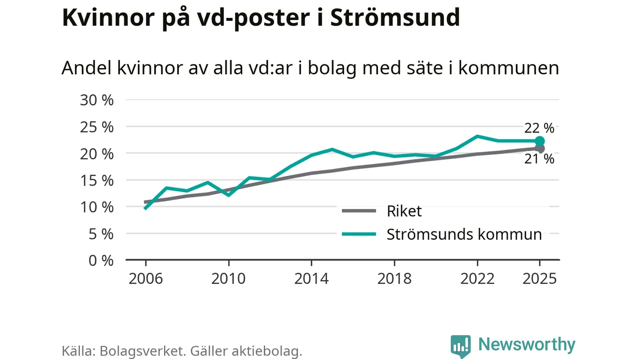 22 procent av aktiebolagen med registrerad vd i Strömsund hade en kvinna på posten vid årsskiftet. Det innebär att på varje kvinnlig vd går nästan fyra män.
