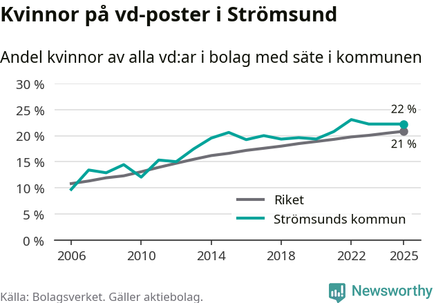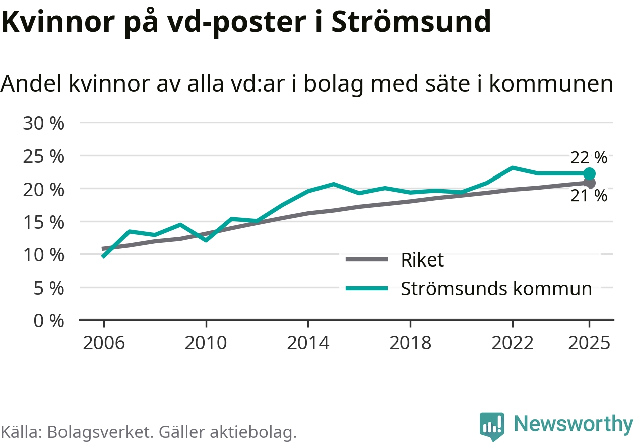 Det är fortfarande män som är vd i nästan fyra av fem bolag i Sverige och könsfördelningen alltså ser ungefär likadan ut i Strömsund. Högst andel kvinnliga vd:ar i Jämtland har företagen med säte i Ragunda kommun, 26 procent. Lägst är andelen bland företagen med säte i Bräcke kommun, 15 procent. I både Ragunda och Bräcke rör det sig om relativt få företag totalt och även små förändringar får stora utslag i andelen kvinnliga vd:ar.
