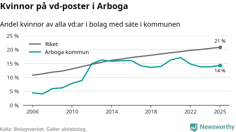 14 procent av aktiebolagen med registrerad vd i Arboga hade en kvinna på posten vid årsskiftet. Det innebär att på varje kvinnlig vd går sex män.