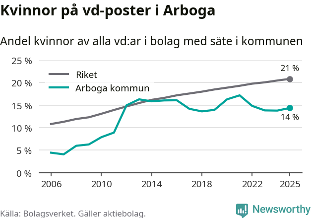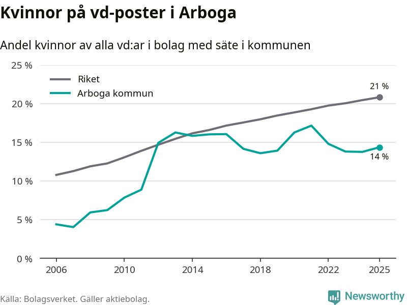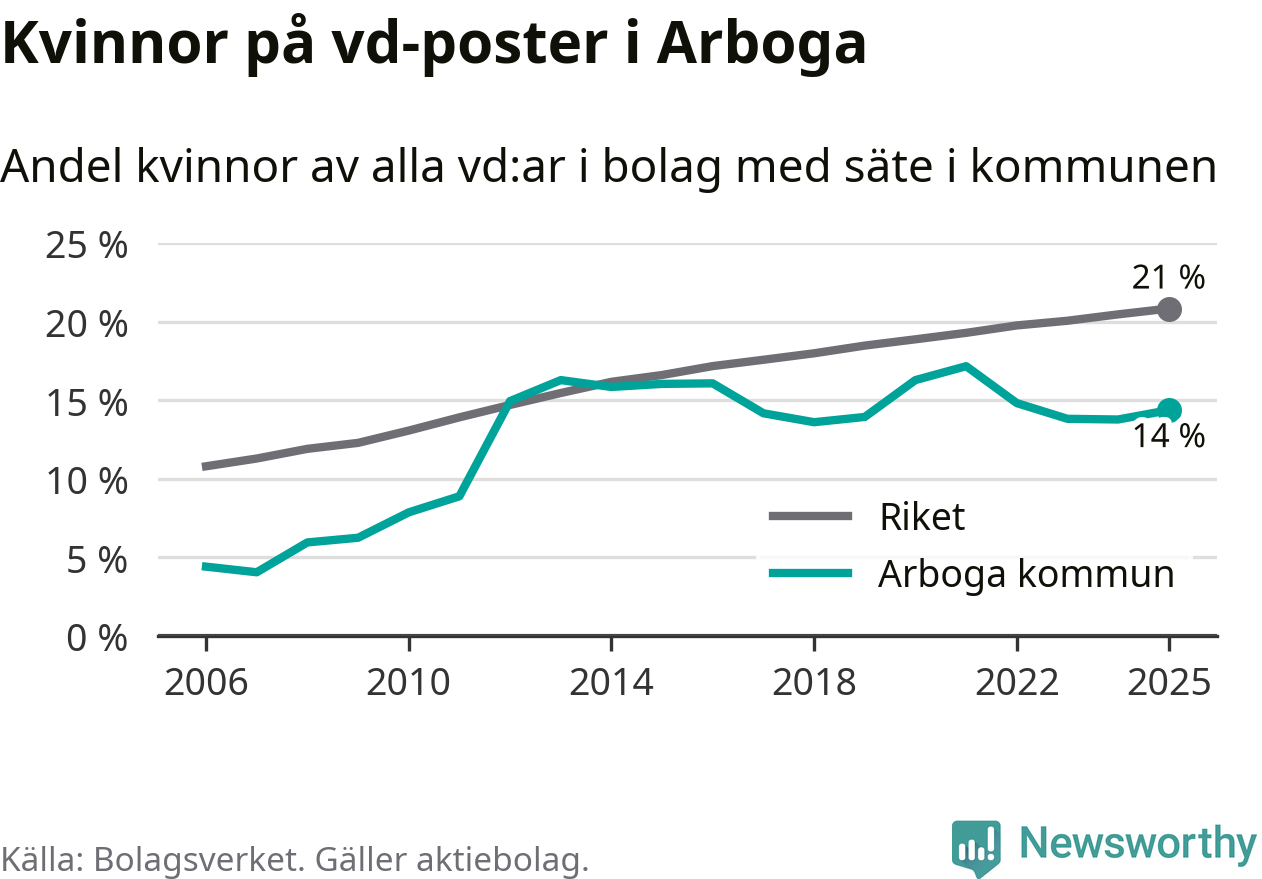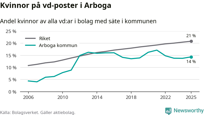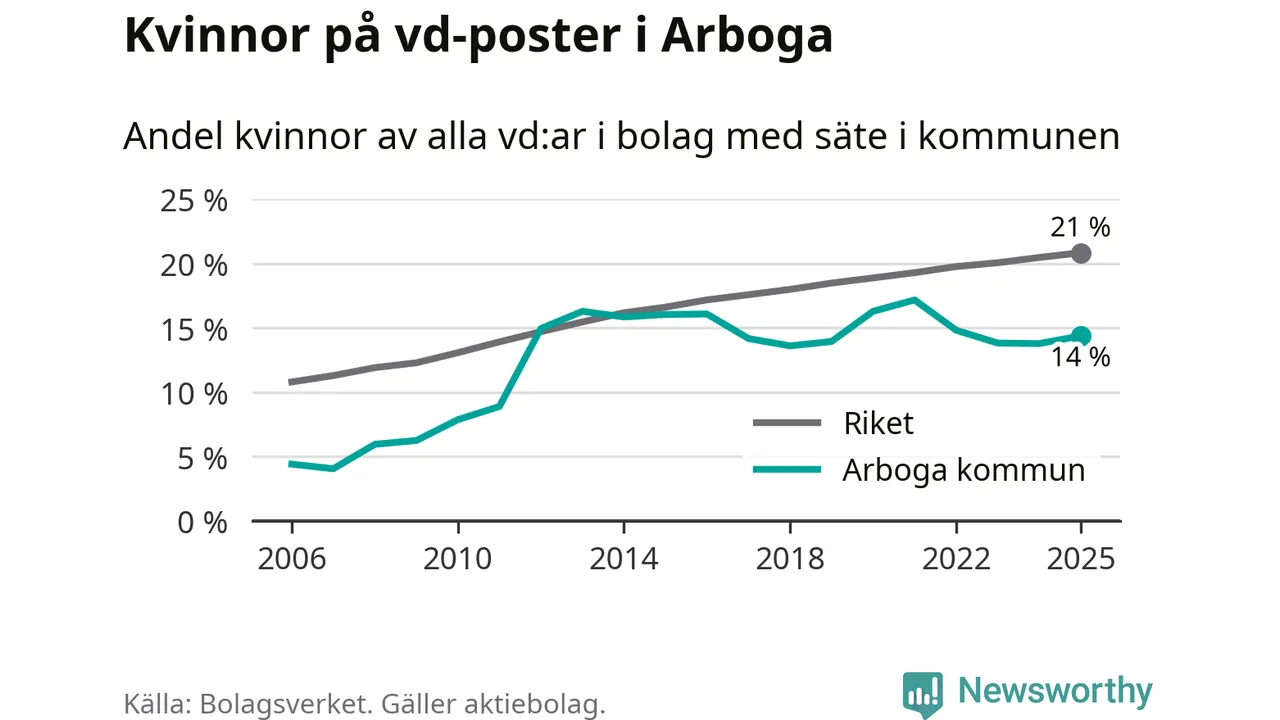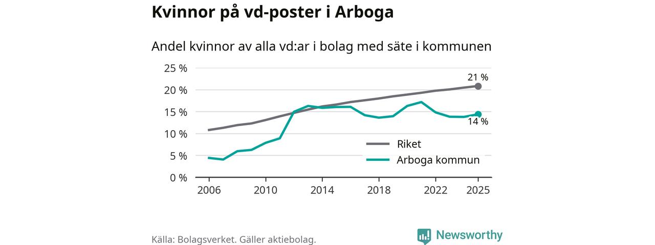 Det är fortfarande män som är vd i nästan fyra av fem bolag i Sverige och i Arboga är det alltså en lägre andel kvinnor på vd-posten. 14 procent är den näst lägsta andelen av kommunerna i Västmanland. Högst andel kvinnliga vd:ar i Västmanland har företagen med säte i Skinnskattebergs kommun, 27 procent. Där rör det sig dock om relativt få företag – 51 stycken totalt – och även små förändringar får stora utslag i andelen kvinnliga vd:ar. Lägst är andelen bland företagen med säte i Fagersta kommun, 11 procent.