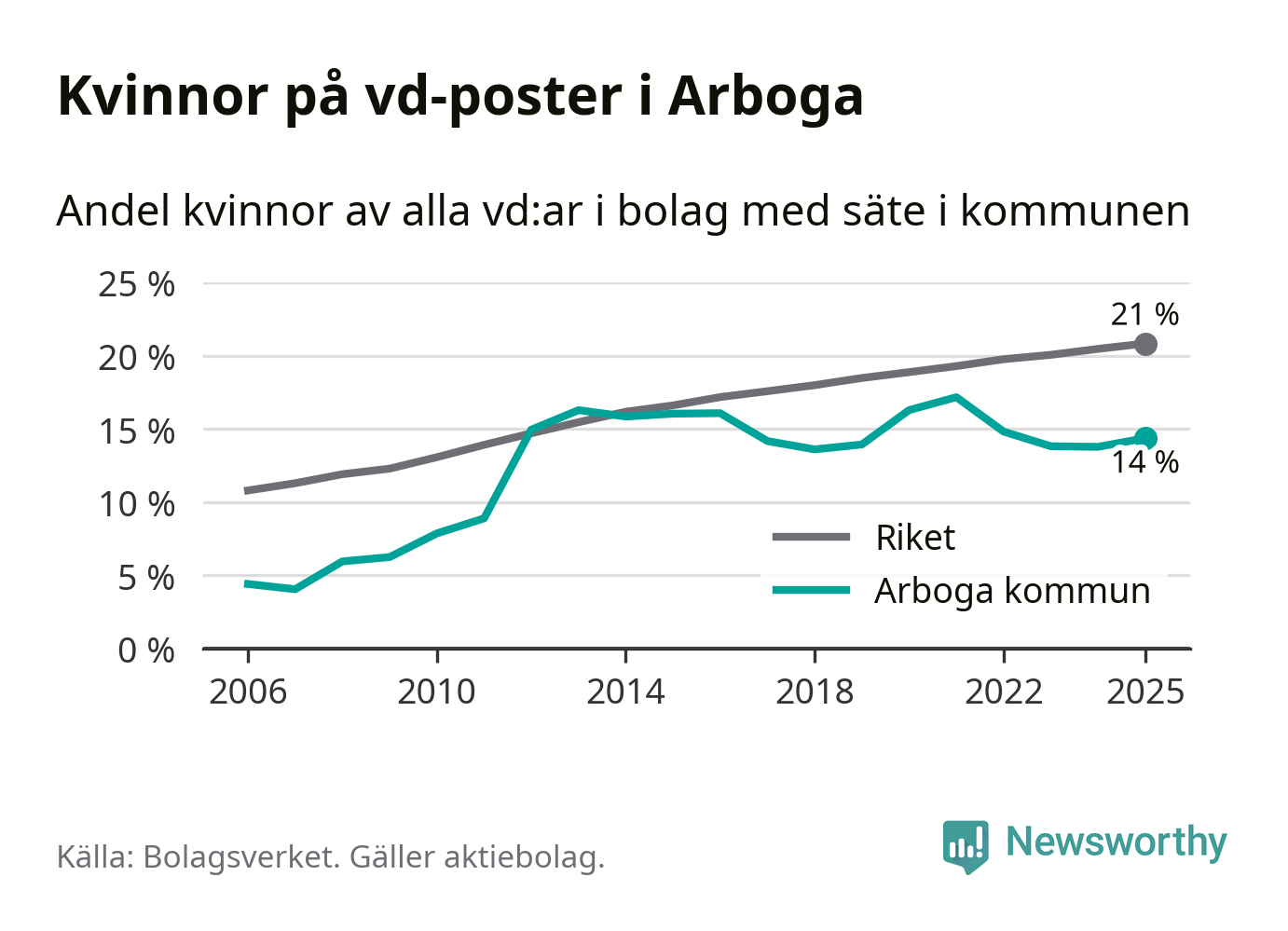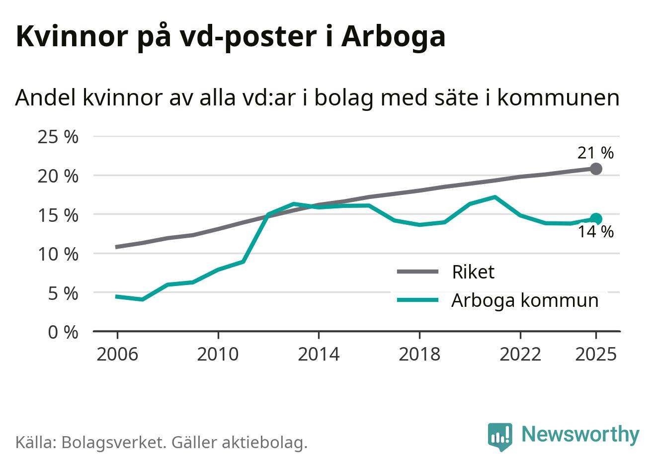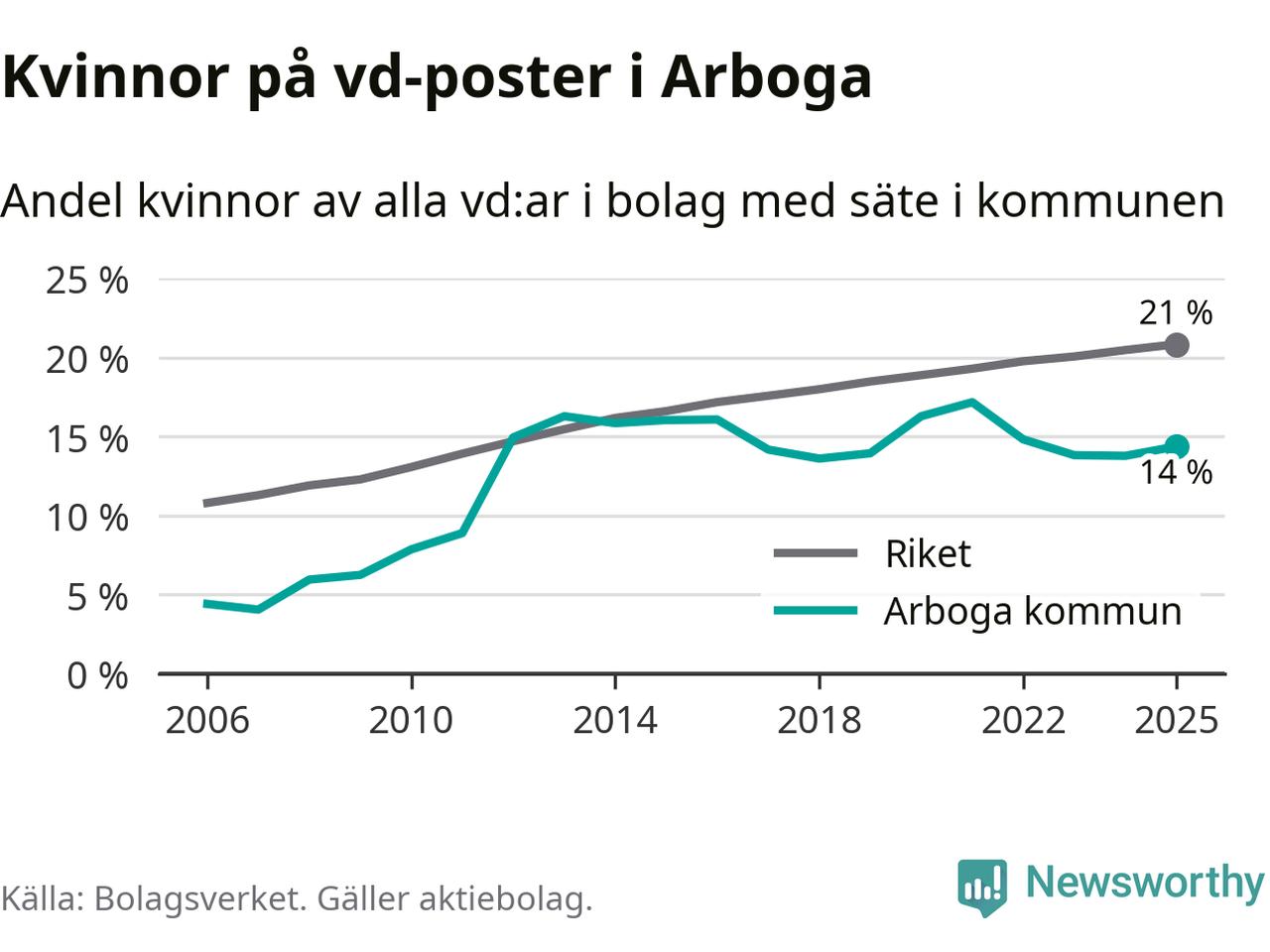 Det är fortfarande män som är vd i nästan fyra av fem bolag i Sverige och i Arboga är det alltså en lägre andel kvinnor på vd-posten. 14 procent är den näst lägsta andelen av kommunerna i Västmanland. Högst andel kvinnliga vd:ar i Västmanland har företagen med säte i Skinnskattebergs kommun, 27 procent. Där rör det sig dock om relativt få företag – 51 stycken totalt – och även små förändringar får stora utslag i andelen kvinnliga vd:ar. Lägst är andelen bland företagen med säte i Fagersta kommun, 11 procent.