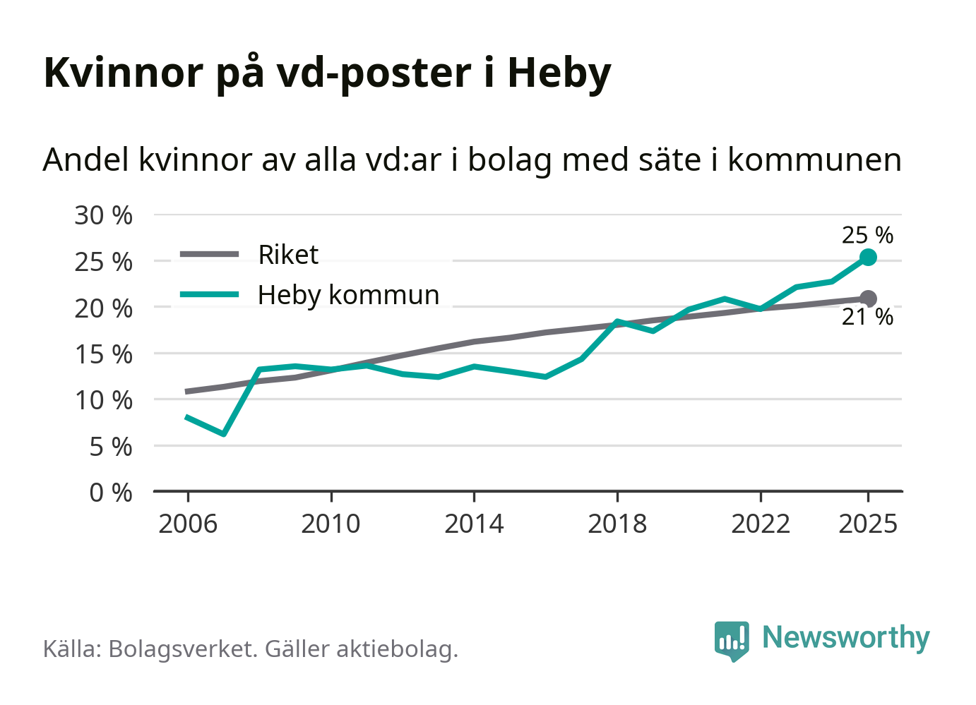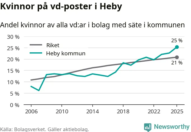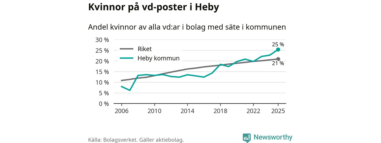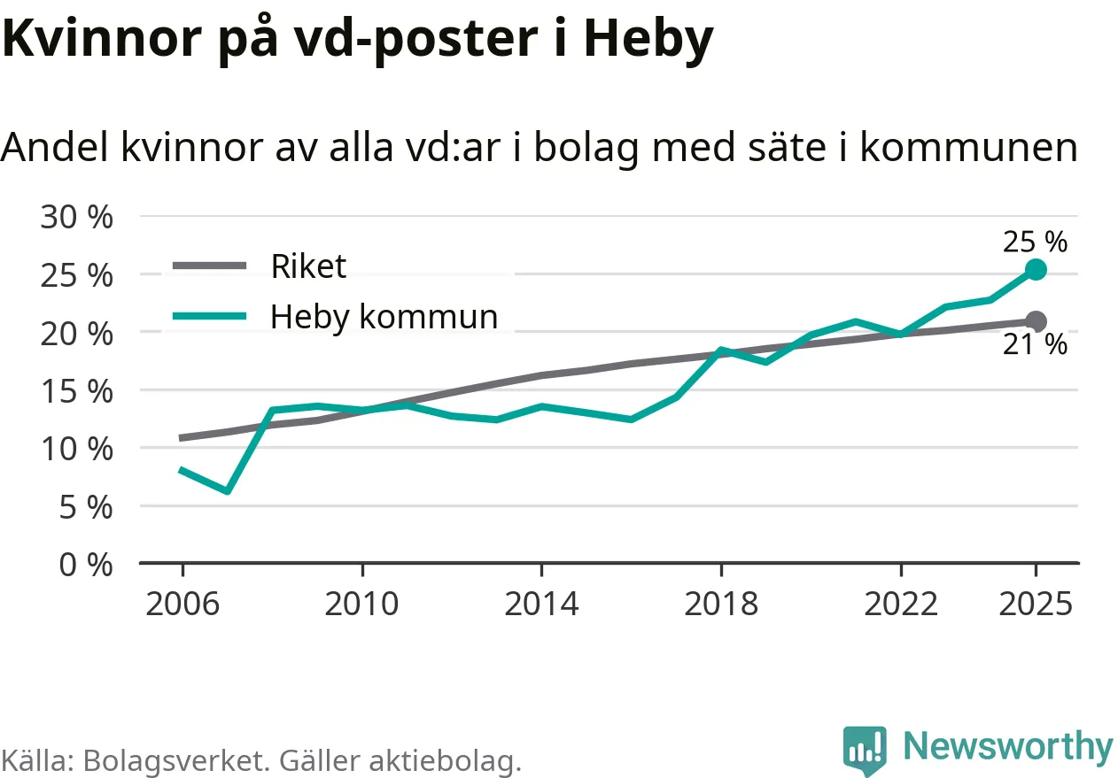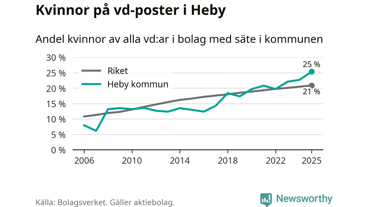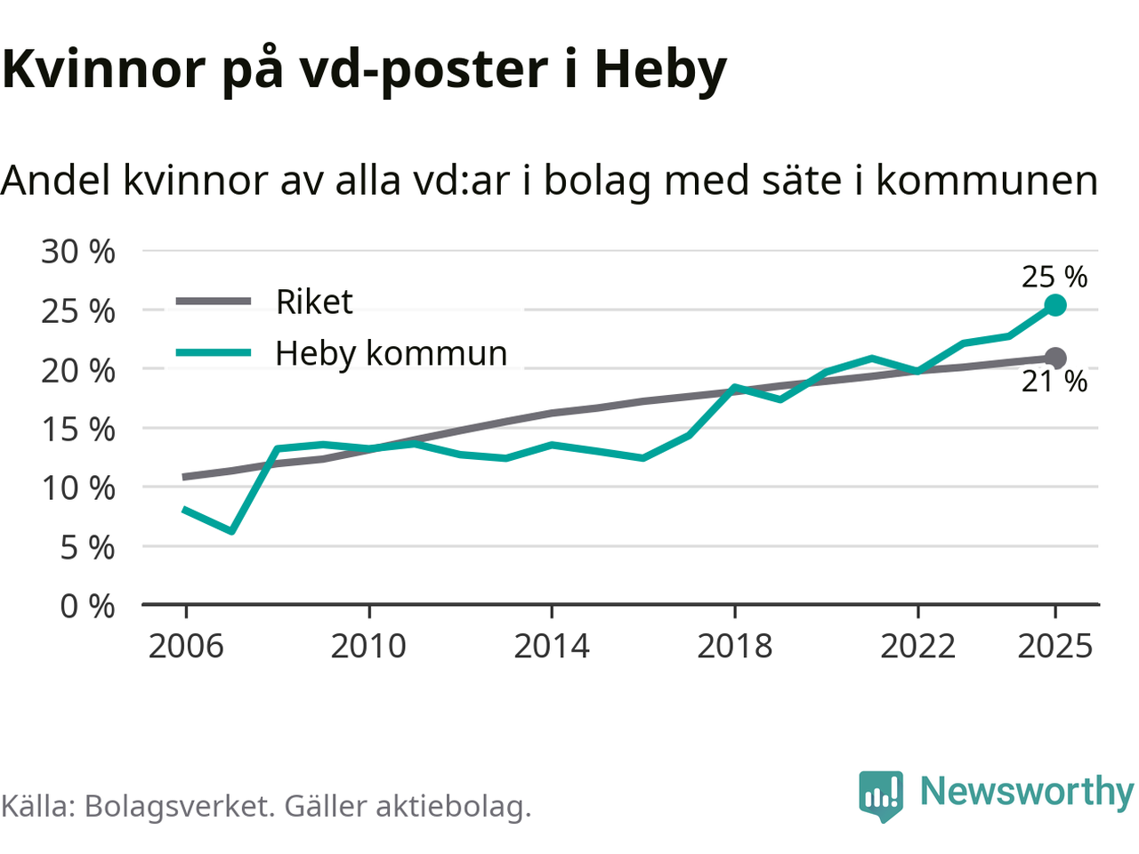 Det är fortfarande män som är vd i nästan fyra av fem bolag i Sverige, men i Heby är det alltså en högre andel kvinnor på vd-posten. 25 procent är den högsta andelen av kommunerna i Uppsala län. Lägsta andelen kvinnor i länet har företagen med säte i Tierps kommun, 17 procent.