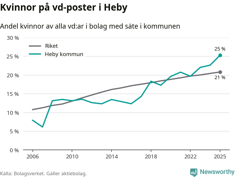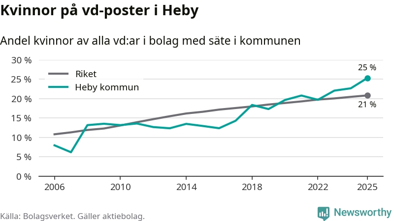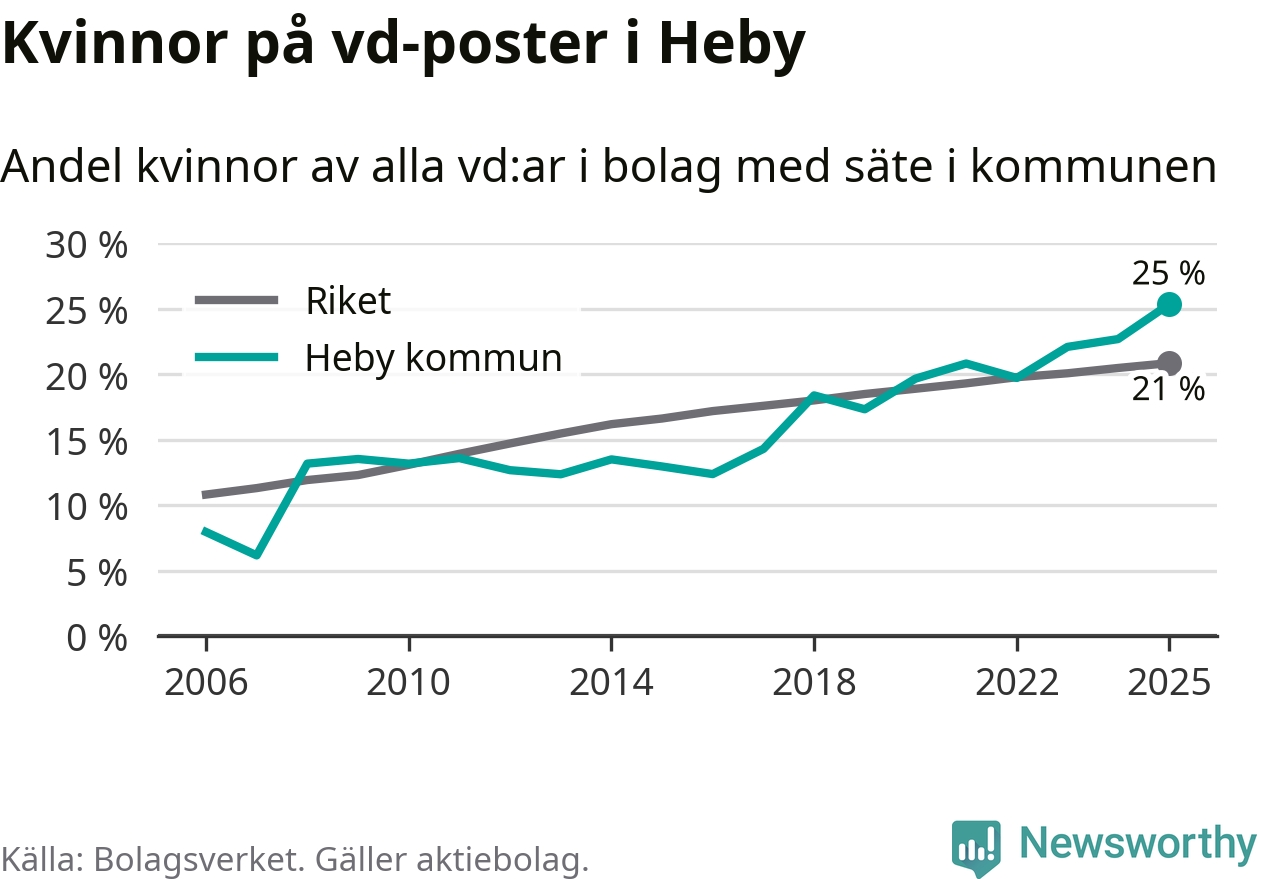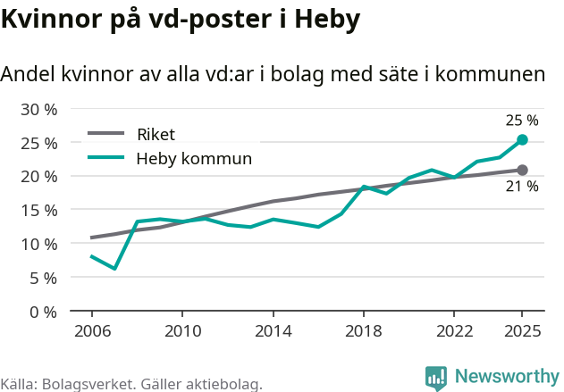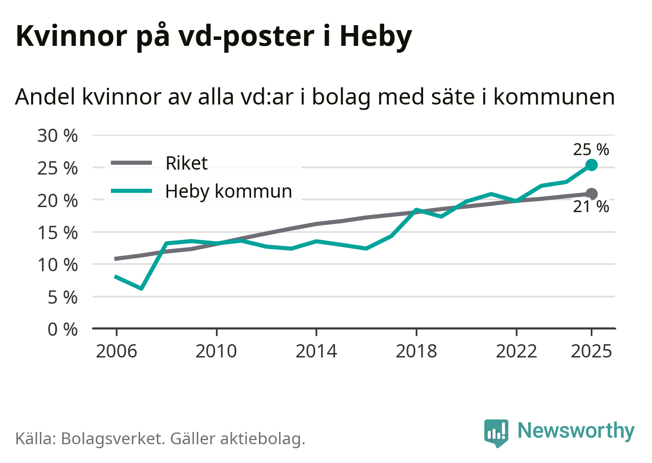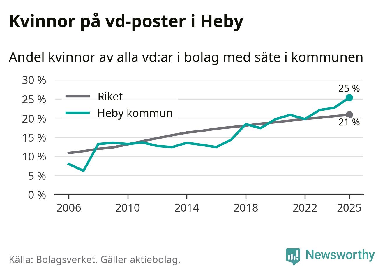 Det är fortfarande män som är vd i nästan fyra av fem bolag i Sverige, men i Heby är det alltså en högre andel kvinnor på vd-posten. 25 procent är den högsta andelen av kommunerna i Uppsala län. Lägsta andelen kvinnor i länet har företagen med säte i Tierps kommun, 17 procent.