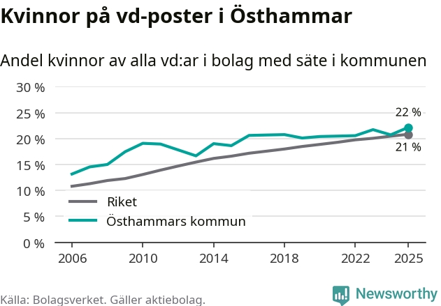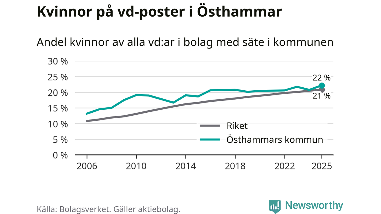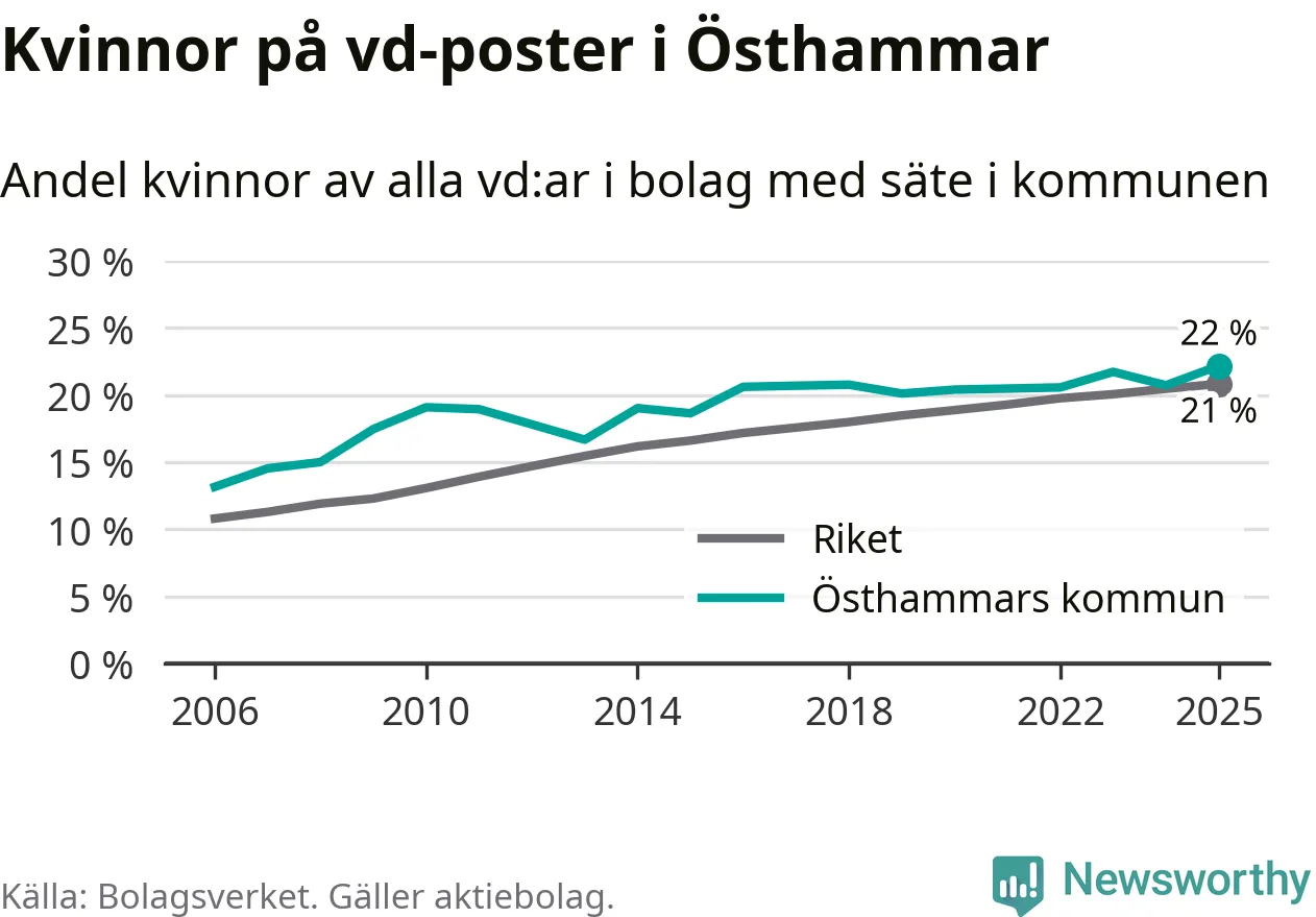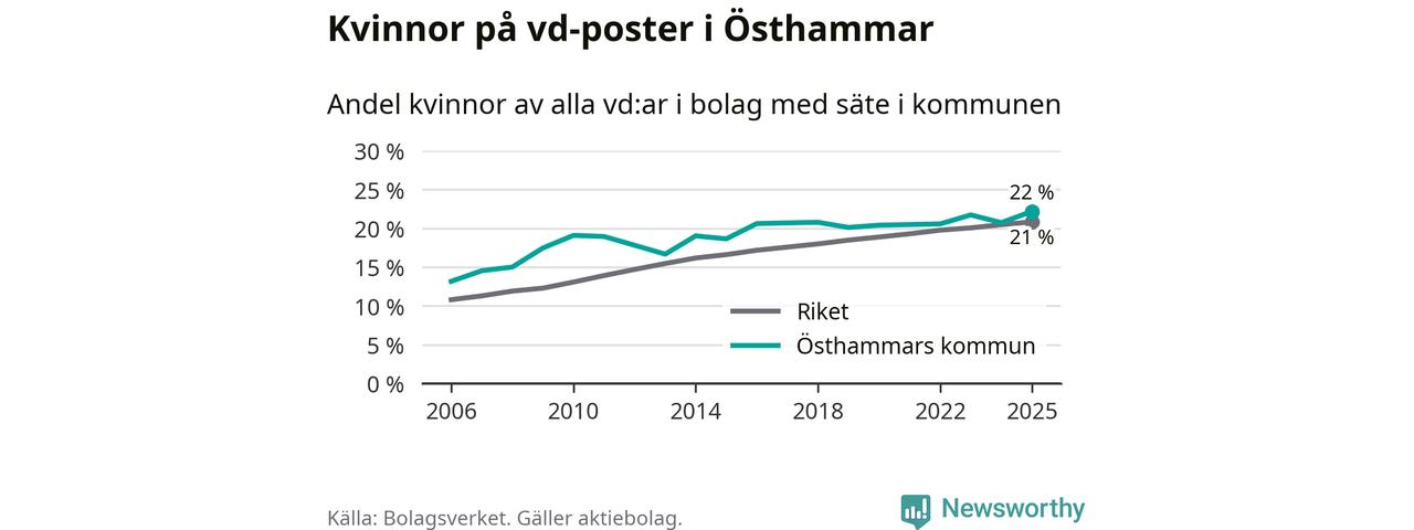 22 procent av aktiebolagen med registrerad vd i Östhammar hade en kvinna på posten vid årsskiftet. Det innebär att på varje kvinnlig vd går nästan fyra män.