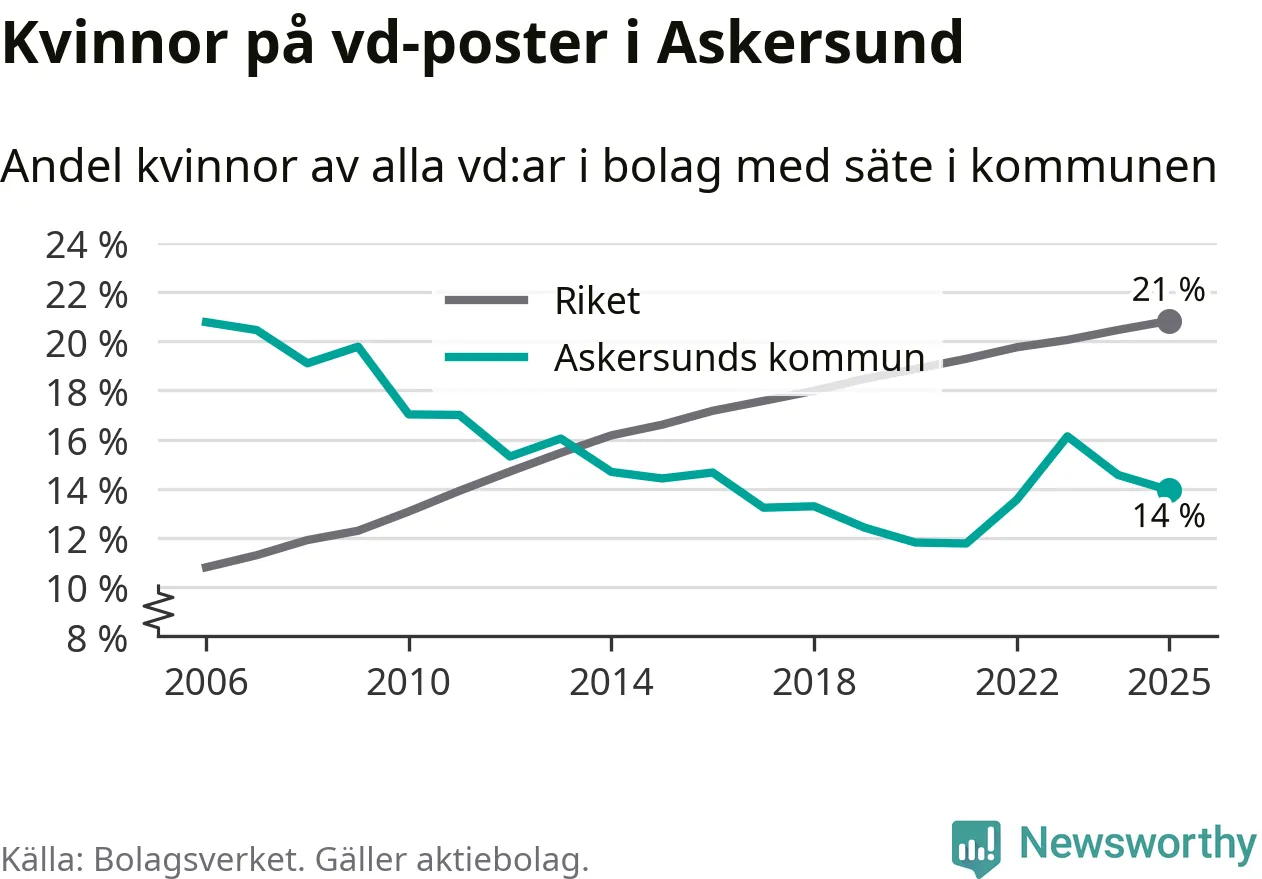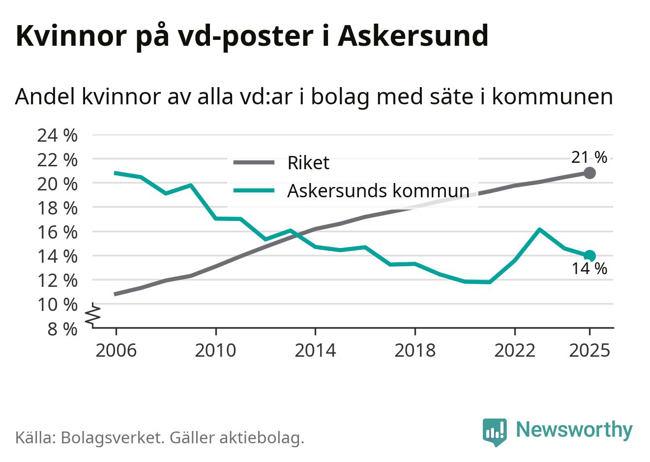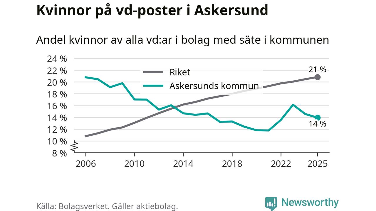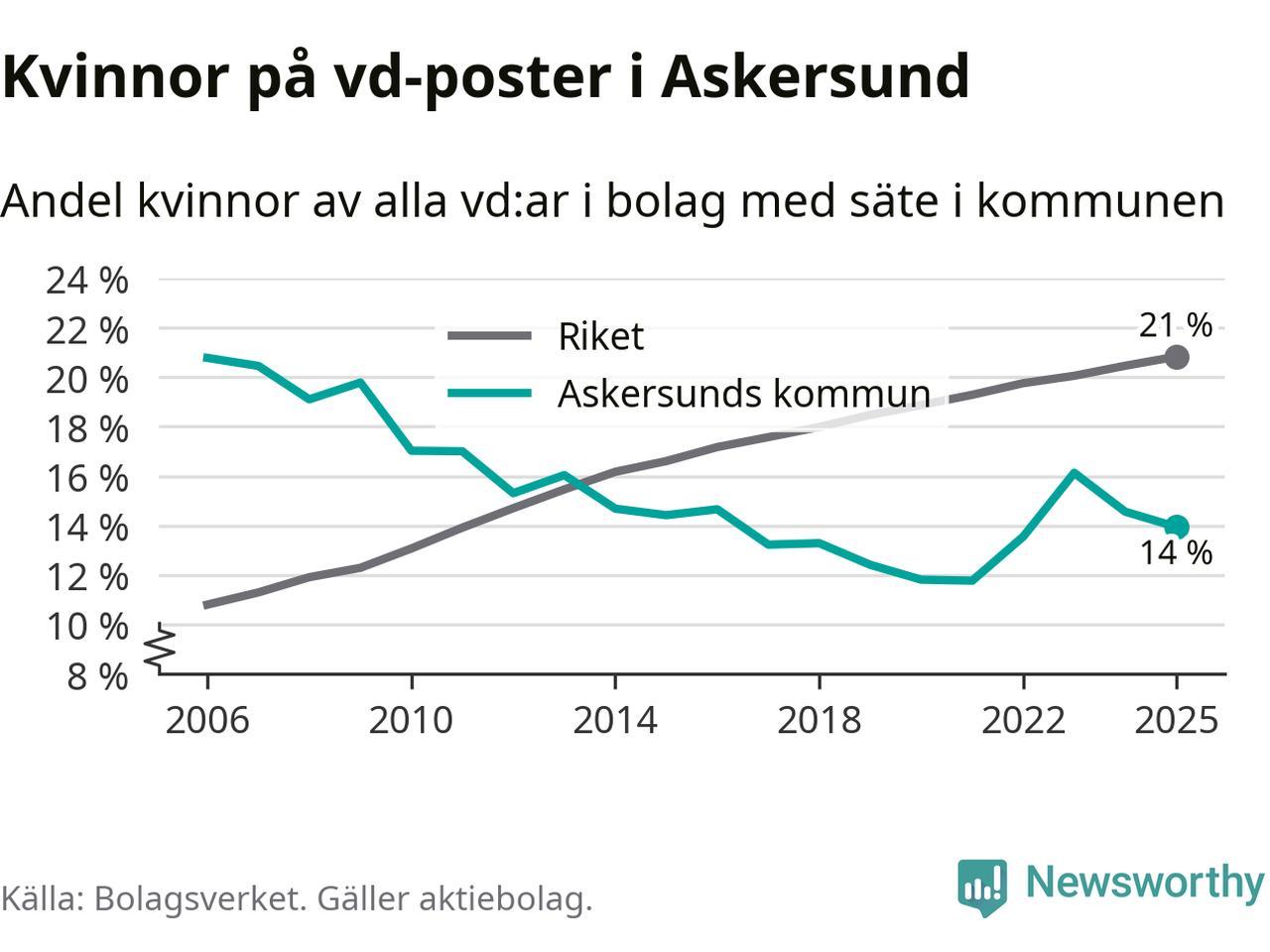 Det är fortfarande män som är vd i nästan fyra av fem bolag i Sverige och i Askersund är det alltså en lägre andel kvinnor på vd-posten. 14 procent är den näst lägsta andelen av kommunerna i Örebro län. Högst andel kvinnliga vd:ar i Örebro län har företagen med säte i Lekebergs kommun, 33 procent. Lägst är andelen bland företagen med säte i Laxå kommun, 6 procent. I både Lekeberg och Laxå rör det sig om relativt få företag totalt och även små förändringar får stora utslag i andelen kvinnliga vd:ar.