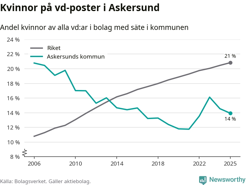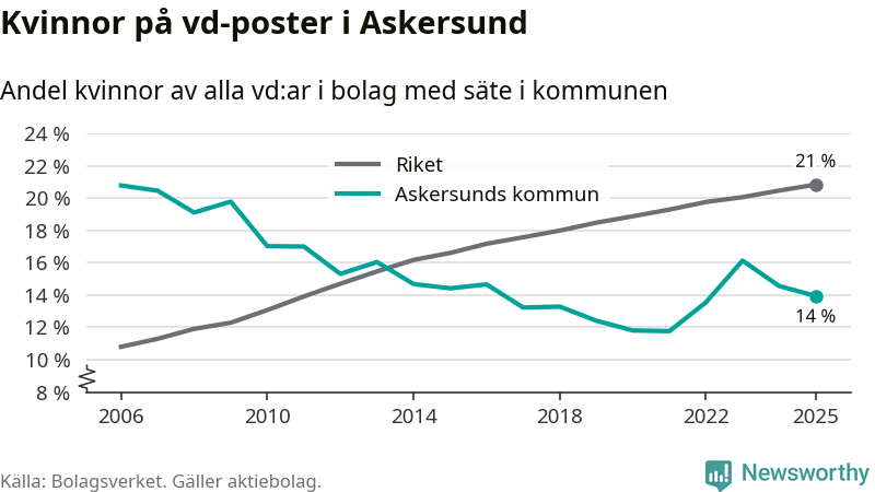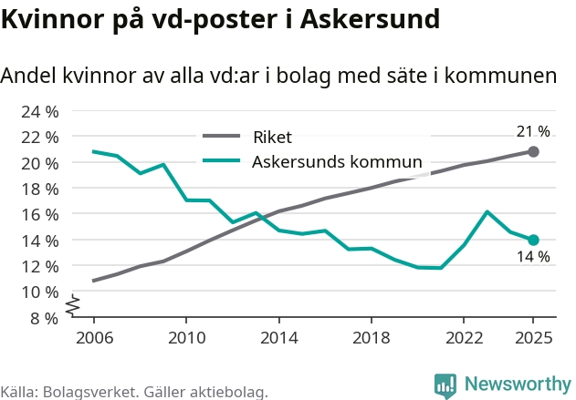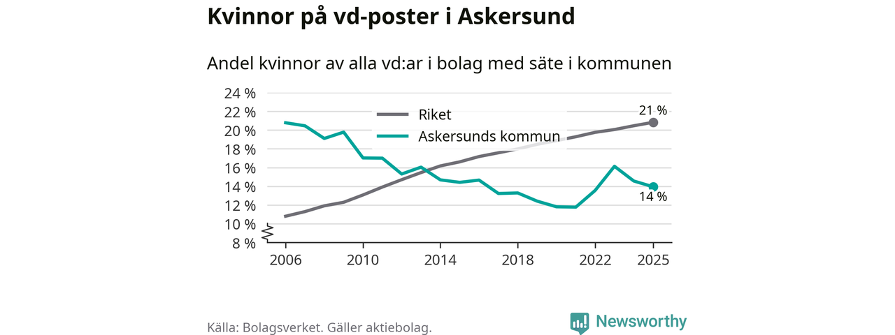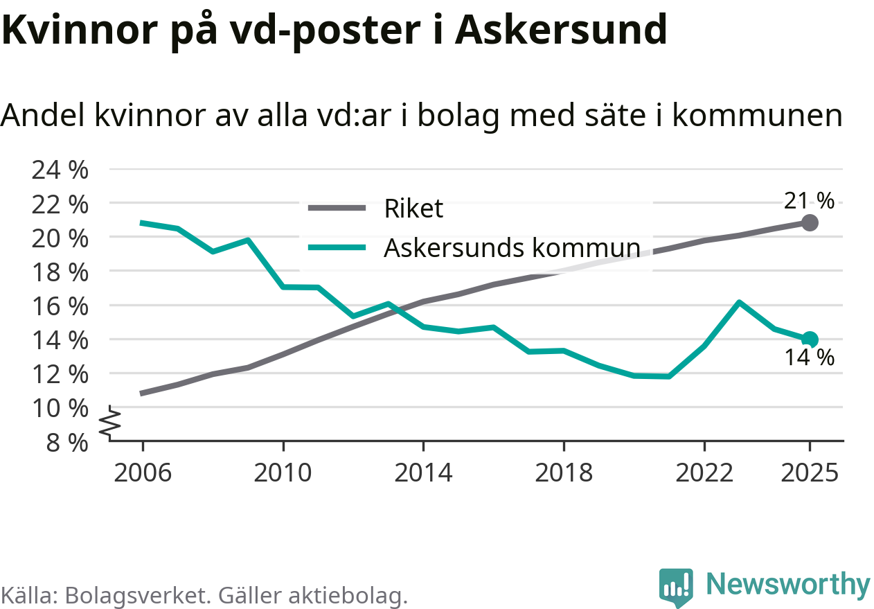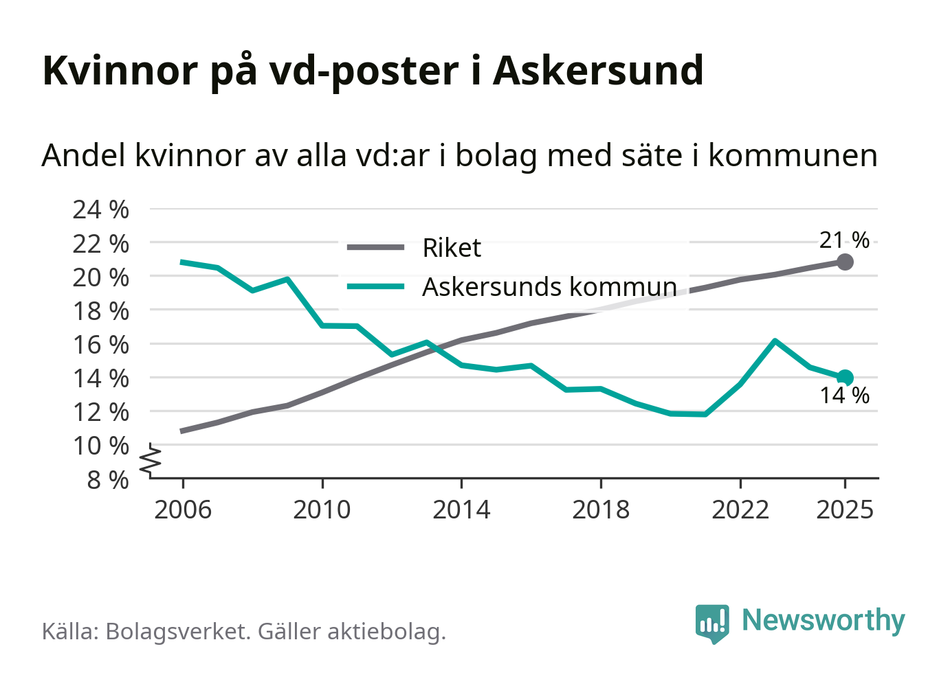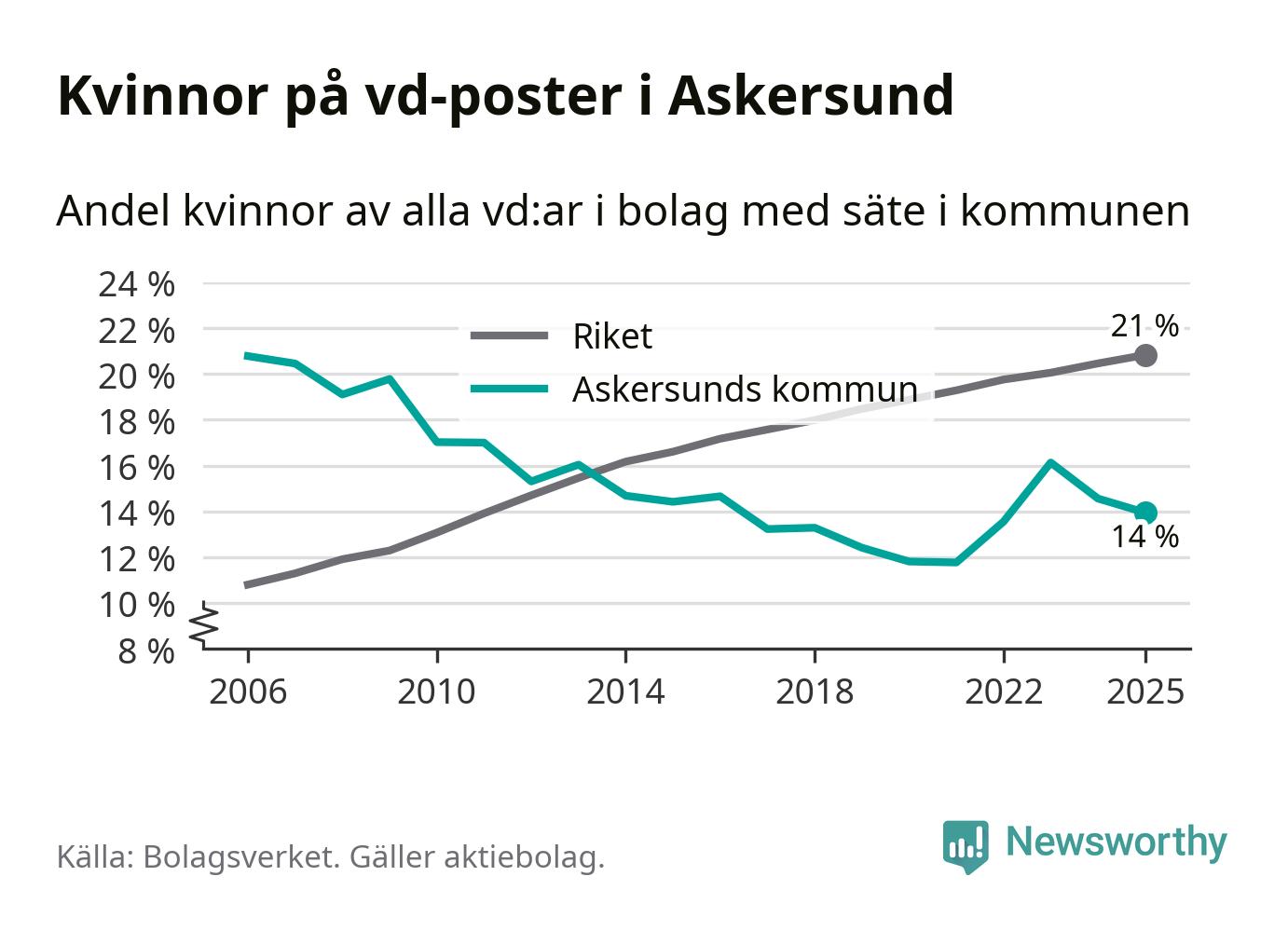 Det är fortfarande män som är vd i nästan fyra av fem bolag i Sverige och i Askersund är det alltså en lägre andel kvinnor på vd-posten. 14 procent är den näst lägsta andelen av kommunerna i Örebro län. Högst andel kvinnliga vd:ar i Örebro län har företagen med säte i Lekebergs kommun, 33 procent. Lägst är andelen bland företagen med säte i Laxå kommun, 6 procent. I både Lekeberg och Laxå rör det sig om relativt få företag totalt och även små förändringar får stora utslag i andelen kvinnliga vd:ar.