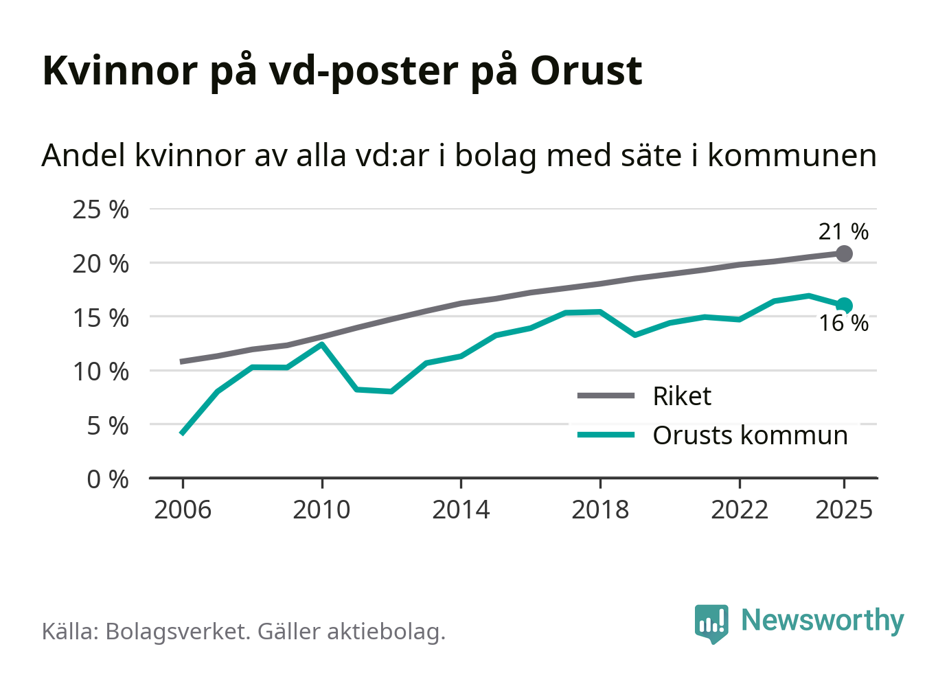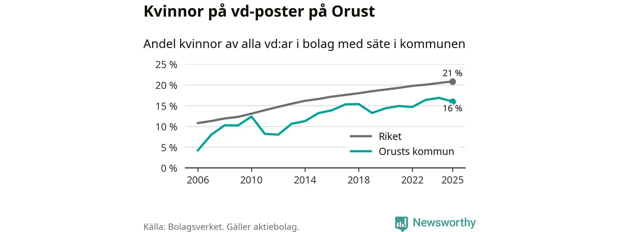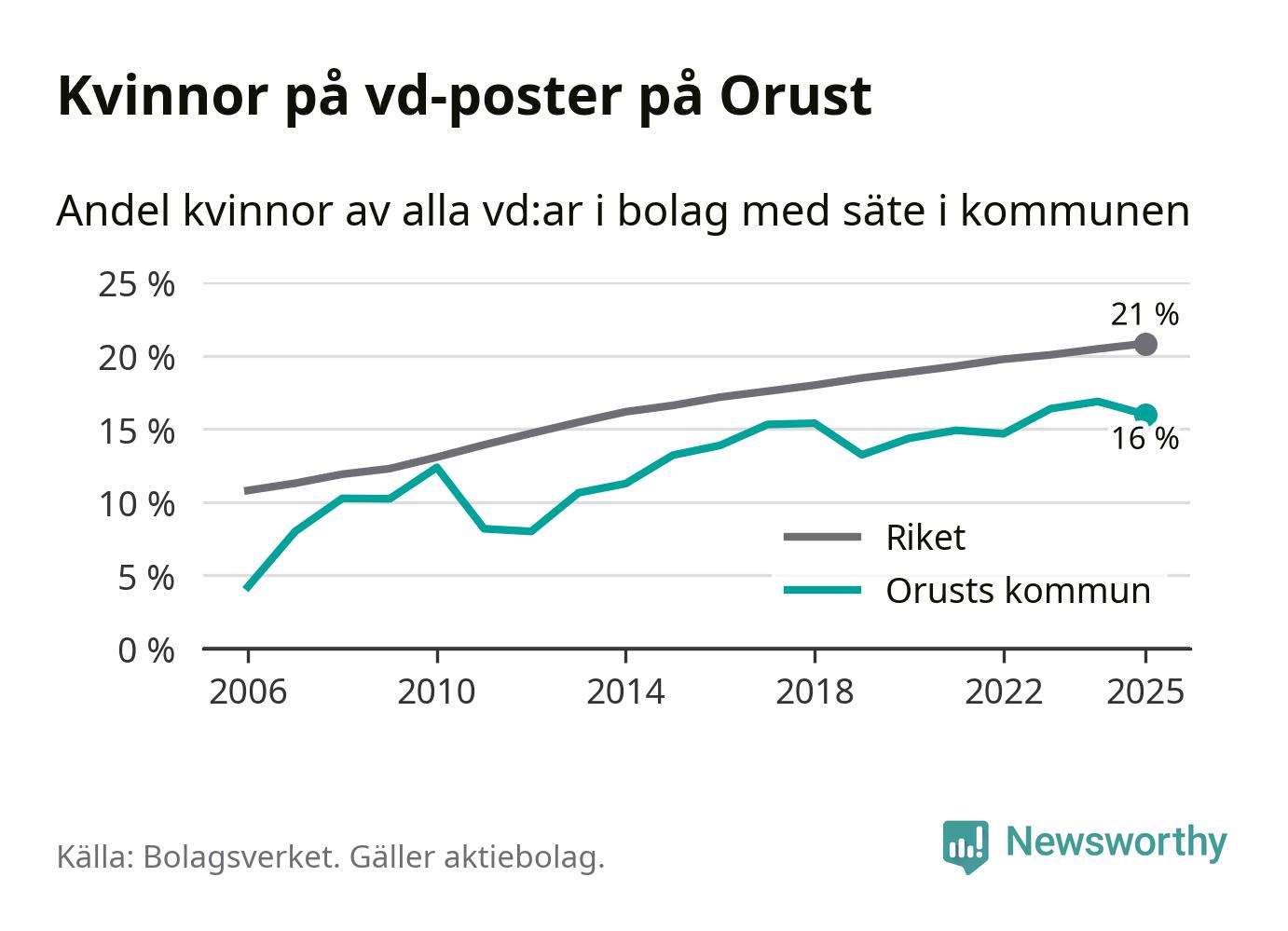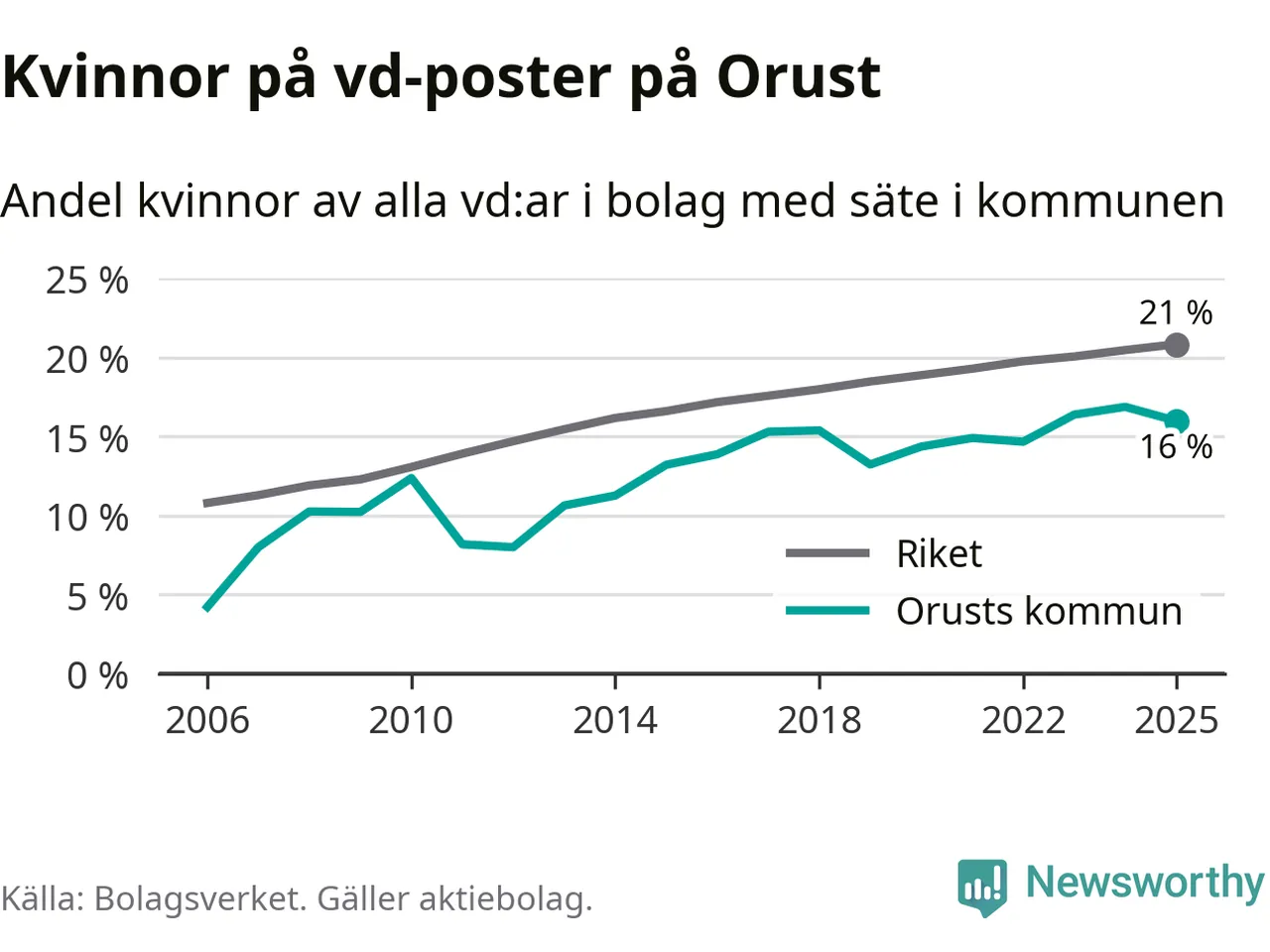 16 procent av aktiebolagen med registrerad vd på Orust hade en kvinna på posten vid årsskiftet. Det innebär att på varje kvinnlig vd går fem män.