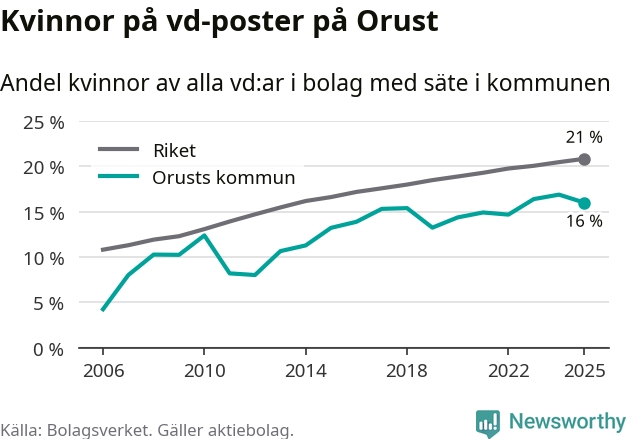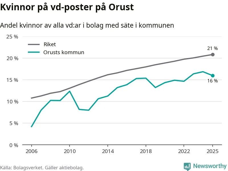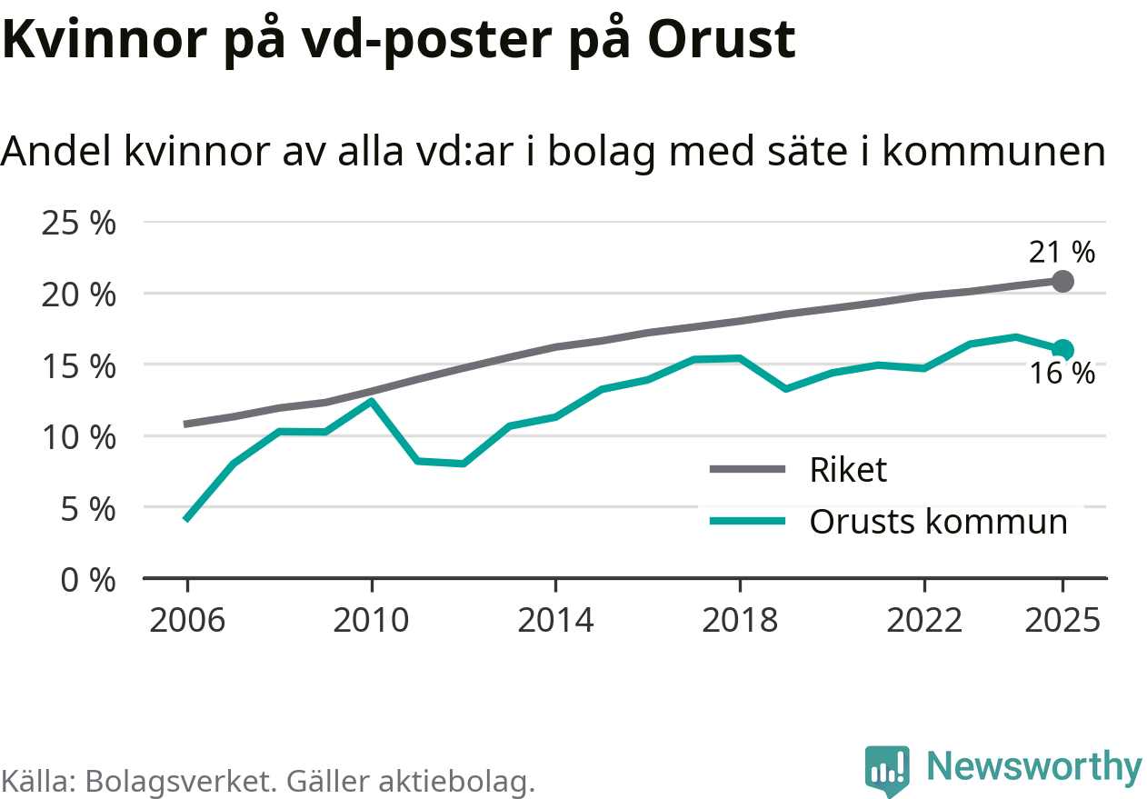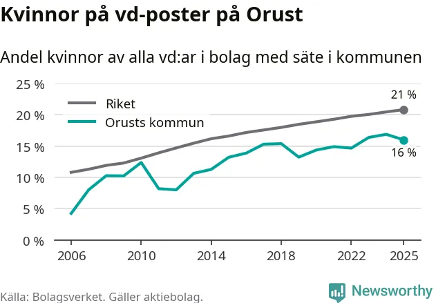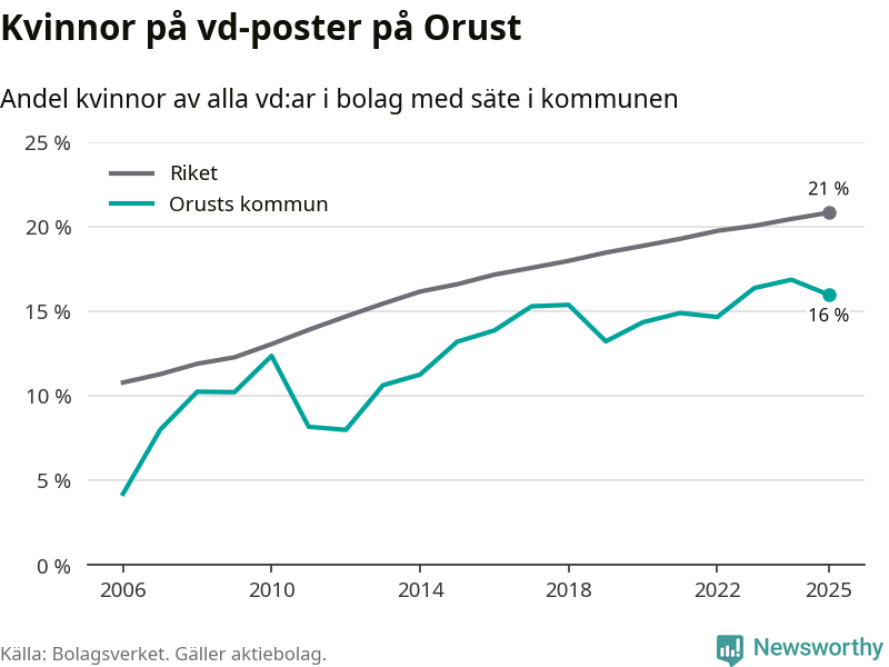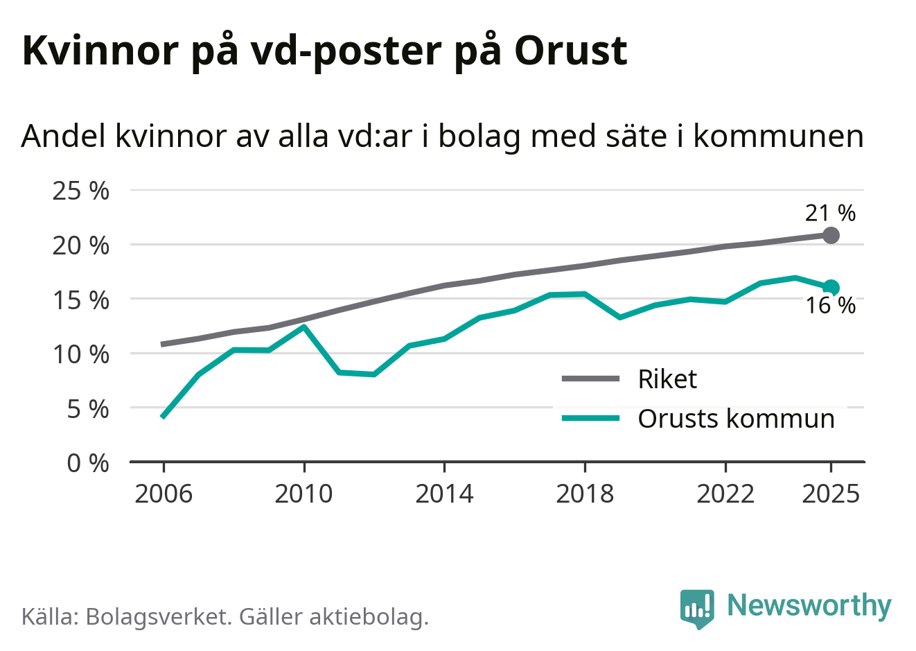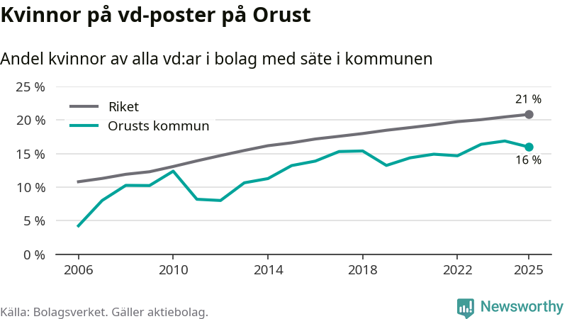16 procent av aktiebolagen med registrerad vd på Orust hade en kvinna på posten vid årsskiftet. Det innebär att på varje kvinnlig vd går fem män.