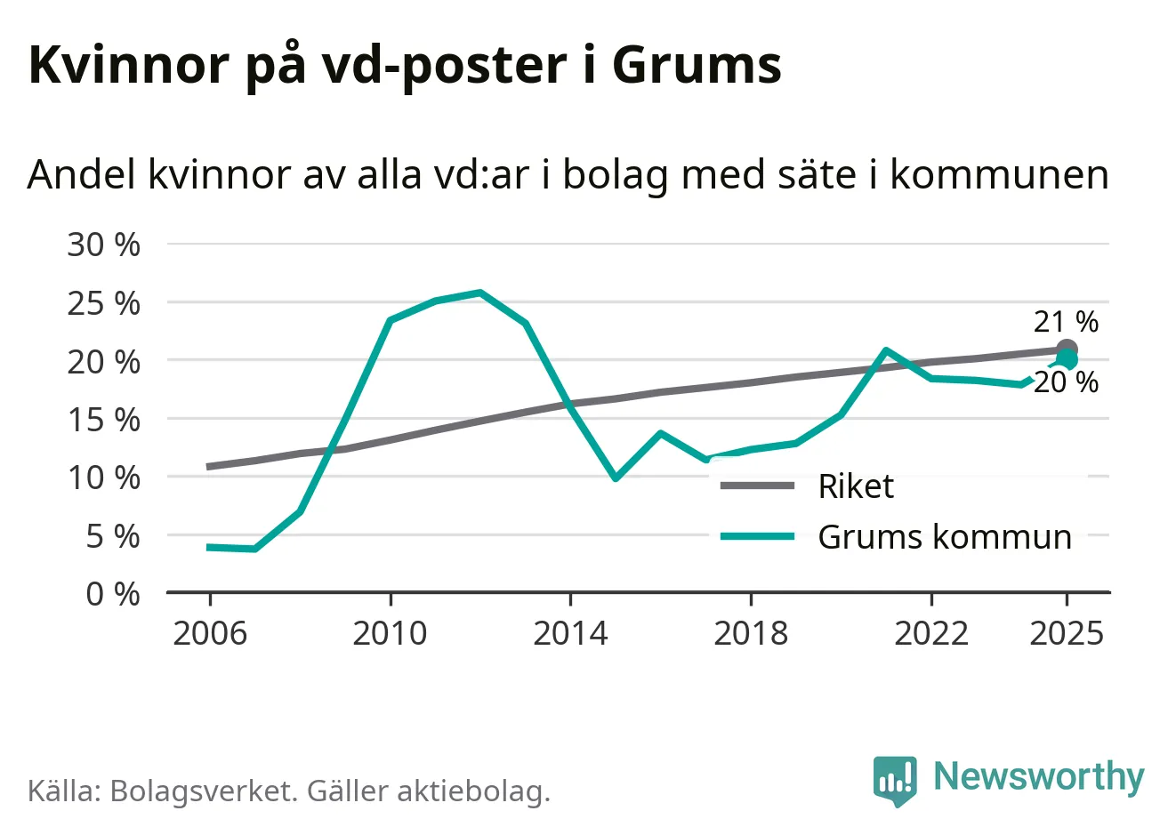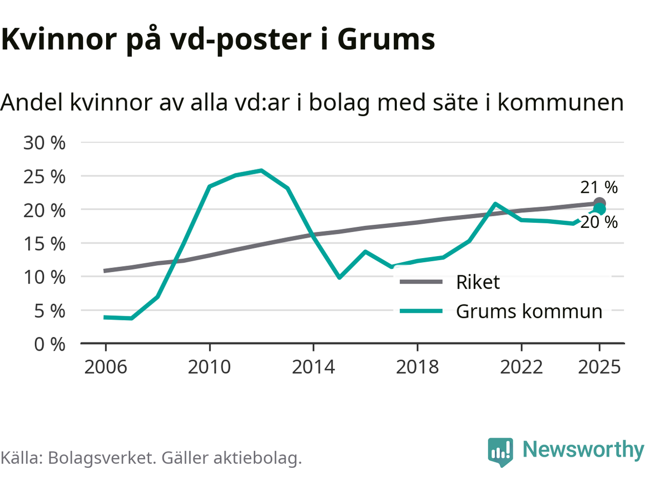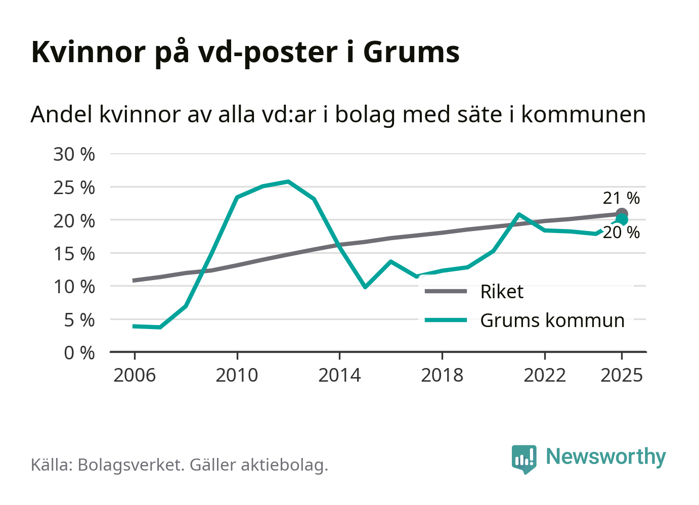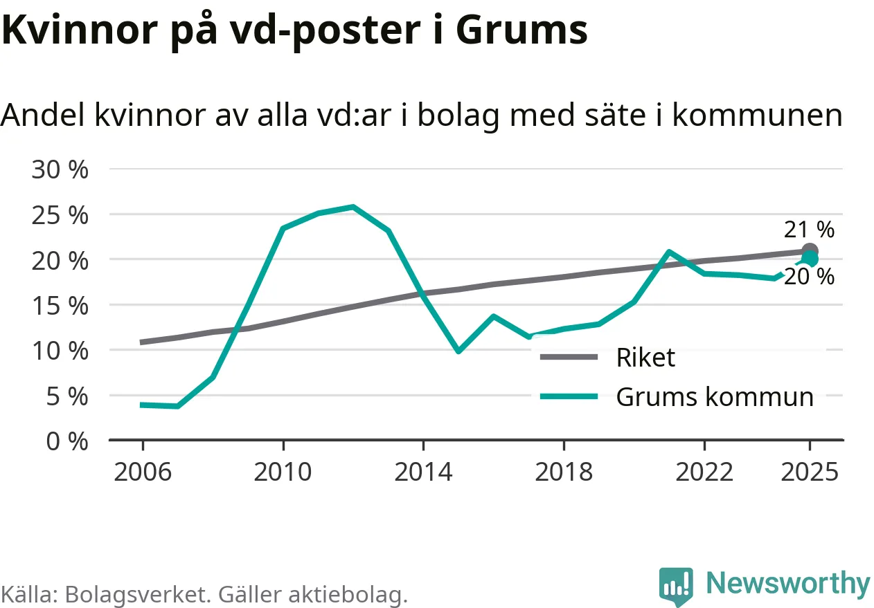 Det är fortfarande män som är vd i nästan fyra av fem bolag i Sverige och könsfördelningen alltså ser ungefär likadan ut i Grums. Högst andel kvinnliga vd:ar i Värmland har företagen med säte i Munkfors kommun, 28 procent. Lägst är andelen bland företagen med säte i Storfors kommun, 12 procent. I både Munkfors och Storfors rör det sig om relativt få företag totalt och även små förändringar får stora utslag i andelen kvinnliga vd:ar.