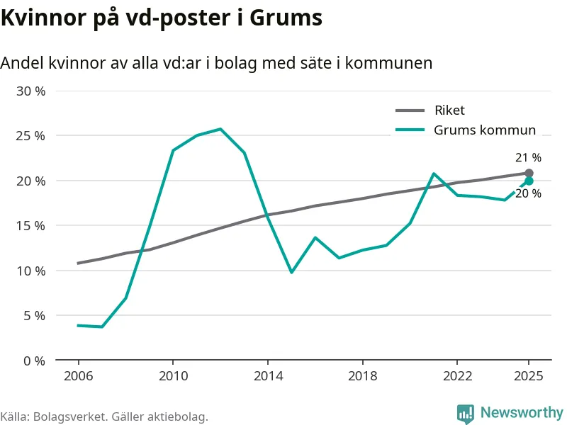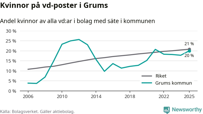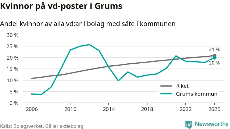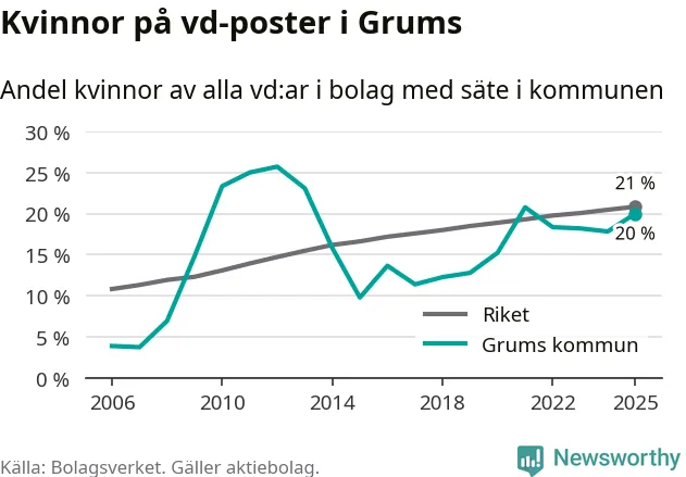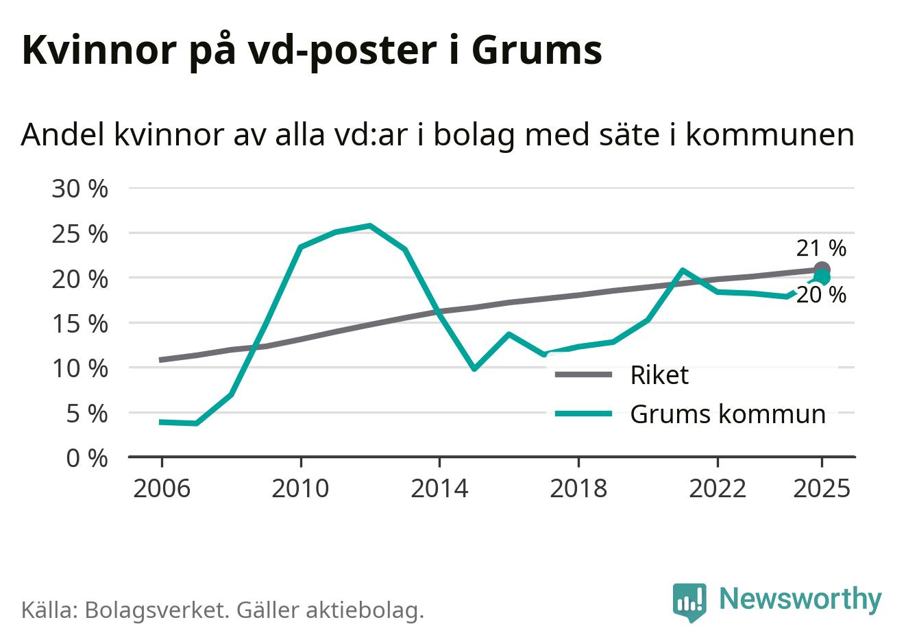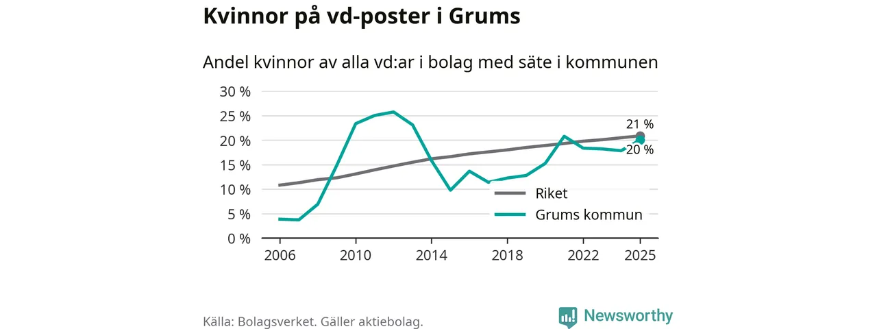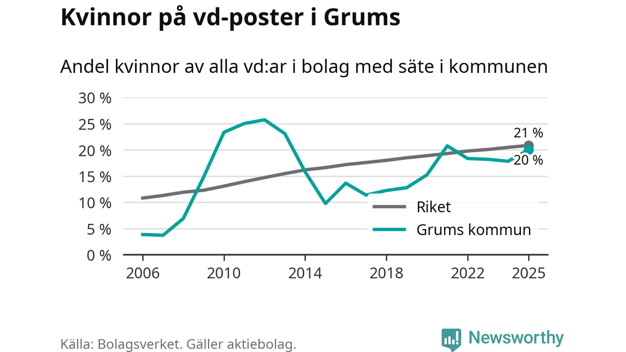Det är fortfarande män som är vd i nästan fyra av fem bolag i Sverige och könsfördelningen alltså ser ungefär likadan ut i Grums. Högst andel kvinnliga vd:ar i Värmland har företagen med säte i Munkfors kommun, 28 procent. Lägst är andelen bland företagen med säte i Storfors kommun, 12 procent. I både Munkfors och Storfors rör det sig om relativt få företag totalt och även små förändringar får stora utslag i andelen kvinnliga vd:ar.