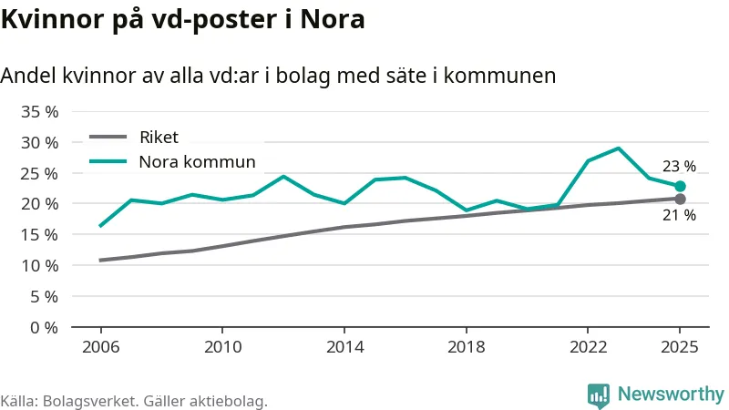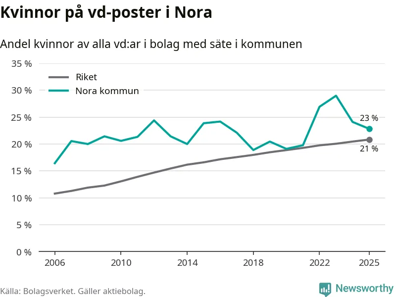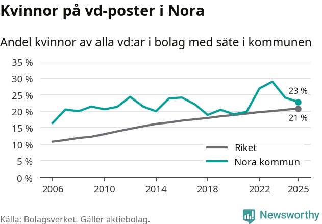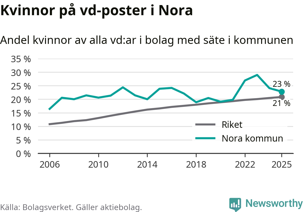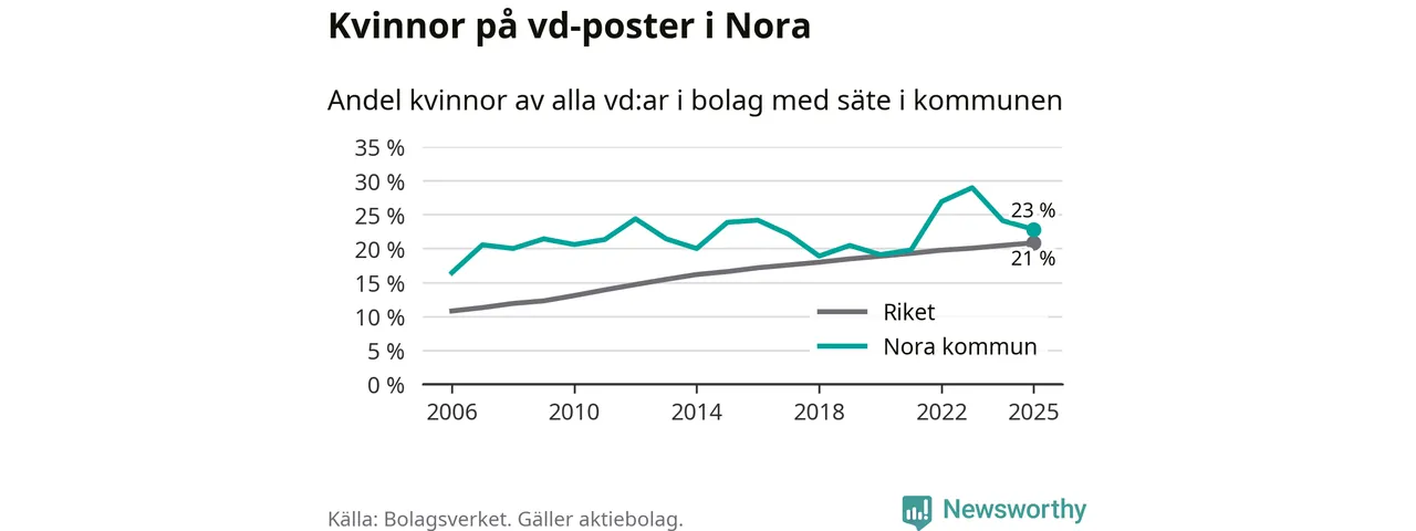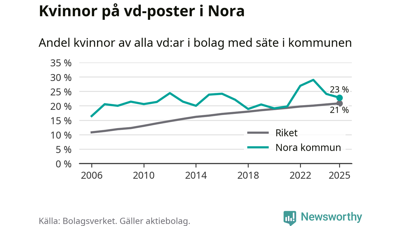 Det är fortfarande män som är vd i nästan fyra av fem bolag i Sverige och könsfördelningen alltså ser ungefär likadan ut i Nora. 23 procent är den näst högsta andelen av kommunerna i Örebro län. Högst andel kvinnliga vd:ar i Örebro län har företagen med säte i Lekebergs kommun, 33 procent. Lägst är andelen bland företagen med säte i Laxå kommun, 6 procent. I både Lekeberg och Laxå rör det sig om relativt få företag totalt och även små förändringar får stora utslag i andelen kvinnliga vd:ar.