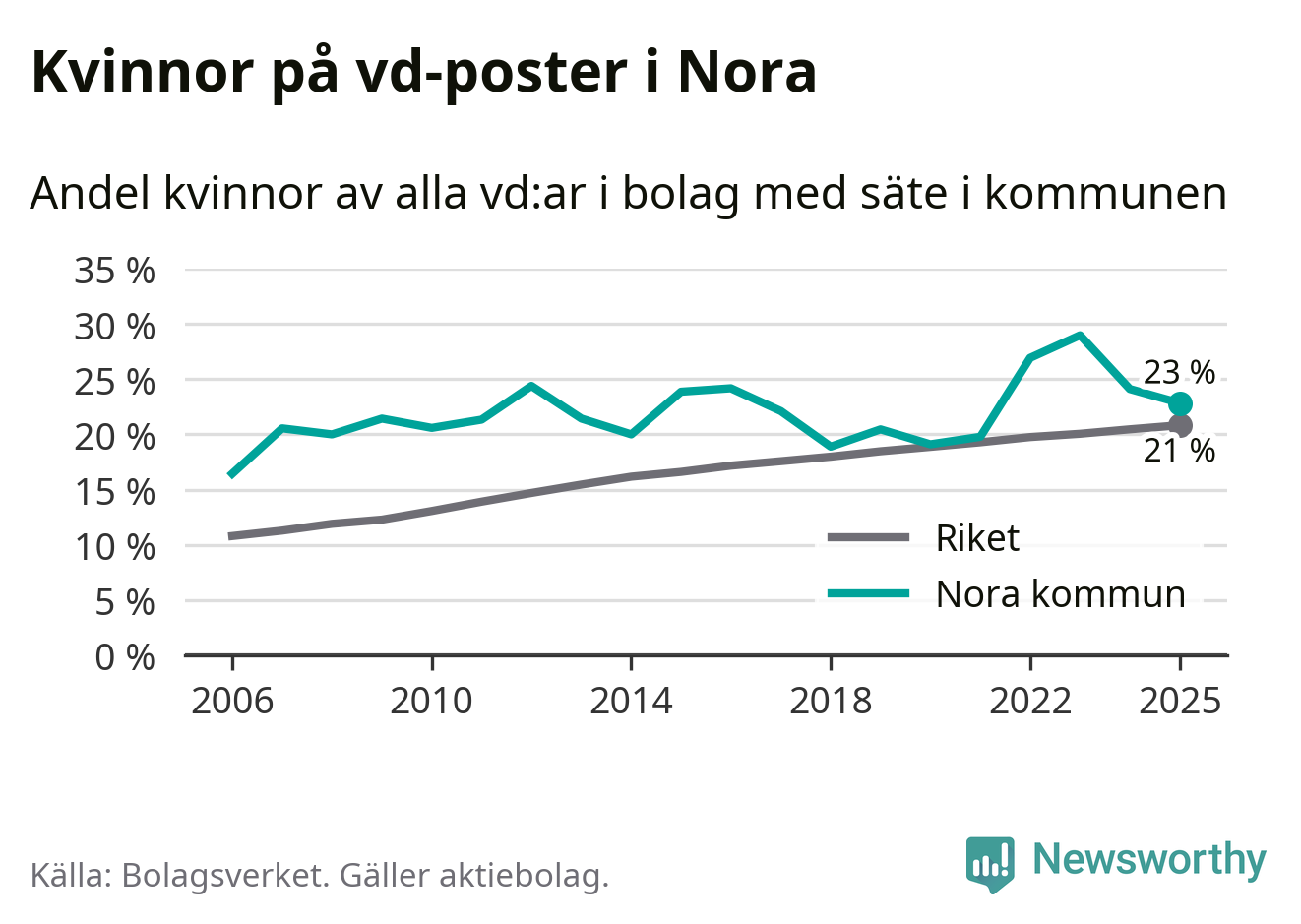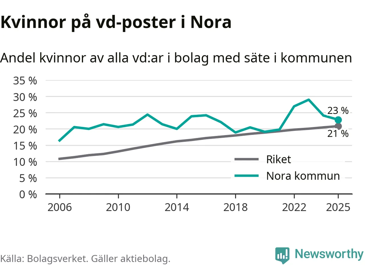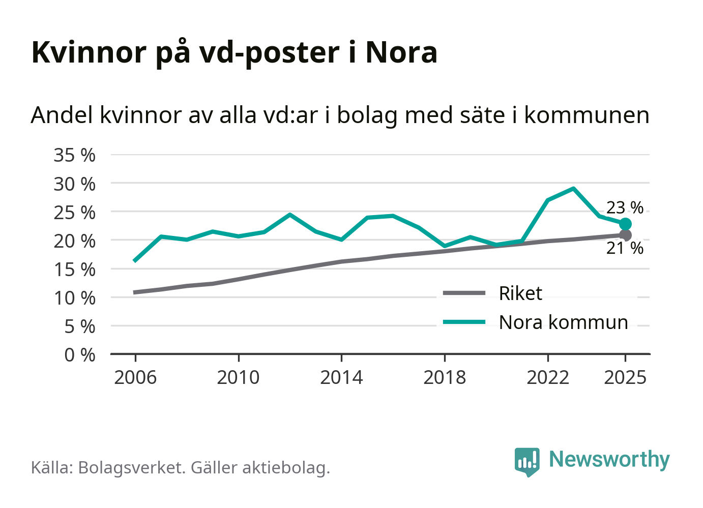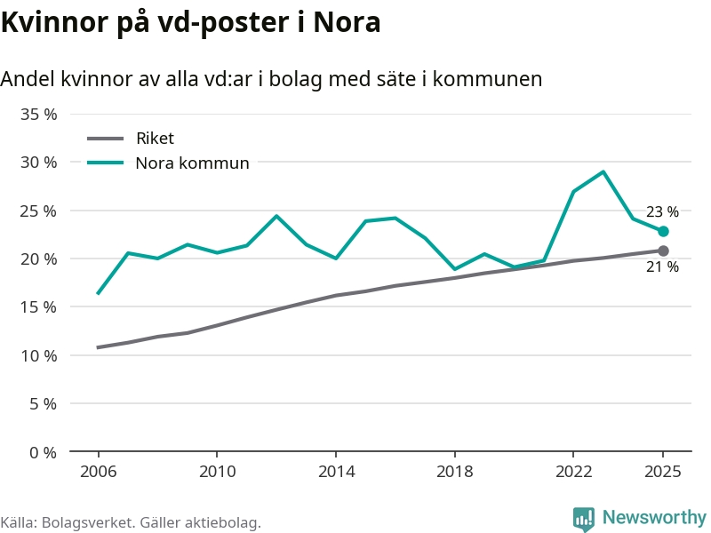 Det är fortfarande män som är vd i nästan fyra av fem bolag i Sverige och könsfördelningen alltså ser ungefär likadan ut i Nora. 23 procent är den näst högsta andelen av kommunerna i Örebro län. Högst andel kvinnliga vd:ar i Örebro län har företagen med säte i Lekebergs kommun, 33 procent. Lägst är andelen bland företagen med säte i Laxå kommun, 6 procent. I både Lekeberg och Laxå rör det sig om relativt få företag totalt och även små förändringar får stora utslag i andelen kvinnliga vd:ar.