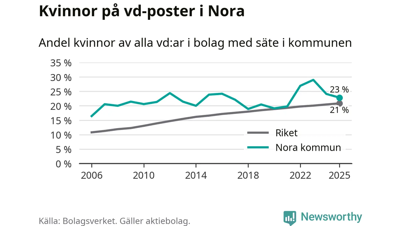 23 procent av aktiebolagen med registrerad vd i Nora hade en kvinna på posten vid årsskiftet. Det innebär att på varje kvinnlig vd går tre män.