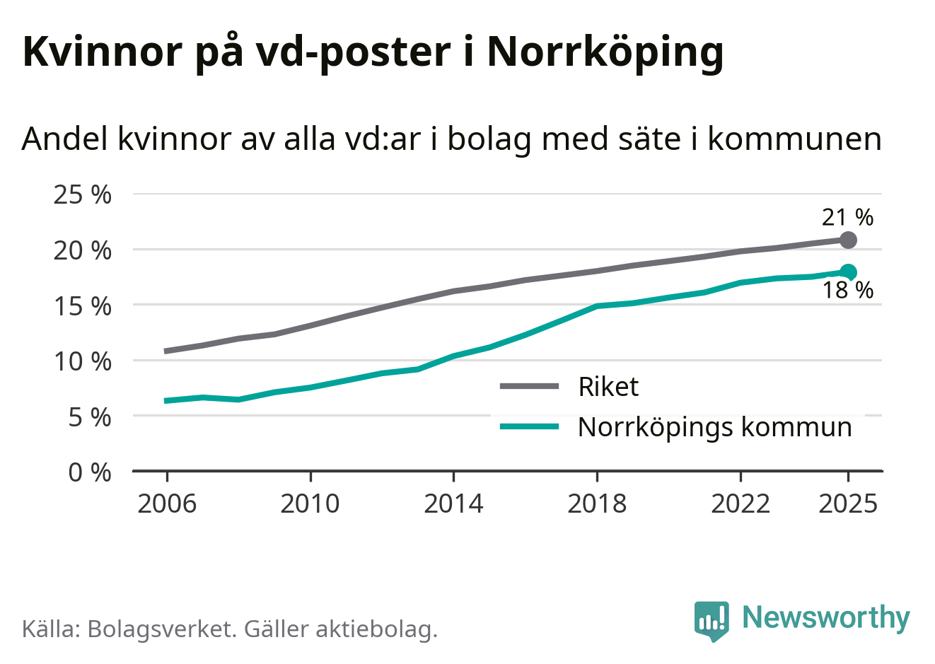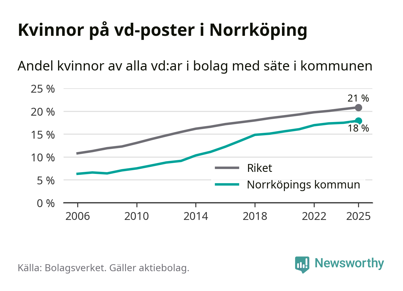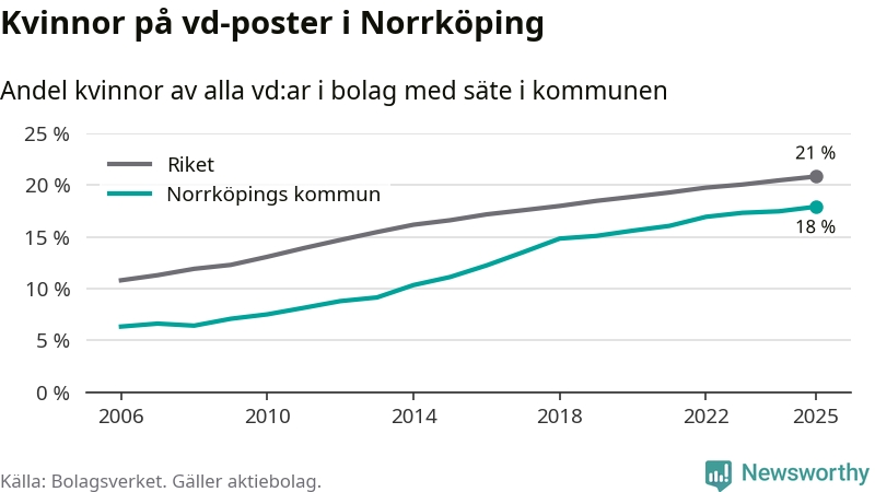 Bara var femte svenskt aktiebolag leds av en kvinna. I Norrköping är andelen ännu lägre. Det visar siffror från Bolagsverket.
