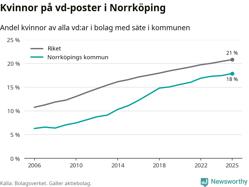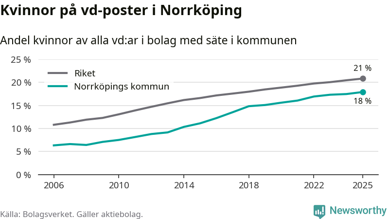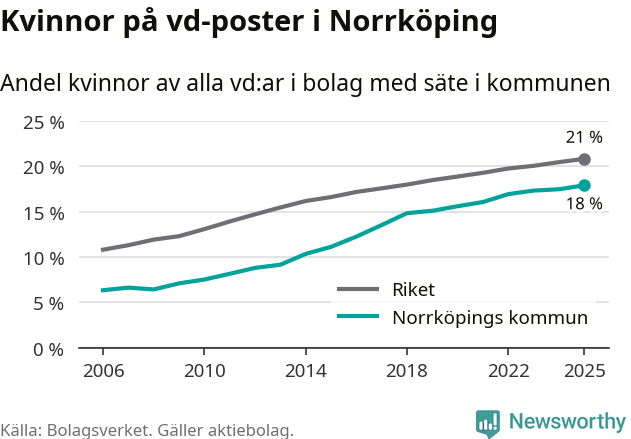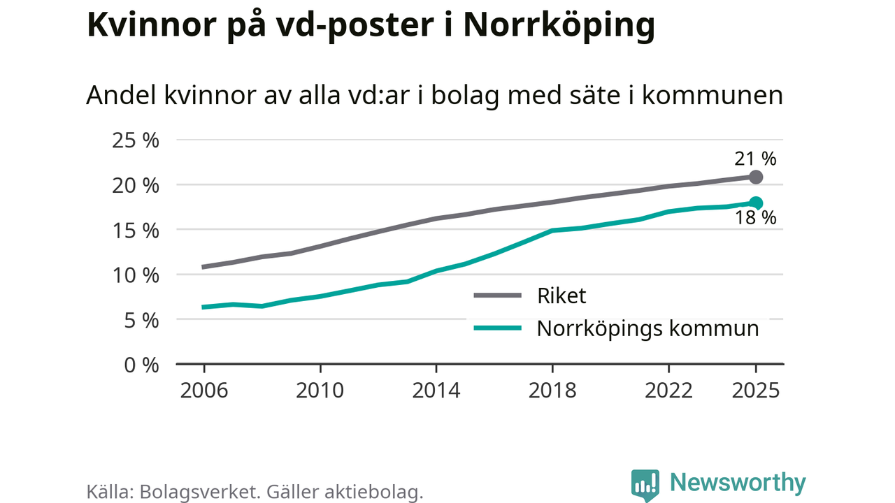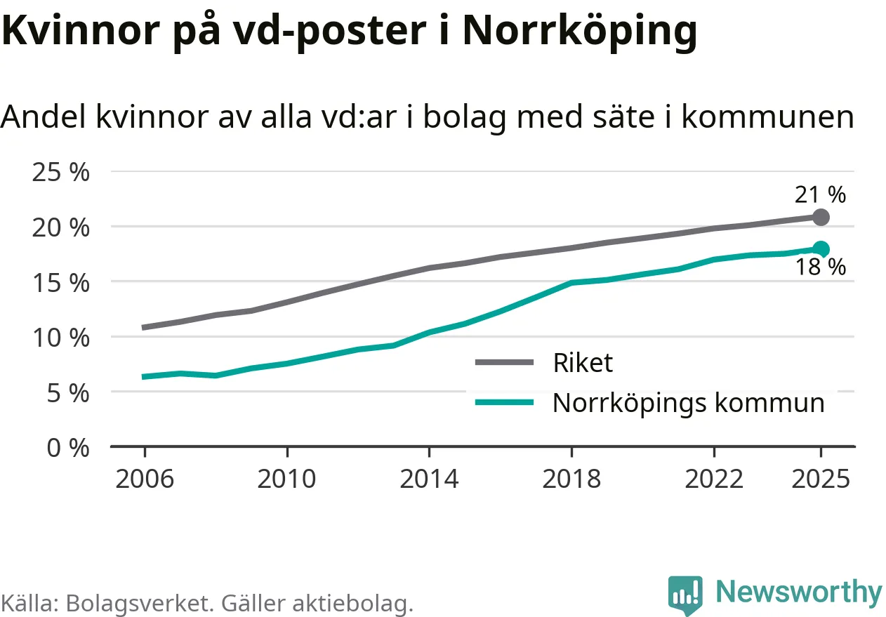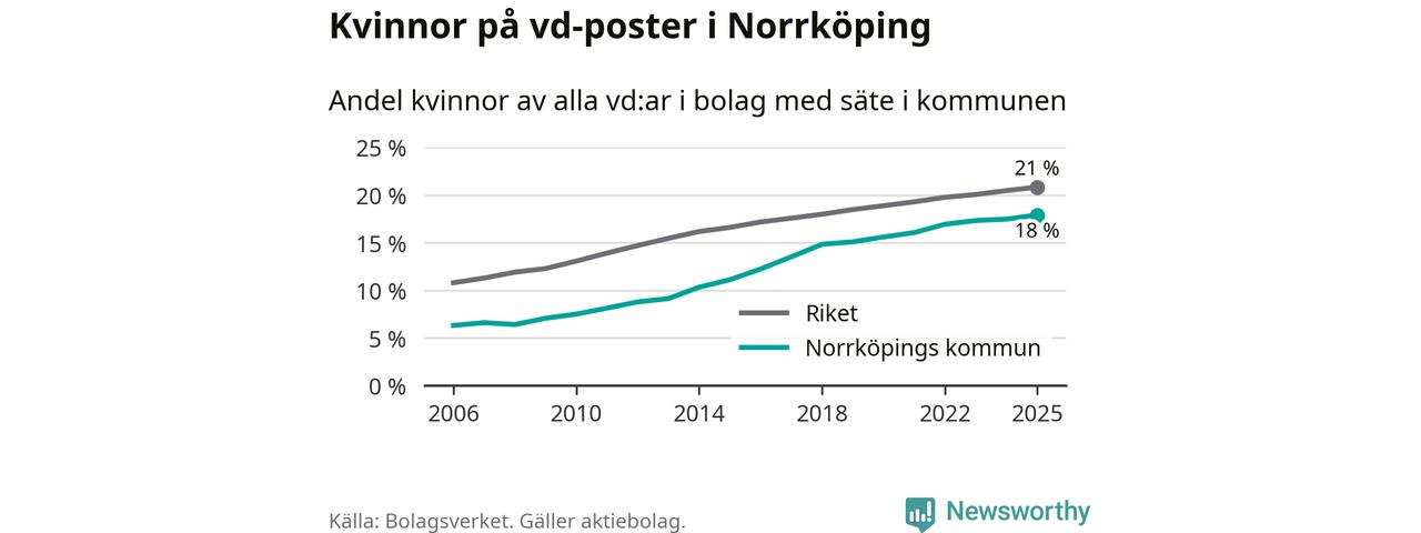 Det är fortfarande män som är vd i nästan fyra av fem bolag i Sverige och i Norrköping är det alltså en lägre andel kvinnor på vd-posten. Högst andel kvinnliga vd:ar i Östergötland har företagen med säte i Vadstena kommun, 26 procent. Lägst är andelen bland företagen med säte i Boxholms kommun, 13 procent. I Boxholm rör det sig om 53 företag totalt och även små förändringar får stora utslag i andelen kvinnliga vd:ar.