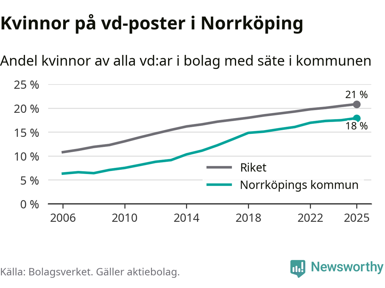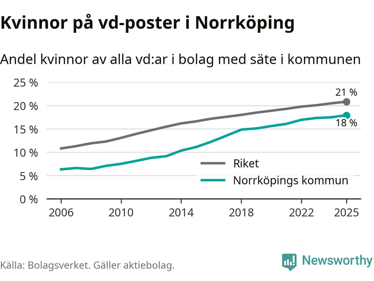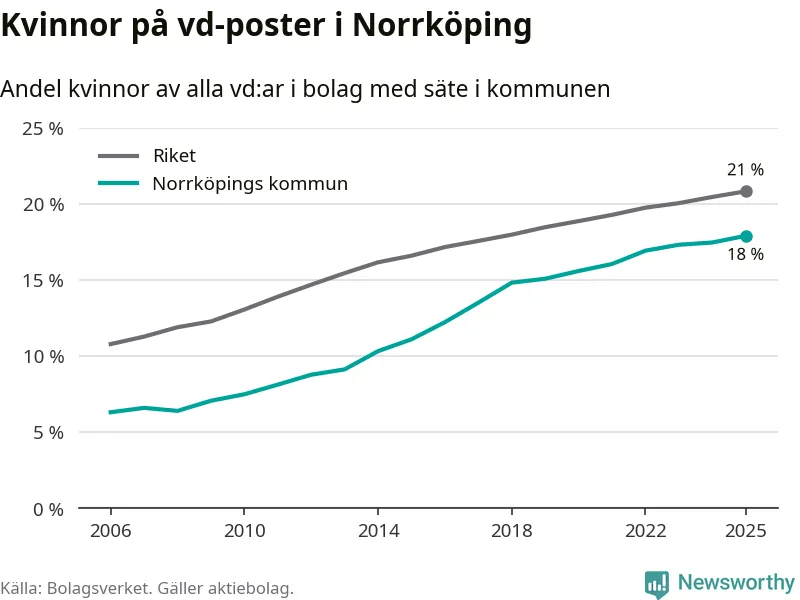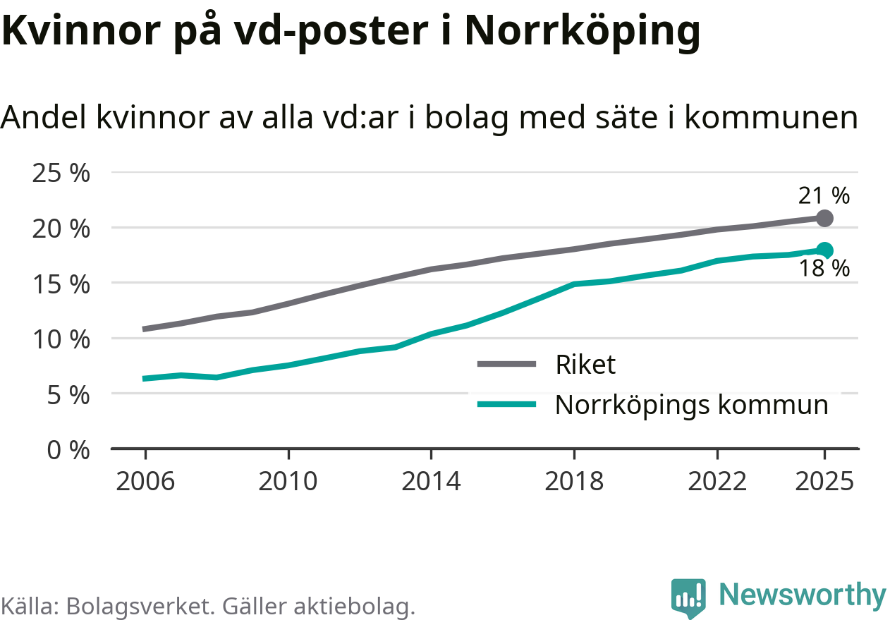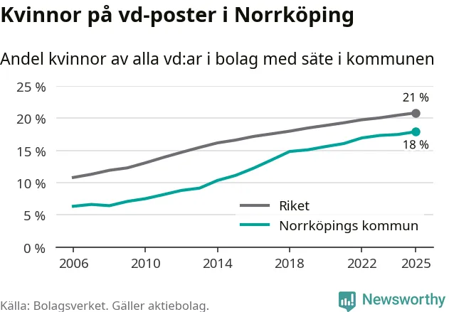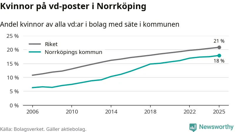 18 procent av aktiebolagen med registrerad vd i Norrköping hade en kvinna på posten vid årsskiftet. Det innebär att på varje kvinnlig vd går mer än fyra män.