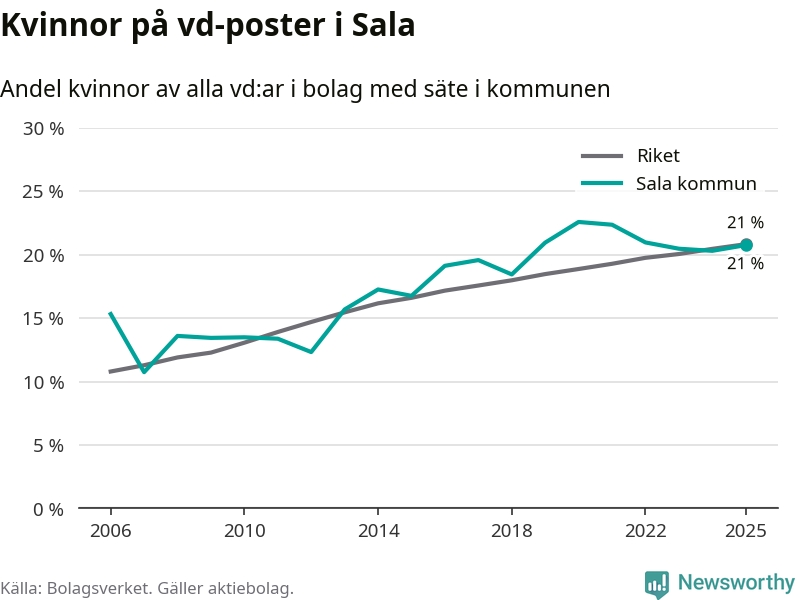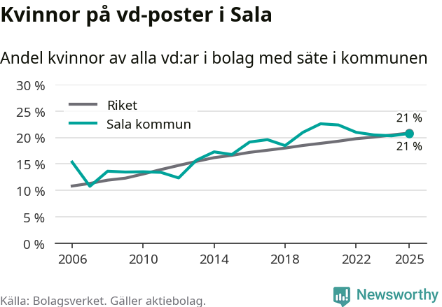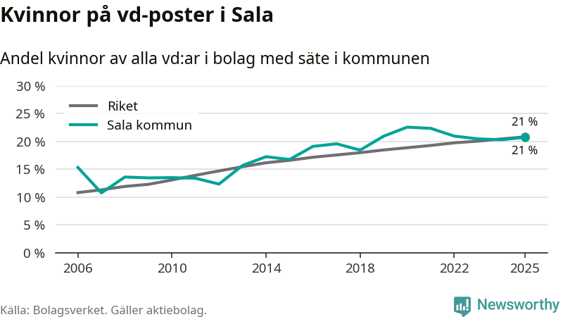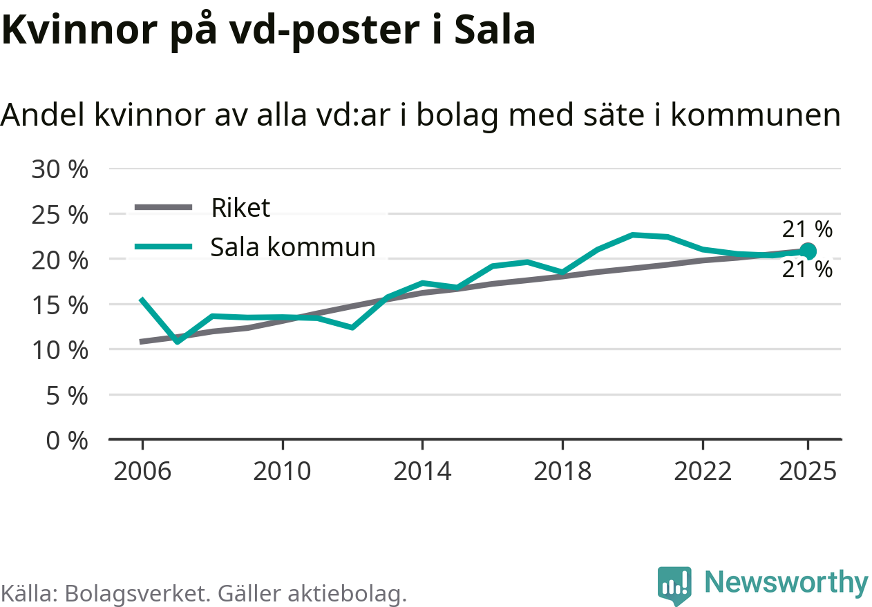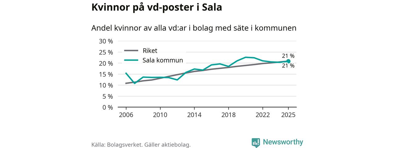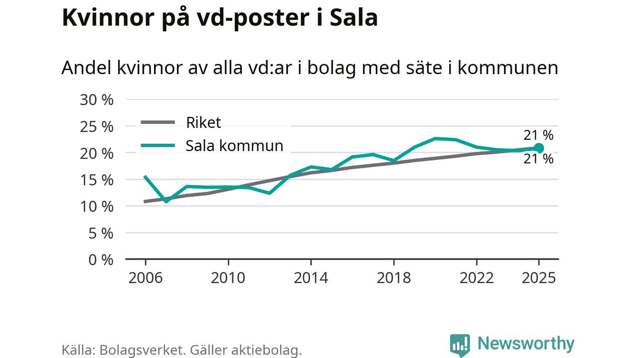 Det är fortfarande män som är vd i nästan fyra av fem bolag i Sverige och könsfördelningen alltså ser ungefär likadan ut i Sala. Högst andel kvinnliga vd:ar i Västmanland har företagen med säte i Skinnskattebergs kommun, 27 procent. Där rör det sig dock om relativt få företag – 51 stycken totalt – och även små förändringar får stora utslag i andelen kvinnliga vd:ar. Lägst är andelen bland företagen med säte i Fagersta kommun, 11 procent.