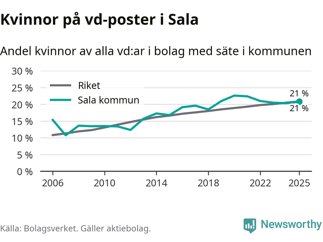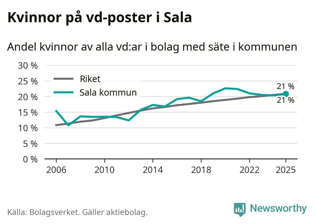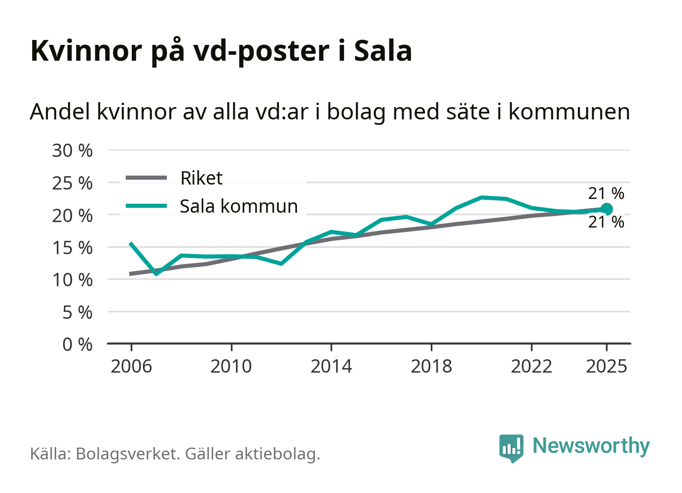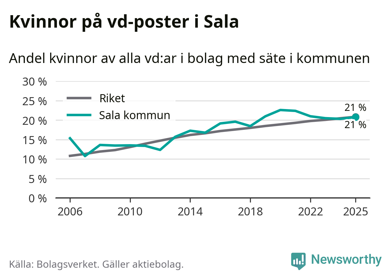 Det är fortfarande män som är vd i nästan fyra av fem bolag i Sverige och könsfördelningen alltså ser ungefär likadan ut i Sala. Högst andel kvinnliga vd:ar i Västmanland har företagen med säte i Skinnskattebergs kommun, 27 procent. Där rör det sig dock om relativt få företag – 51 stycken totalt – och även små förändringar får stora utslag i andelen kvinnliga vd:ar. Lägst är andelen bland företagen med säte i Fagersta kommun, 11 procent.