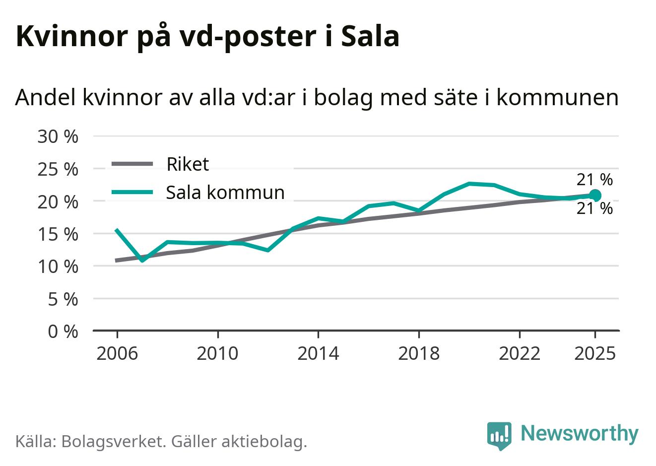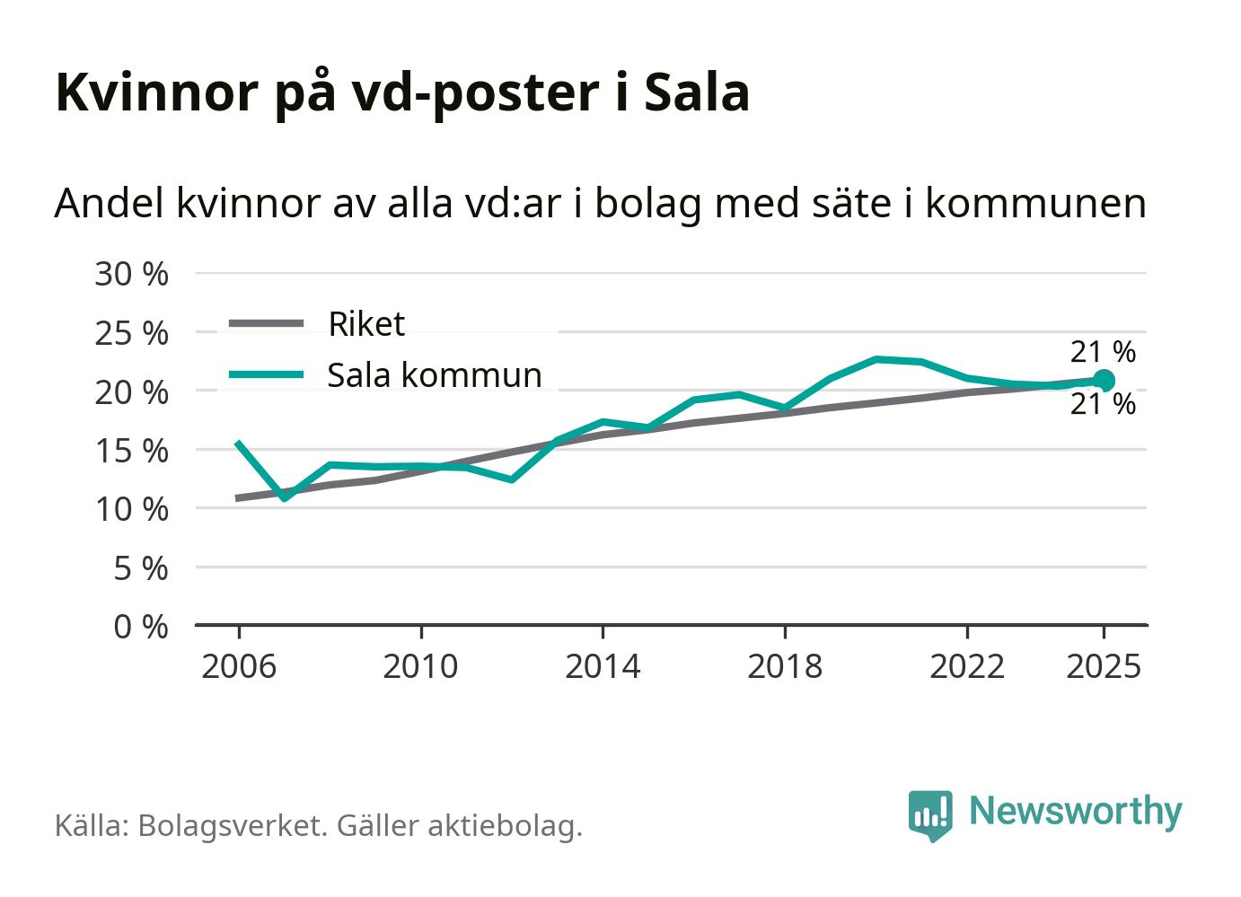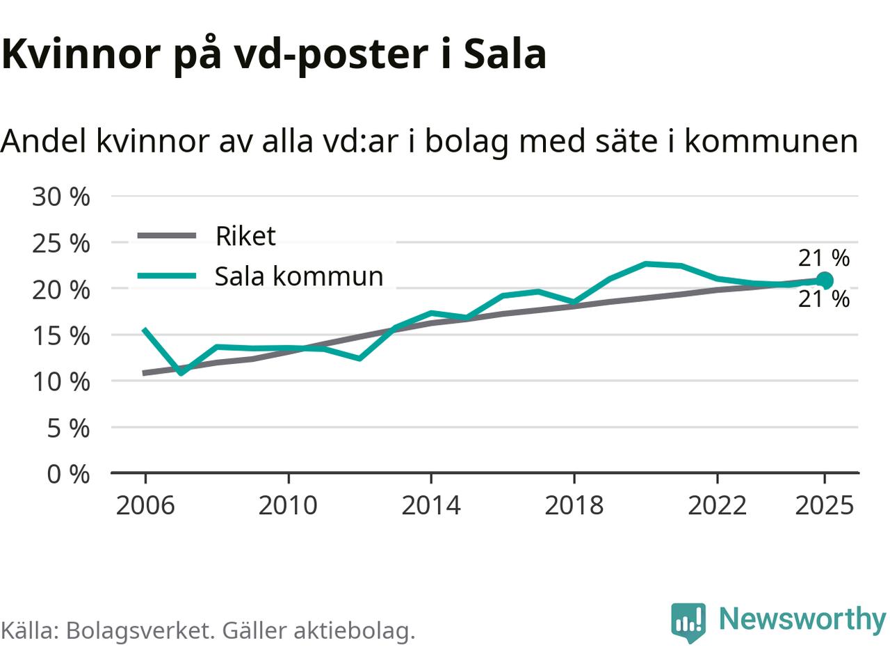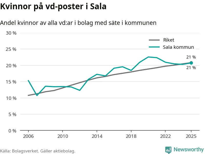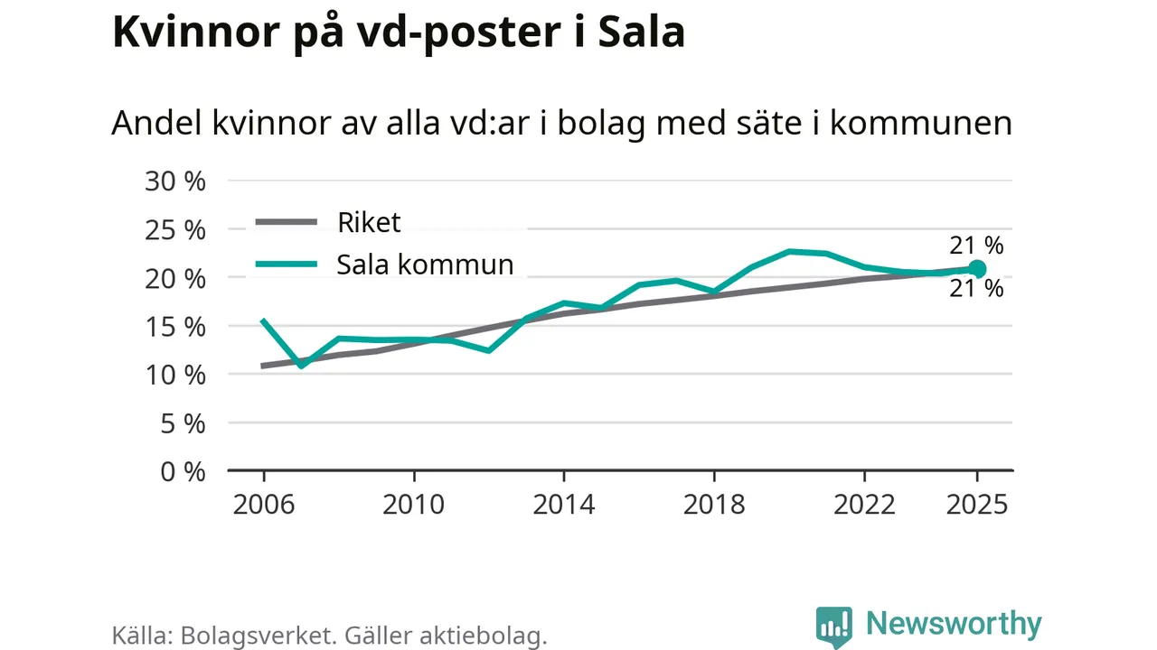 21 procent av aktiebolagen med registrerad vd i Sala hade en kvinna på posten vid årsskiftet. Det innebär att på varje kvinnlig vd går fyra män.