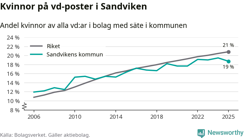 Det är fortfarande män som är vd i nästan fyra av fem bolag i Sverige och i Sandviken är det alltså en något lägre andel kvinnor på vd-posten. Högst andel kvinnliga vd:ar i Gävleborg har företagen med säte i Ljusdals kommun, 22 procent. Lägst är andelen bland företagen med säte i Bollnäs kommun, 15 procent.