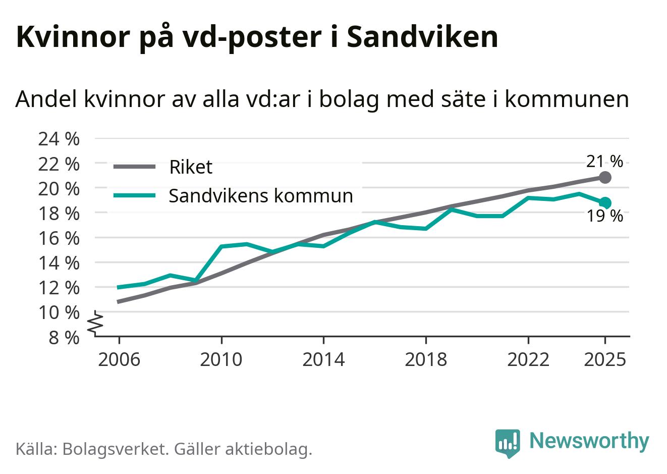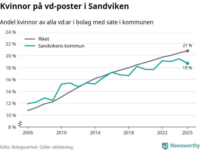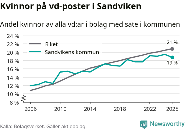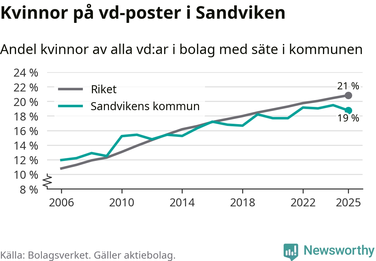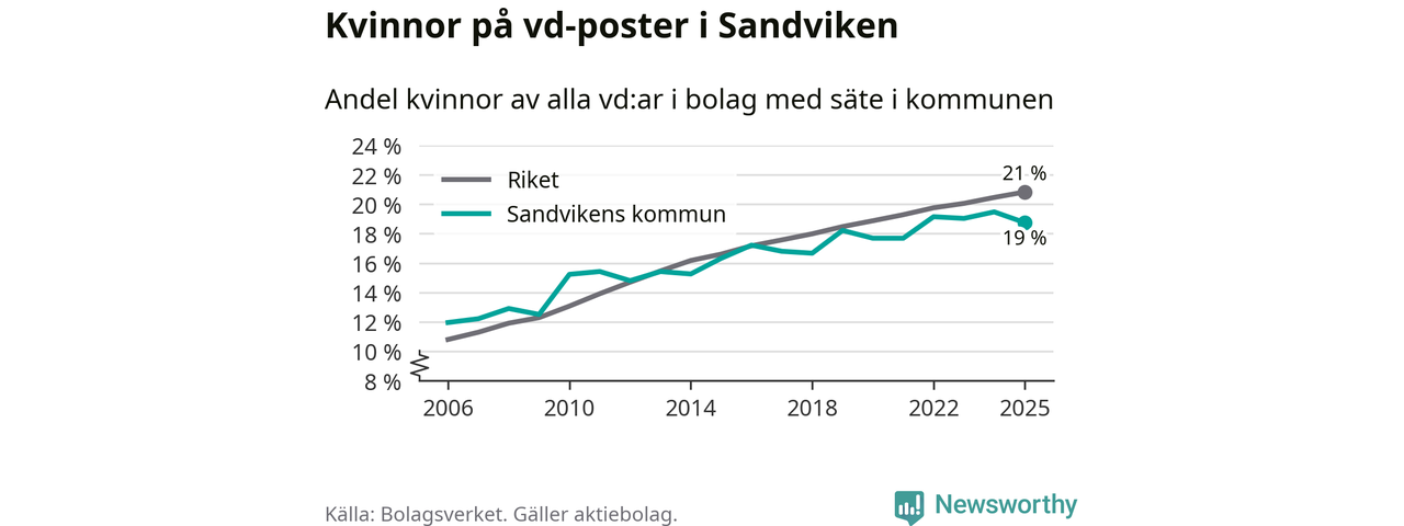 Delar man upp vd:arna i Sandviken efter ålder är andelen kvinnor högre bland dem under 50 år. Där är 21 procent kvinnor, jämfört med 17 procent i den äldre gruppen. I riket som helhet är 22 procent av vd:arna som är under 50 år kvinnor, medan motsvarande siffra för direktörerna som är äldre är 20 procent.