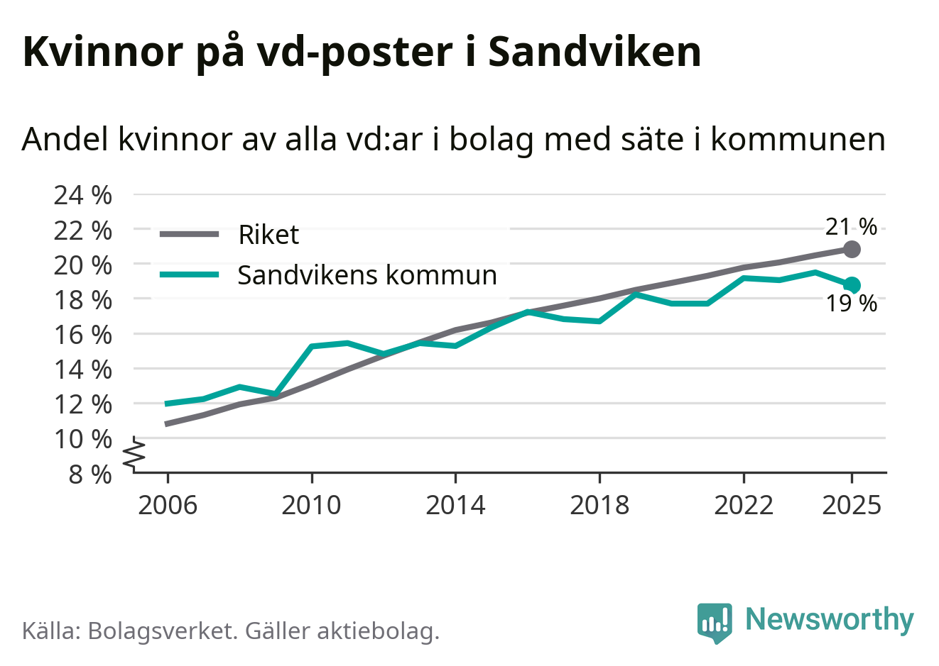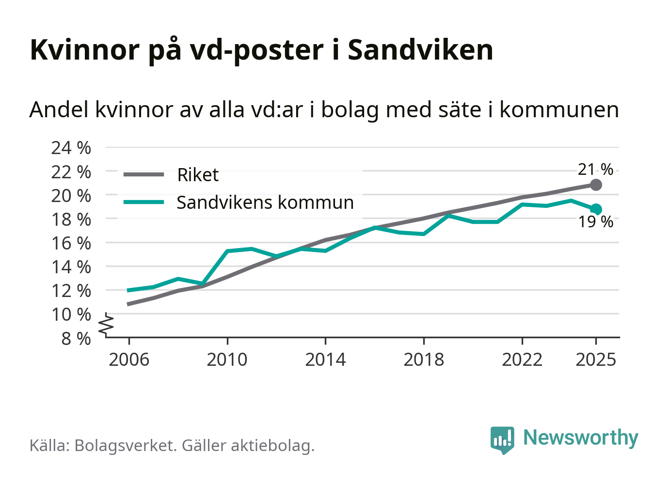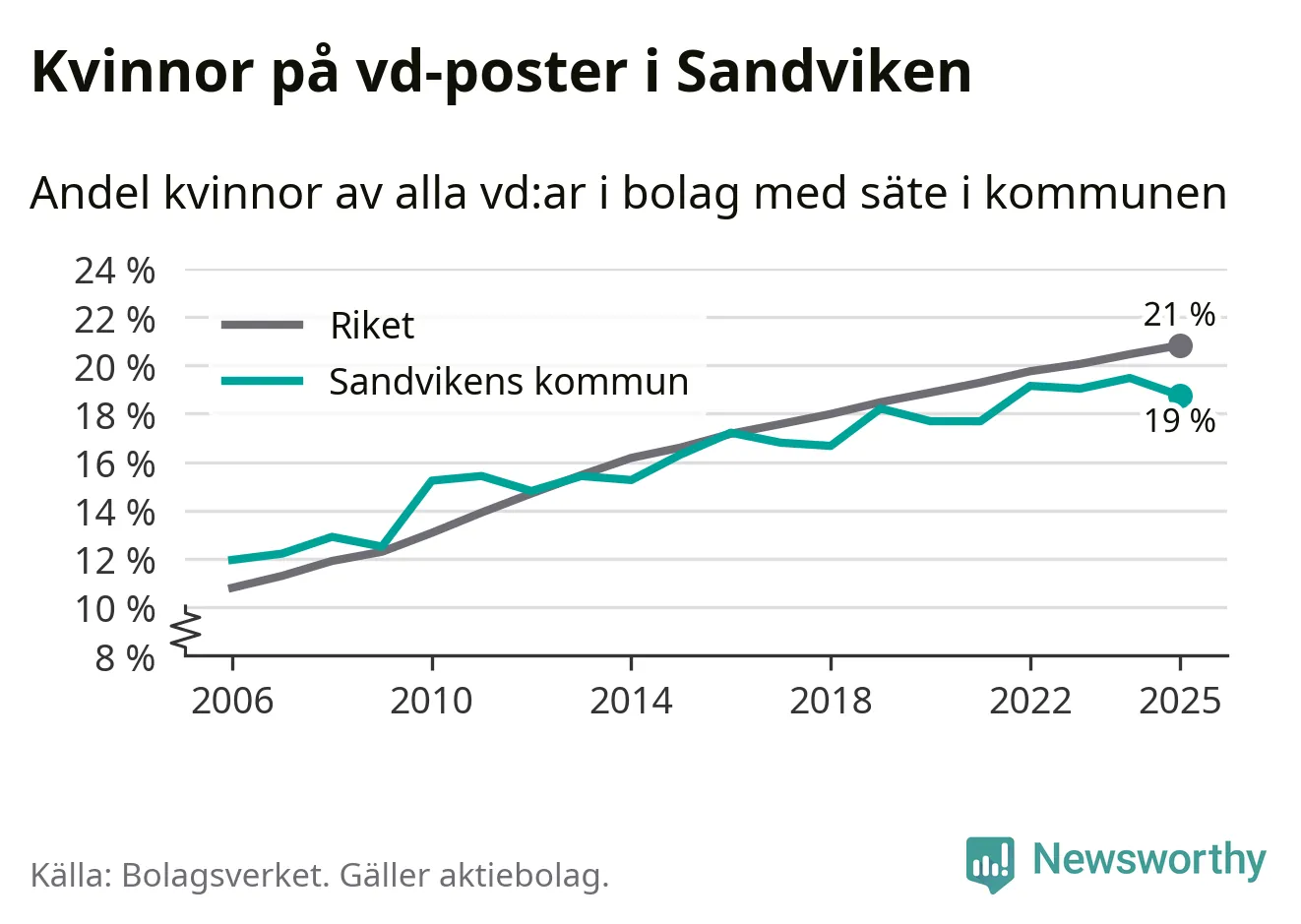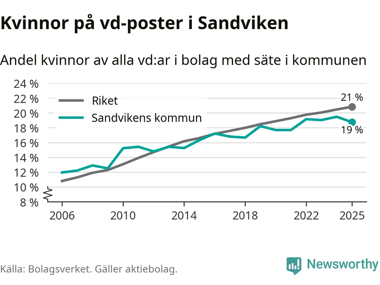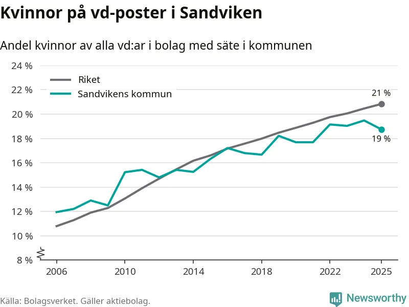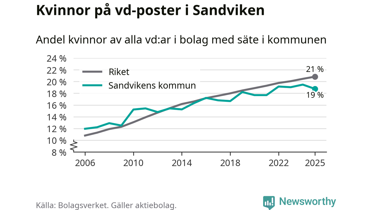 Bara var femte svenskt aktiebolag leds av en kvinna. I Sandviken är andelen ännu lägre. Det visar siffror från Bolagsverket.